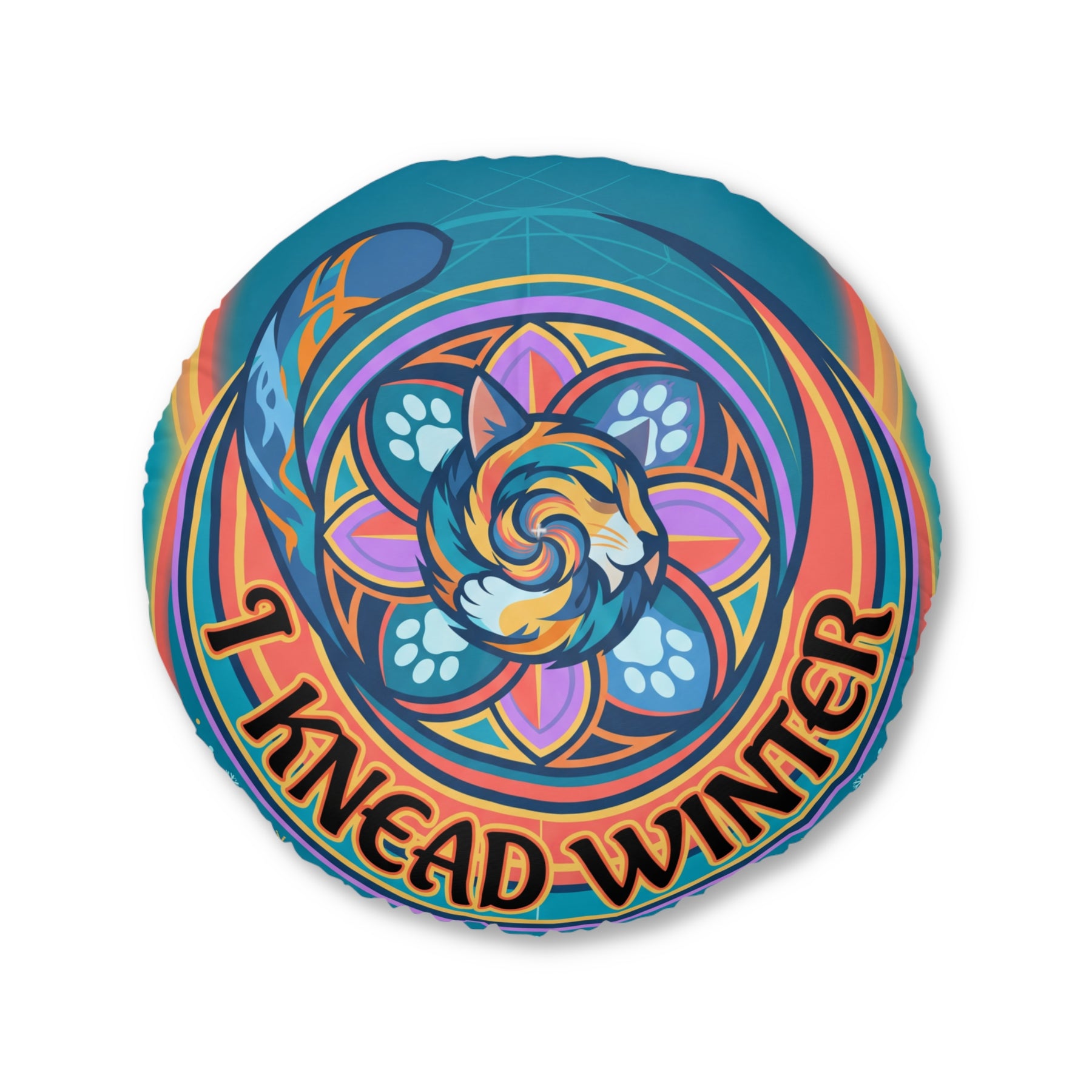 Close-up of a round tufted floor pillow featuring a blue-purple winter sacred-geometry cat with vibrant geometric rings; lifestyle setting for cozy, playful moments
