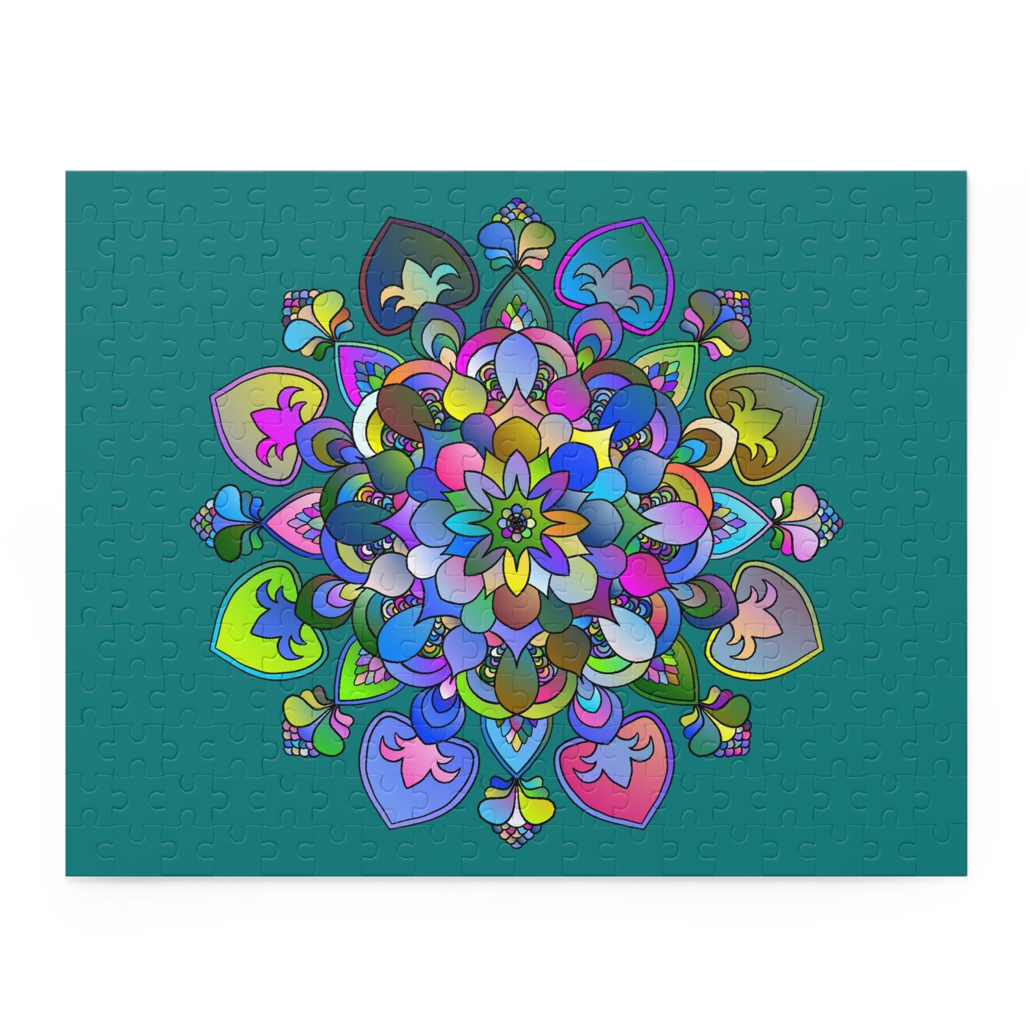 Lassen Sie sich vom faszinierenden floralen Mandala-Design verzaubern, dessen kräftige Farbtöne auf einem ruhigen petrolgrünen Hintergrund tanzen. Jedes Teil dieses komplexen Puzzles lädt Sie ein, eine Mischung aus Ku...