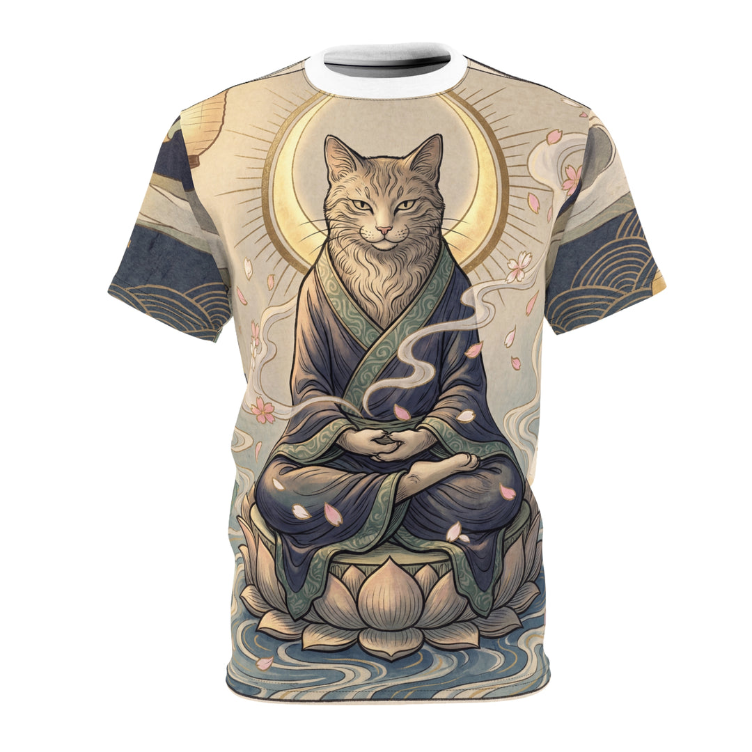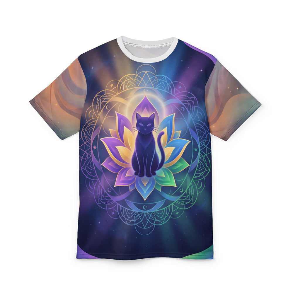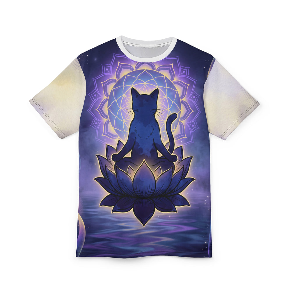 T-Shirt mit der Silhouette einer ruhigen und mystischen, leuchtenden Lotuskatze.