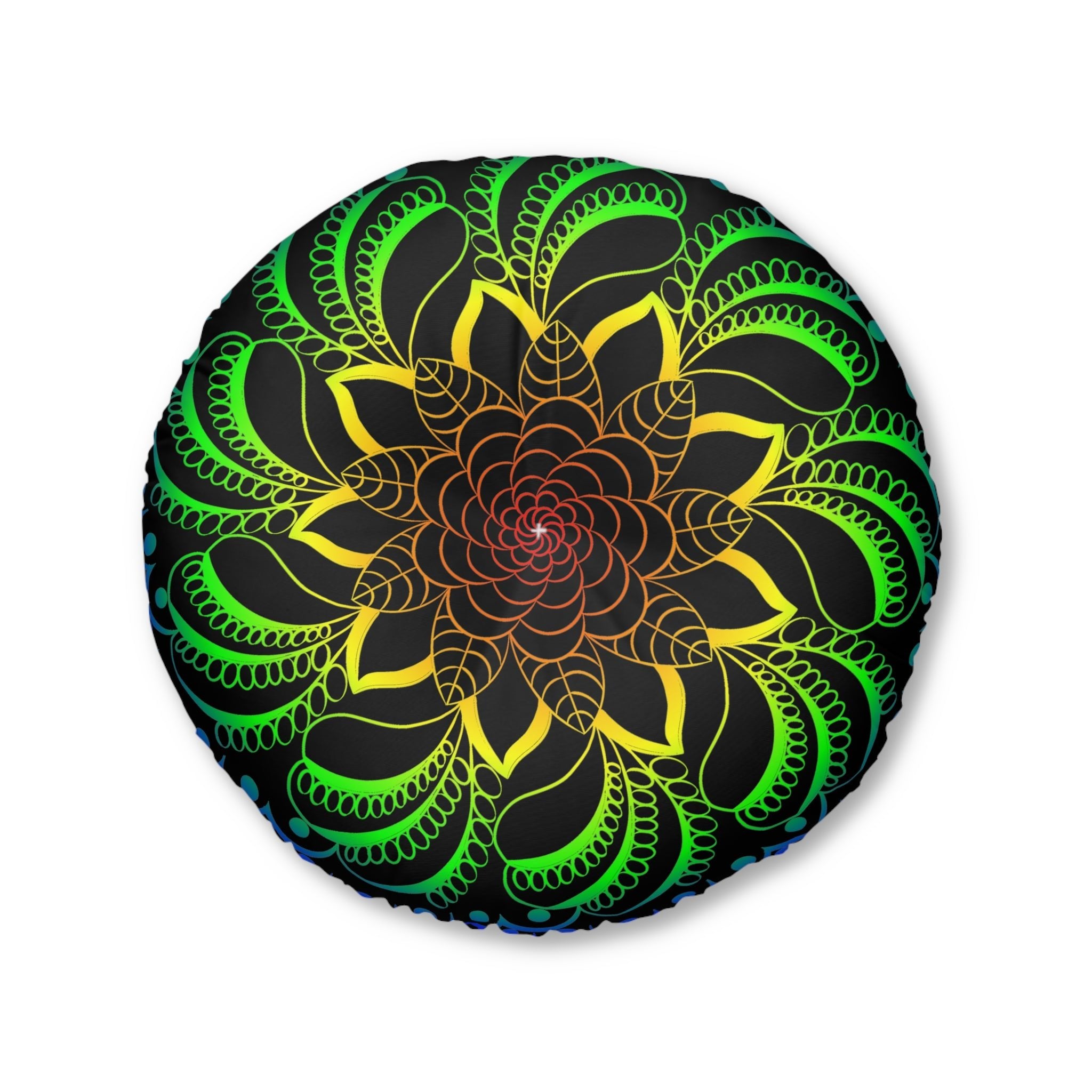 Be captivated by the vibrant explosion of colors in this enchanting round floor cushion, where a stunning mandala design dances against a rich black backdrop. Each intricate swirl and bold hue tells a story of tranquility and creativity, inviting you to experience the harmonious energy it brings to any space.