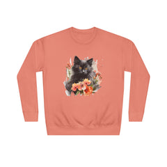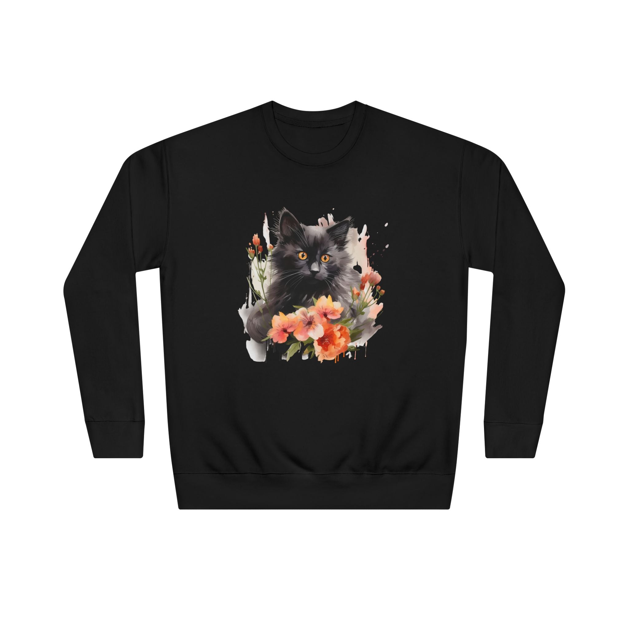 Embrace the enchanting allure of a charming black cat nestled among blossoming flowers in vibrant hues. This soft sweatshirt captures the playful spirit of a feline with mesmerizing orange eyes, surrounded by soft peach and coral blooms. Each glance at this artwork inspires joy, making it a stunning addition to your wardrobe that radiates warmth and personality.