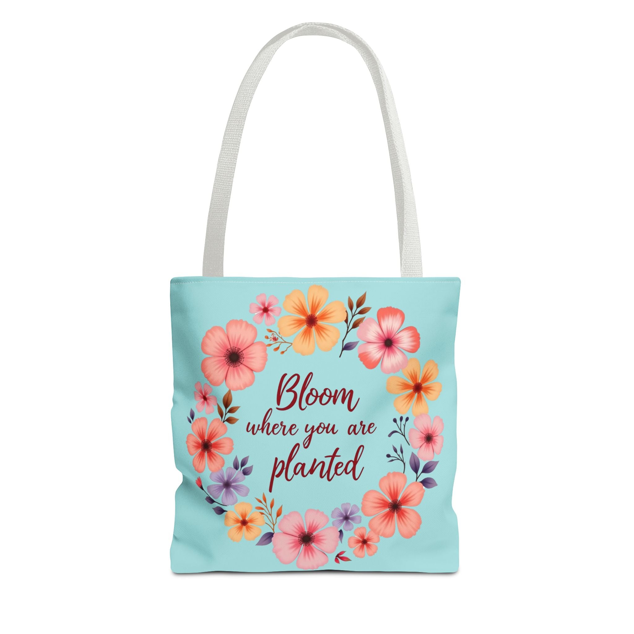 This vibrant tote bag bursts with life, showcasing a stunning floral arrangement that invites you to carry a piece of nature wherever you go. Adorned with blossoms in pastel hues, the uplifting quote "Bloom where you are planted" dances against a serene azure backdrop, exuding warmth and positivity. This bag is not merely an accessory; it’s a daily reminder of resilience and beauty, perfect for nature lovers.