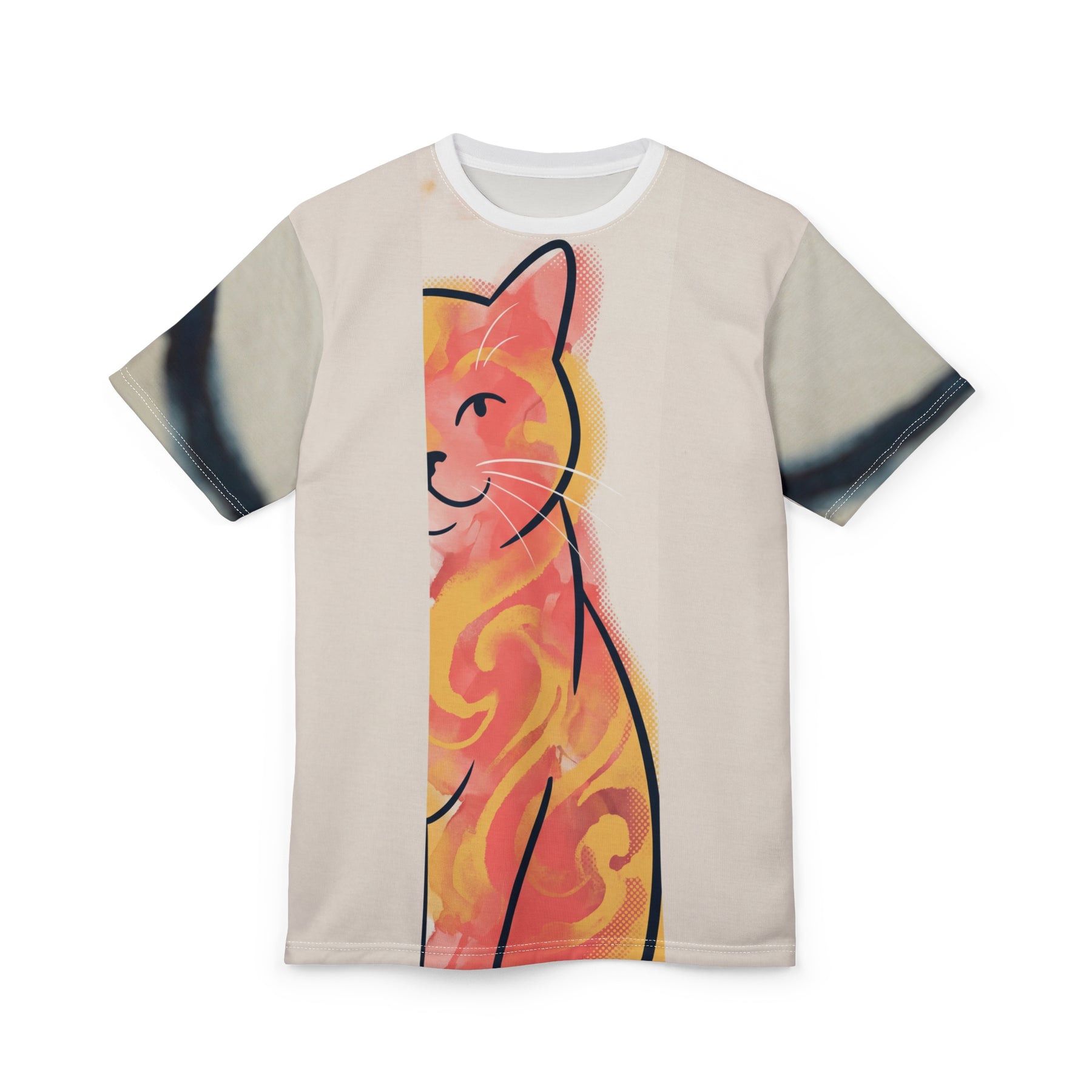 No-Nonsense Cat Tee, dark navy/black t-shirt with a double exposure sarcastic cat illustration; lifestyle studio shot showing the shirt on a model with a relaxed pose, close-up on the graphic details.