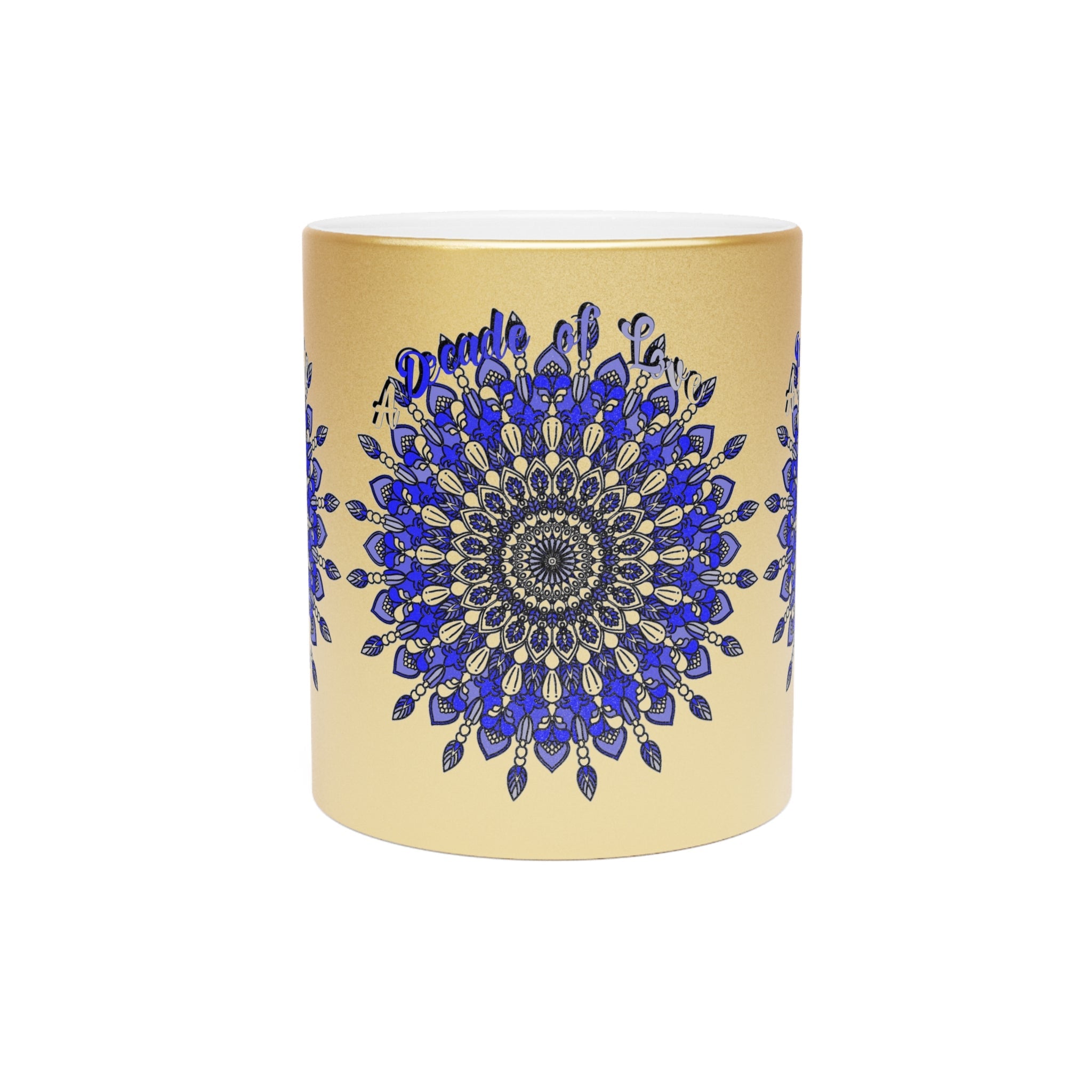 Unveil a world of elegance with this stunning metallic mug, adorned with a mesmerizing mandala design that radiates tranquility and harmony. The intricate blue accents dance beautifully against the shimmering gold and silver backdrop, creating an eye-catching centerpiece for your morning rituals or evening teas. This piece is not just a mug; it’s a vibrant statement of your mindful lifestyle.