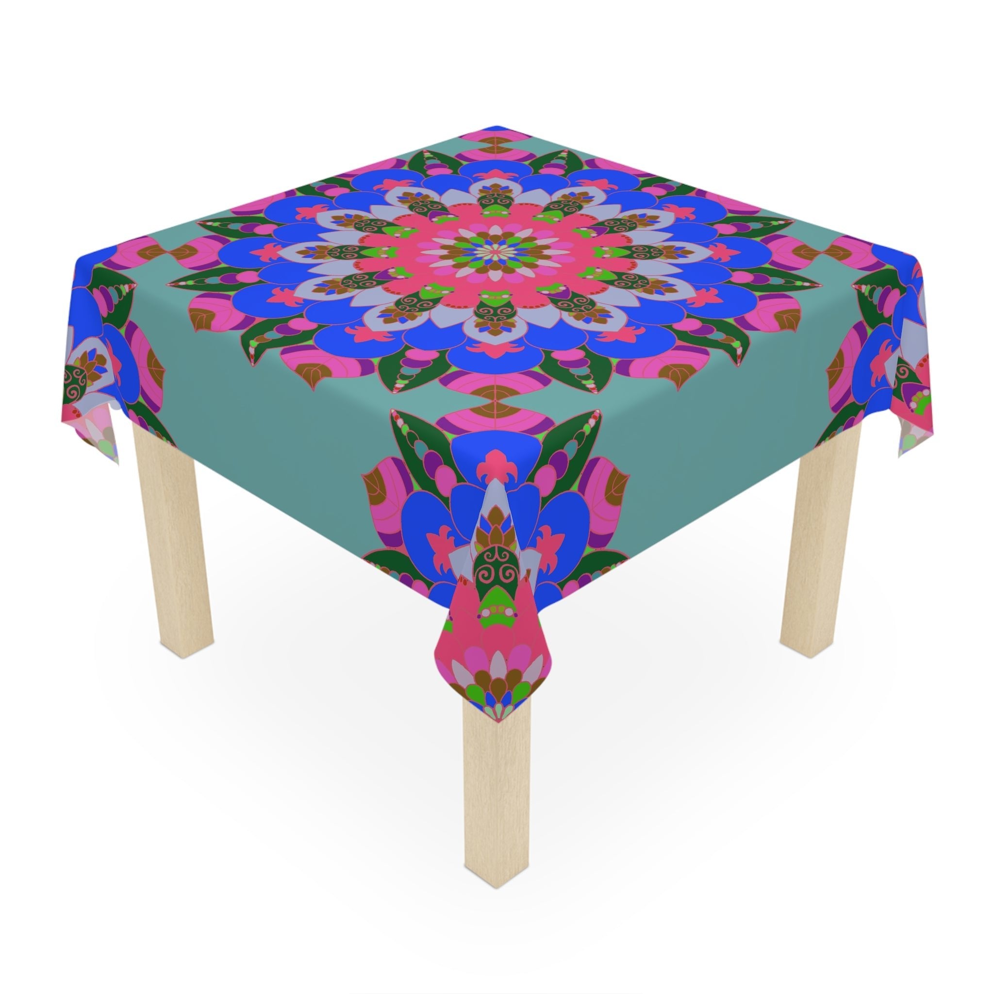 Delight in the enchanting allure of our Sage Green Floral Mandala Tablecloth, adorned with captivating kaleidoscopic patterns that dance across its surface. Each intricate mandala bursts with vibrant hues of blue, pink, and earthy tones, creating an inviting atmosphere that transforms your dining space into a sanctuary of style and serenity.