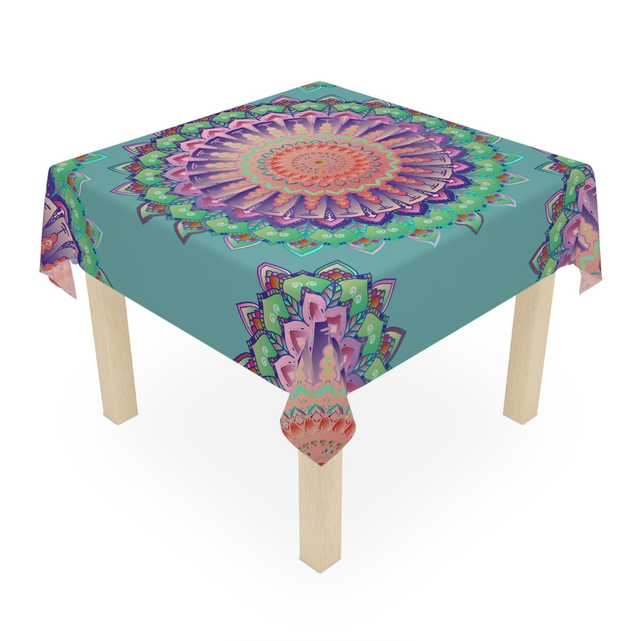 Awash in soothing sage green, this exquisite tablecloth features an intricate mandala design that captivates the soul. Each elaborate floral pattern bursts forth with vibrant colors, inviting a sense of peace and harm...