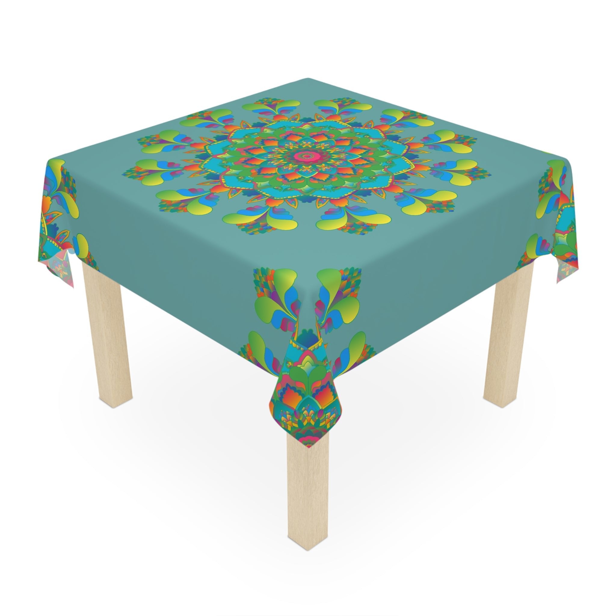 Transform your dining experience with this enchanting tablecloth, where a vibrant mandala bursts forth in a kaleidoscope of colors against a serene sage green backdrop. The intricate design dances across the fabric, inviting serene conversations and joyful gatherings, making every meal feel like a festive occasion.