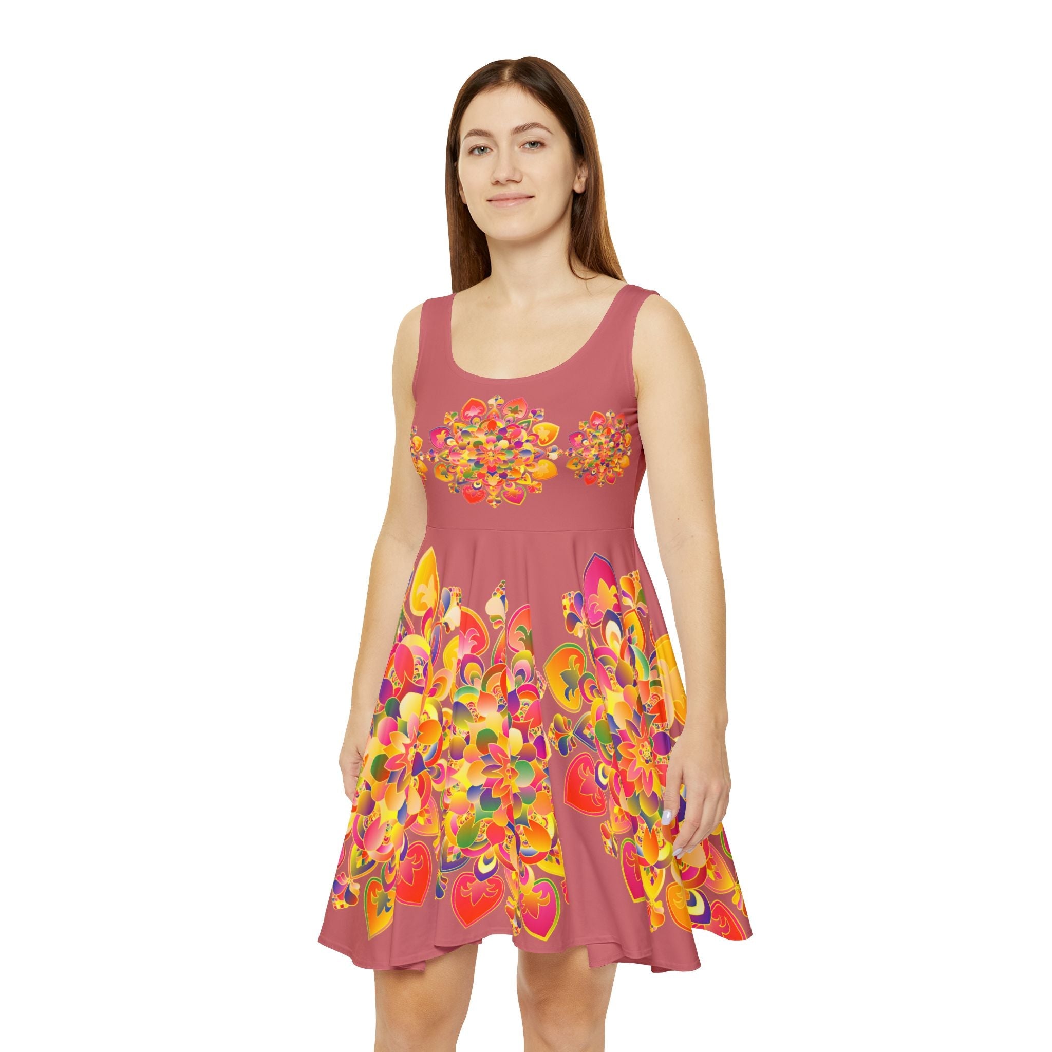 This enchanting skater dress bursts with vibrancy, showcasing a mesmerizing mandala design that dances in radiant gold and red hues against a soft salmon pink backdrop. The intricate patterns tell a story of creativity and harmony, transforming a simple piece of clothing into a stunning work of art. Perfect for those who appreciate the beauty of mindful living, this dress is a canvas of self-expression.