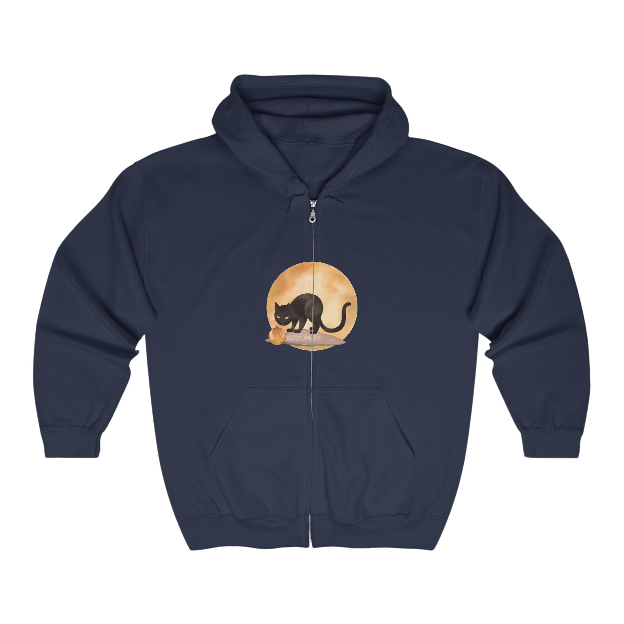Envelop yourself in the enchanting allure of a mystical black cat, poised under the luminous glow of a full moon, as it curiously gazes at a pumpkin. This captivating design not only embodies the spirit of Halloween but also invites a sprinkle of magic into your everyday life, making it a perfect addition to your cozy wardrobe.
