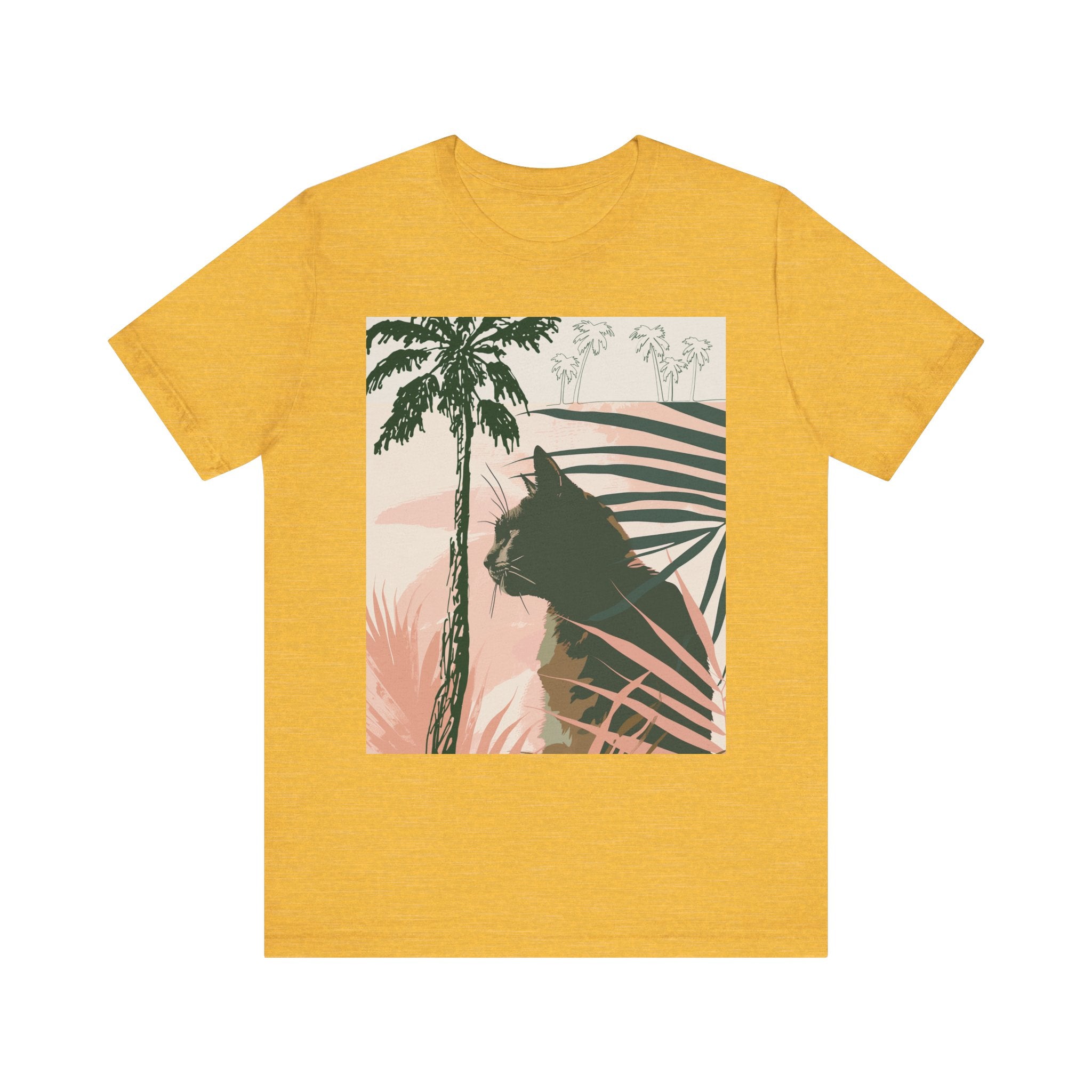 Step into a vivid world where a sleek black cat elegantly intertwines with lush, tropical palms, creating a captivating scene that evokes a sense of tranquility and mystery. Bathed in warm hues, this design unfolds like a visual story, inviting you to embrace the beauty of nature and artistry through your wardrobe.