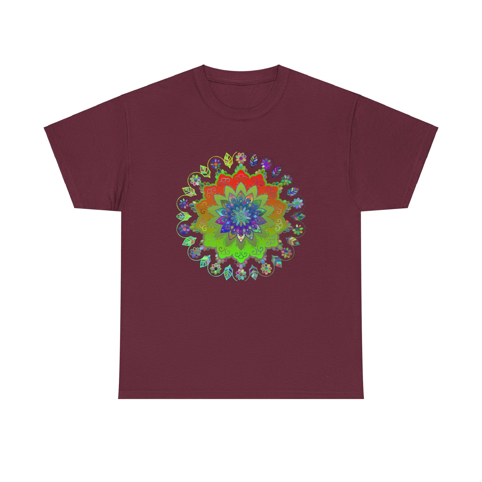 Radiate peace and vibrancy with a t-shirt adorned by an exquisite mandala design, a celebration of harmony and creativity. The lively interplay of colors—emerald greens, deep reds, and gentle blues—pulls you into a world where mindfulness comes alive, turning every moment into a canvas of tranquility.