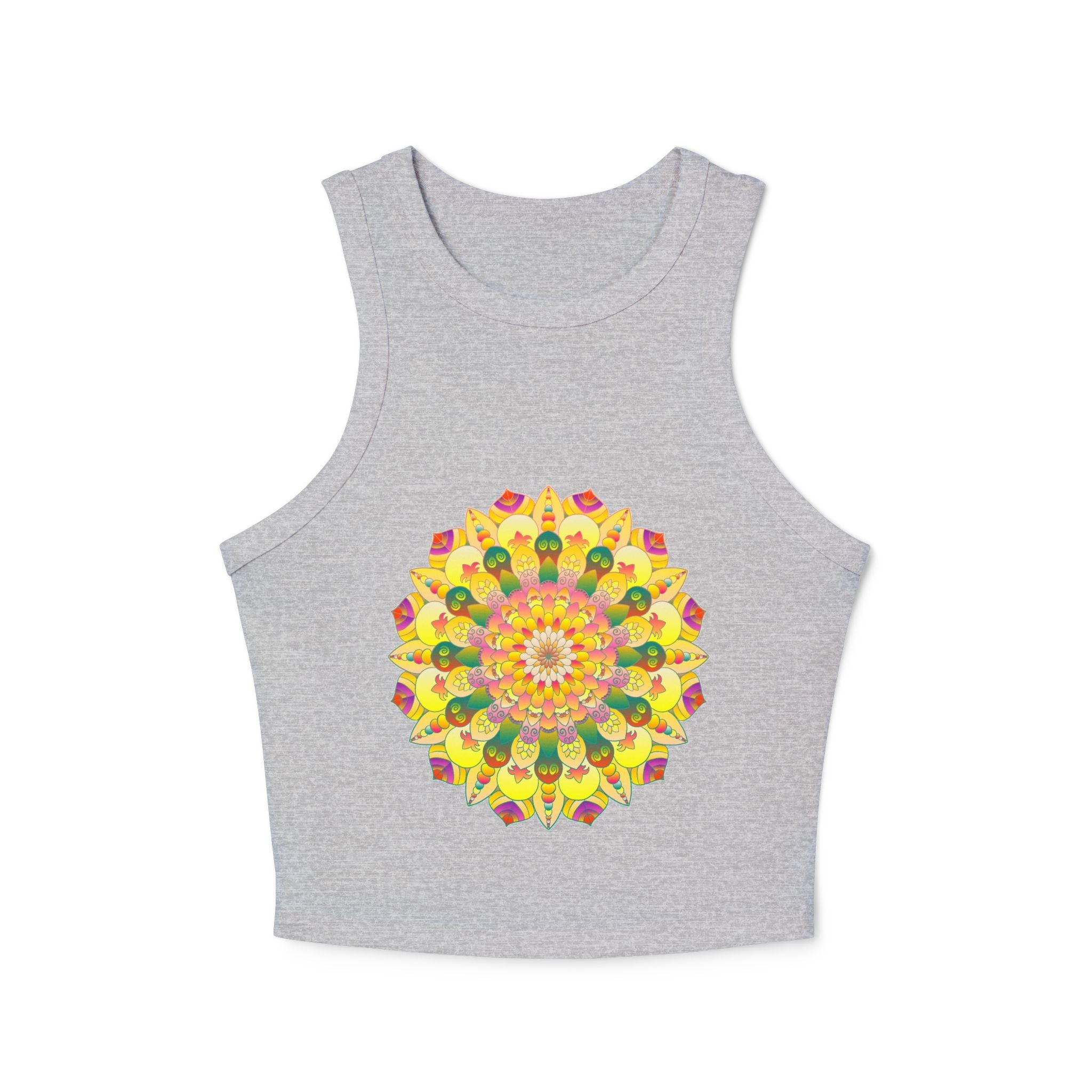Experience a burst of energy with this mesmerizing racerback tank top adorned with a vibrant mandala design. Each intricate pattern radiates bright yellow and pink tones, creating a captivating focal point that transports you to a world of tranquility and creativity. This piece is not just a tank top; it's a celebration of color that adds a joyful spark to your wardrobe.