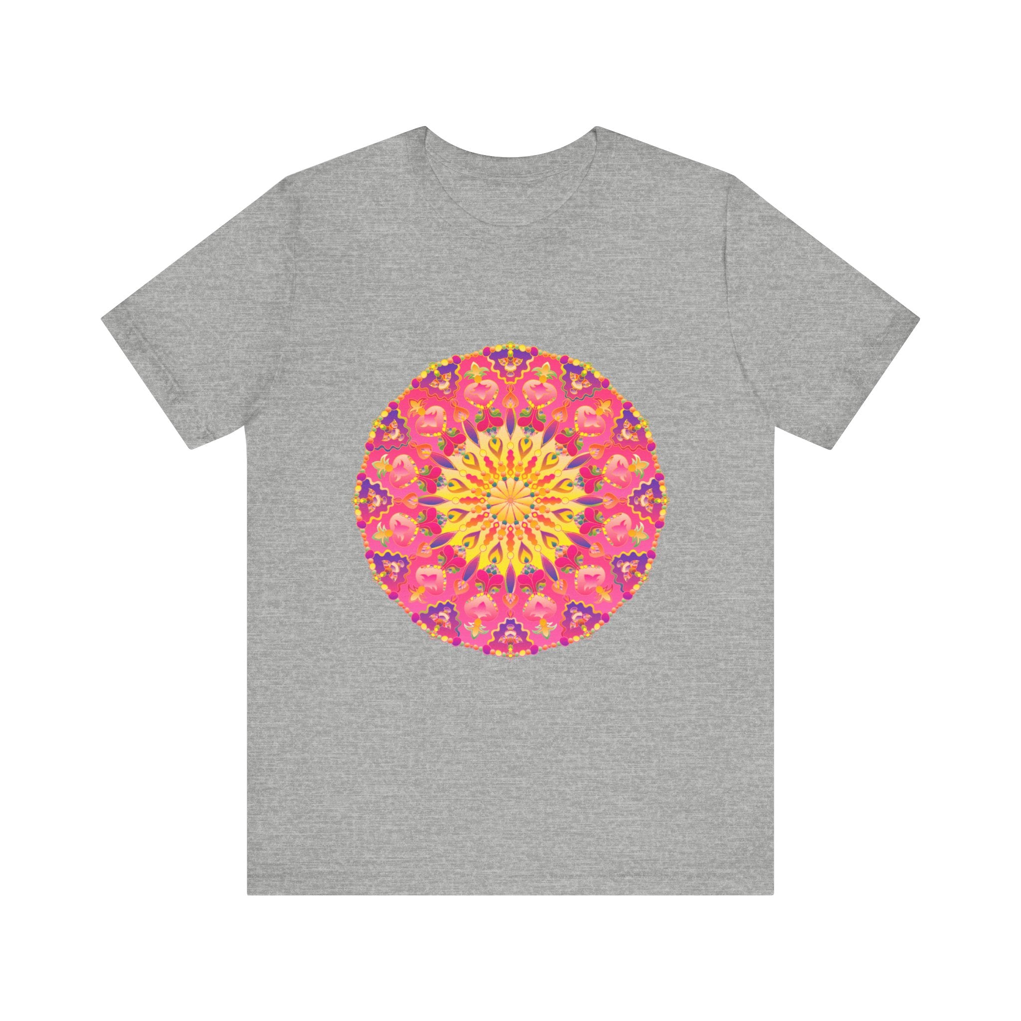Unveil a visual masterpiece with this stunning t-shirt, adorned with a mesmerizing mandala design that radiates vibrant pinks and yellows. Each intricate detail invites you to explore a world where art and fashion intertwine, creating a bold statement piece that elevates your everyday wardrobe.