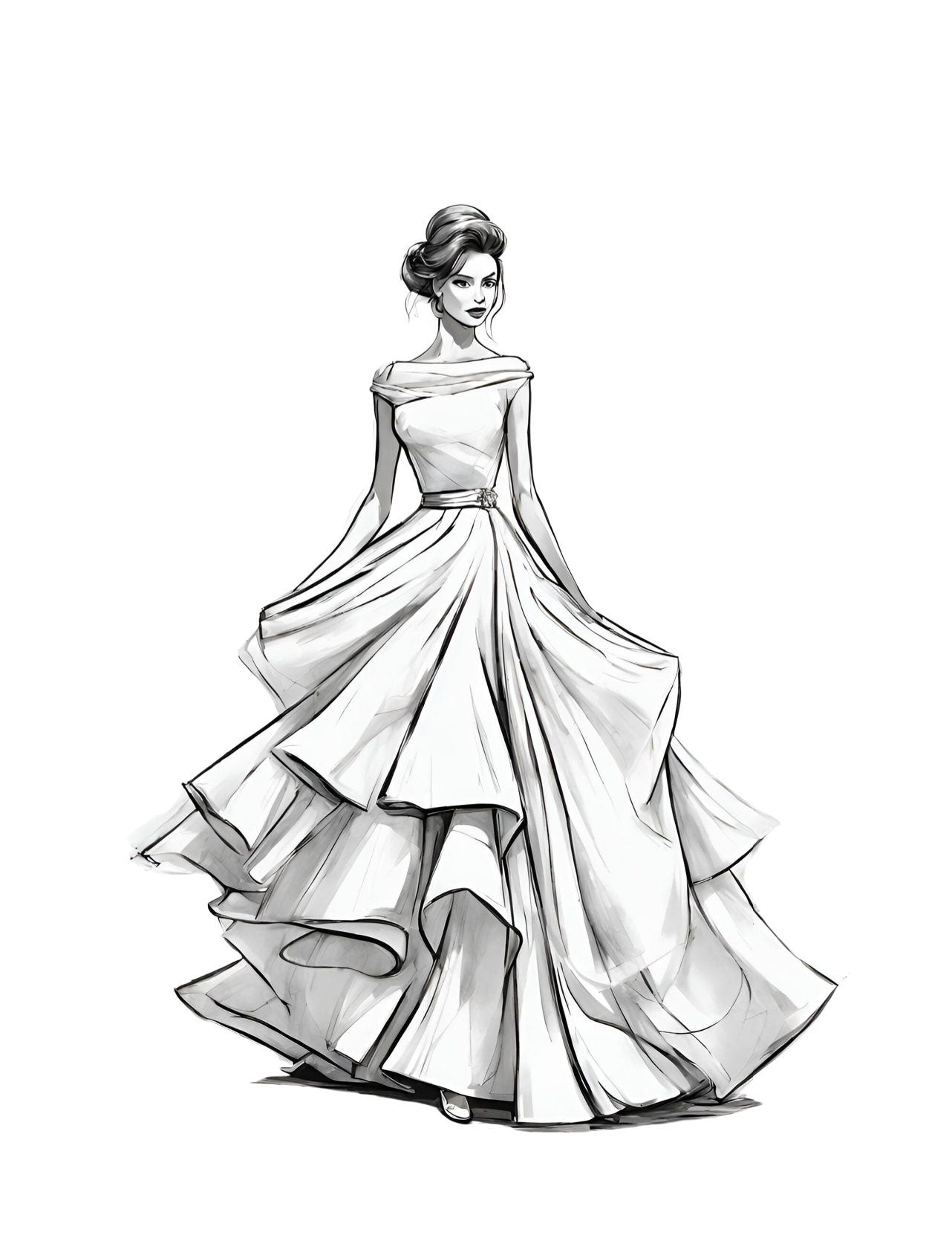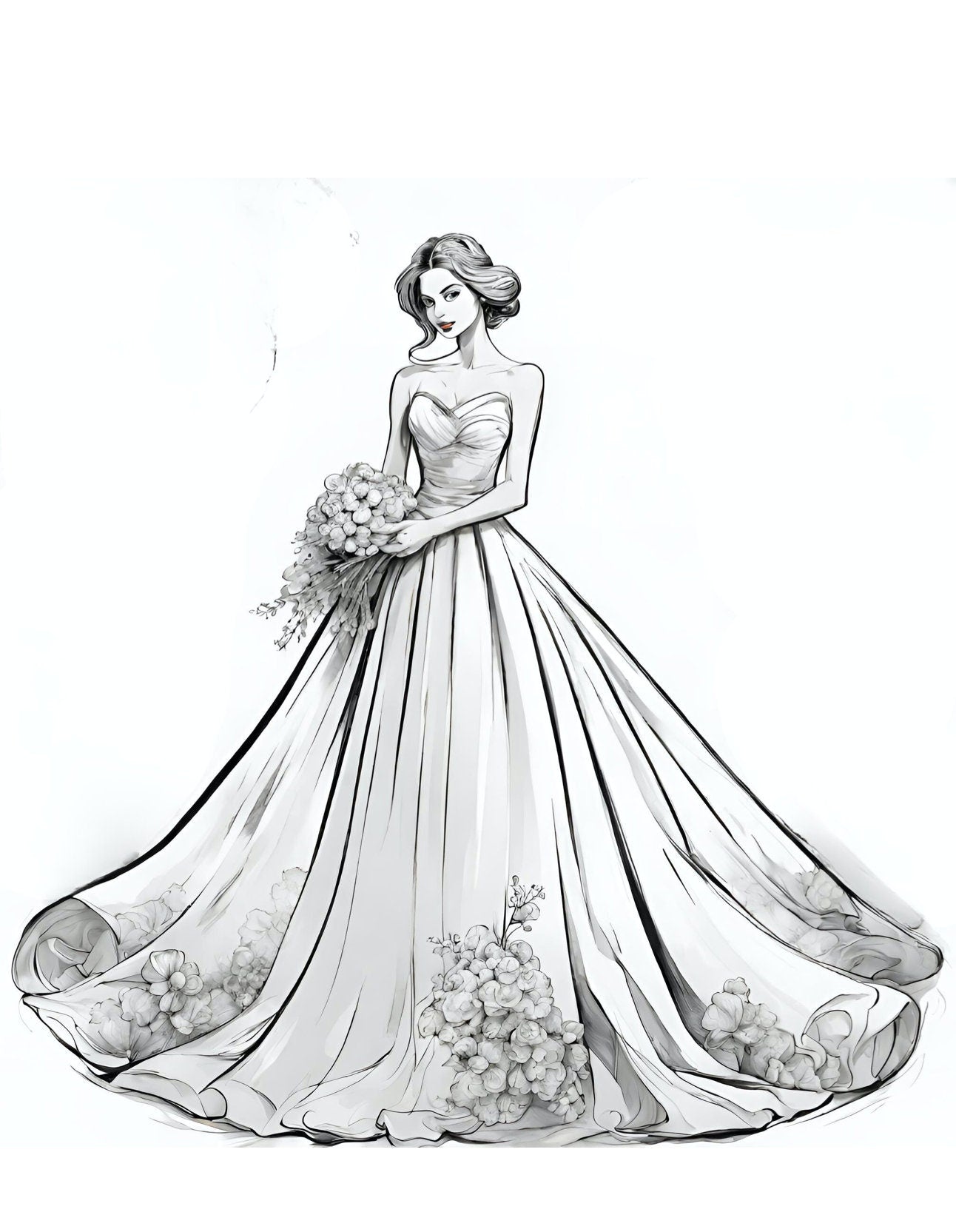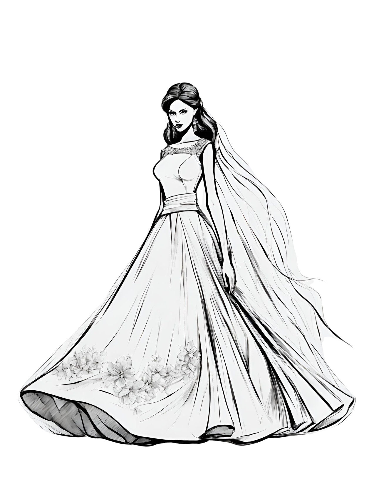 Illustration of a Modern Western Wedding Dress, a page from the World Fashion Dresses Coloring Book for Kids and Adults by Blululi