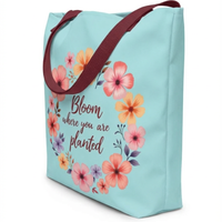 Questa vivace tote bag è un'esplosione di vita, con una splendida composizione floreale che ti invita a portare con te un pezzetto di natura ovunque tu vada. Decorata con fiori dai toni pastello, la frase edificante "Bloom where you are planted" (Fiorisci dove sei piantato) danza su uno sfondo azzurro sereno, emanando calore e positività. Questa borsa non è un semplice accessorio; è un promemoria quotidiano di resilienza e bellezza, perfetto per gli amanti della natura.