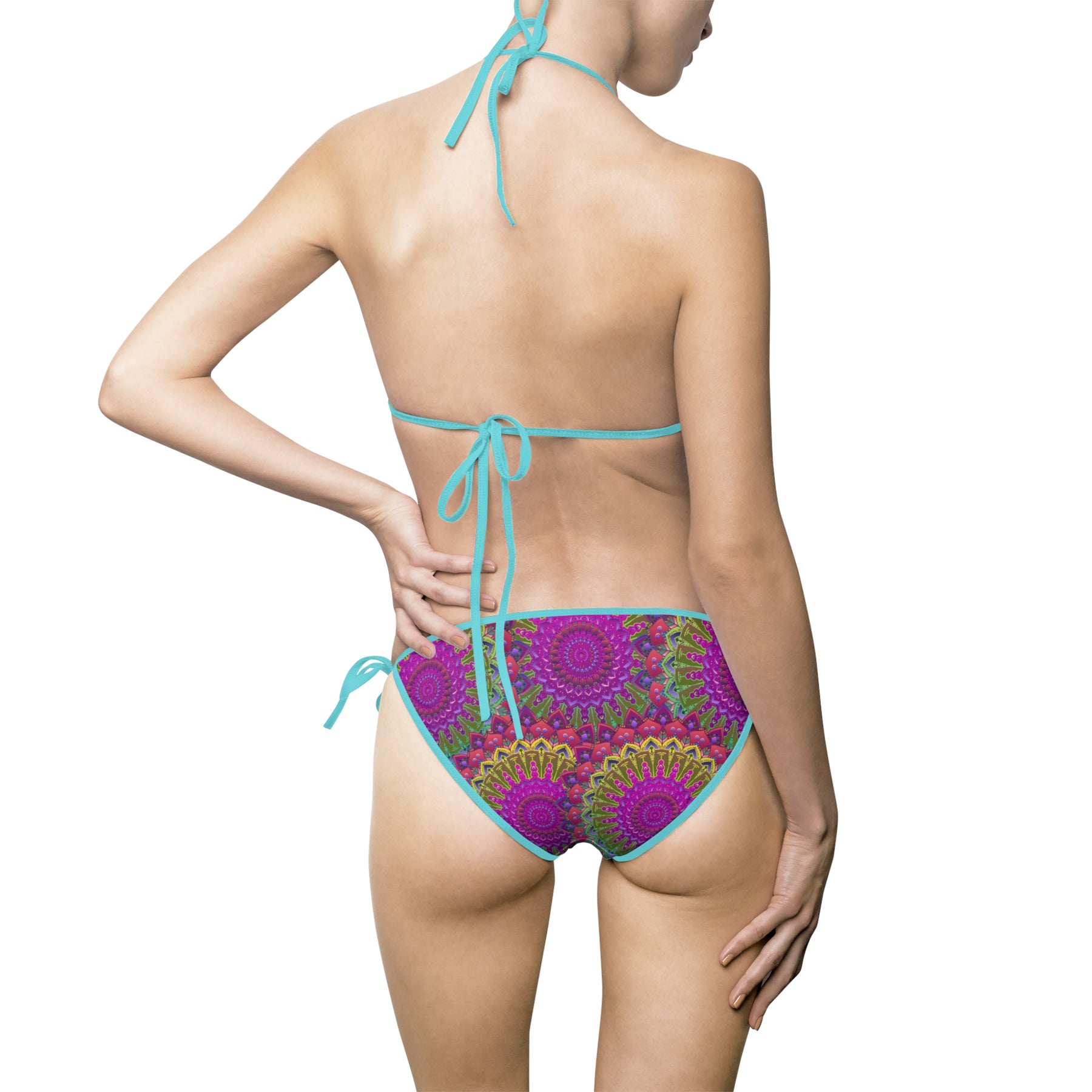 Lasciati travolgere dall'energia avvolgente di questo splendido bikini, decorato con intricati mandala disegnati a mano che esplodono in audaci tonalità di viola e verde acceso. Ogni capo riflette un'arte unica che armonizza creatività e uno stile di vita dinamico, trasformando la tua esperienza in spiaggia o in piscina in una colorata celebrazione dell'individualità.