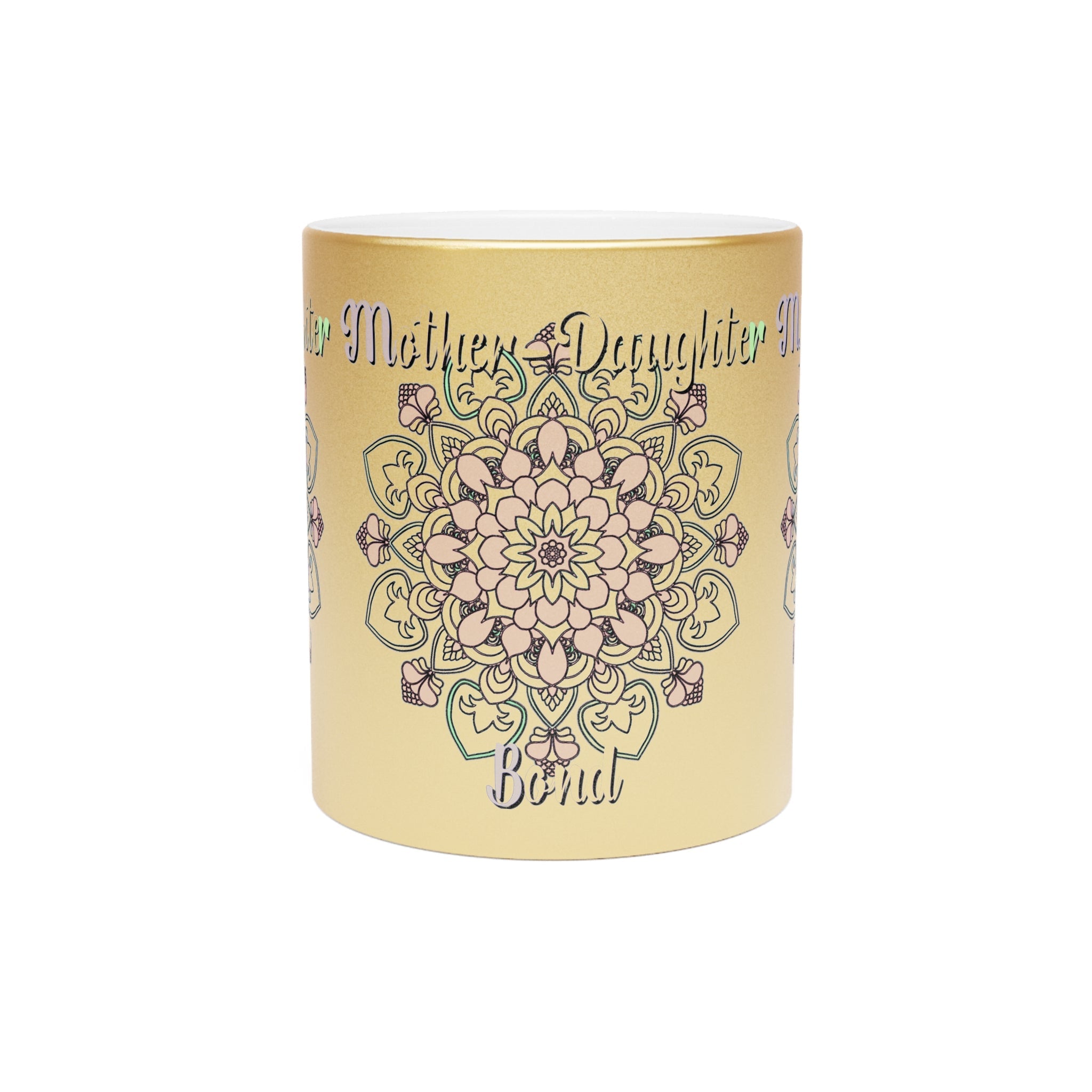 Immergiti in un mondo di connessione con questa splendida tazza metallica, la cui superficie è decorata da intricati mandala, a simboleggiare il meraviglioso legame tra madri e figlie. Il delicato gioco di colori, dall'oro scintillante all'argento tenue, dona un senso di calore ed eleganza, perfetto per ogni momento di intimità.