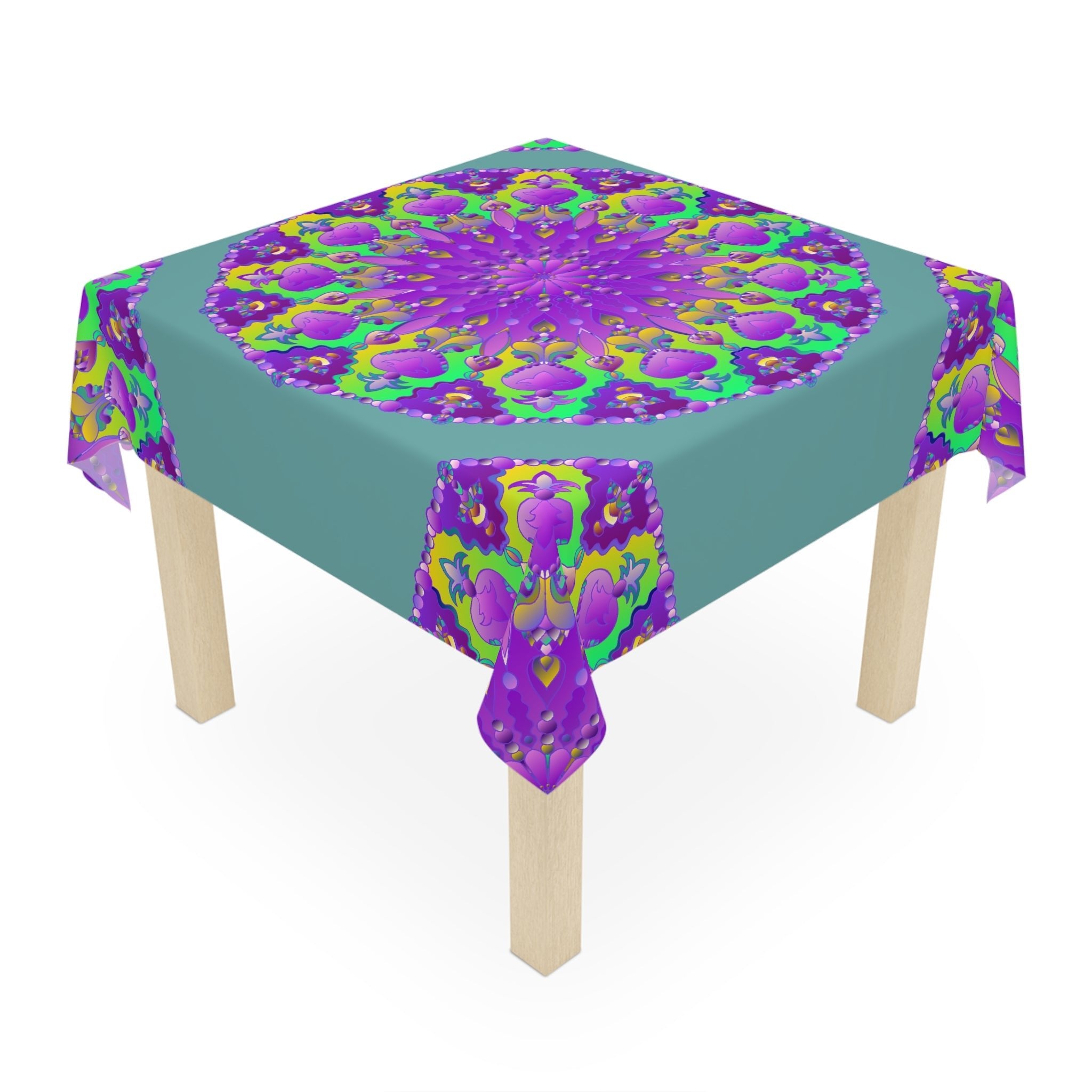 Trasforma la tua sala da pranzo in un'oasi di fantasia con questa splendida tovaglia mandala, dove un vivace motivo floreale danza su un sereno sfondo verde salvia. Gli intricati motivi di cuori giocosi e fiori che sbocciano evocano un senso di gioia e tranquillità, rendendo ogni pasto un'esperienza deliziosa.