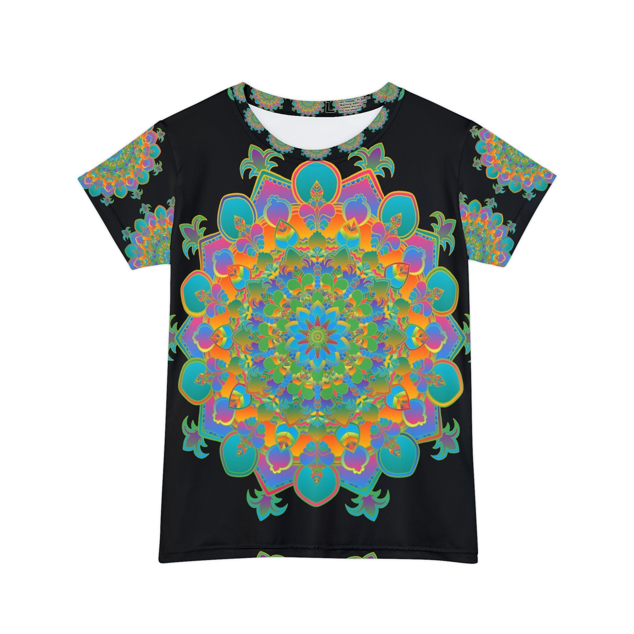 Immergiti in un mondo di vibrante spiritualità con questa splendida t-shirt, decorata con un meraviglioso mandala. Quest'opera d'arte accattivante esplode di colori che danzano su un audace sfondo nero, creando un ar...