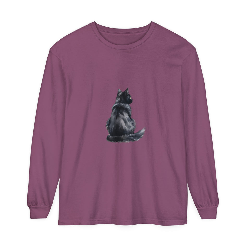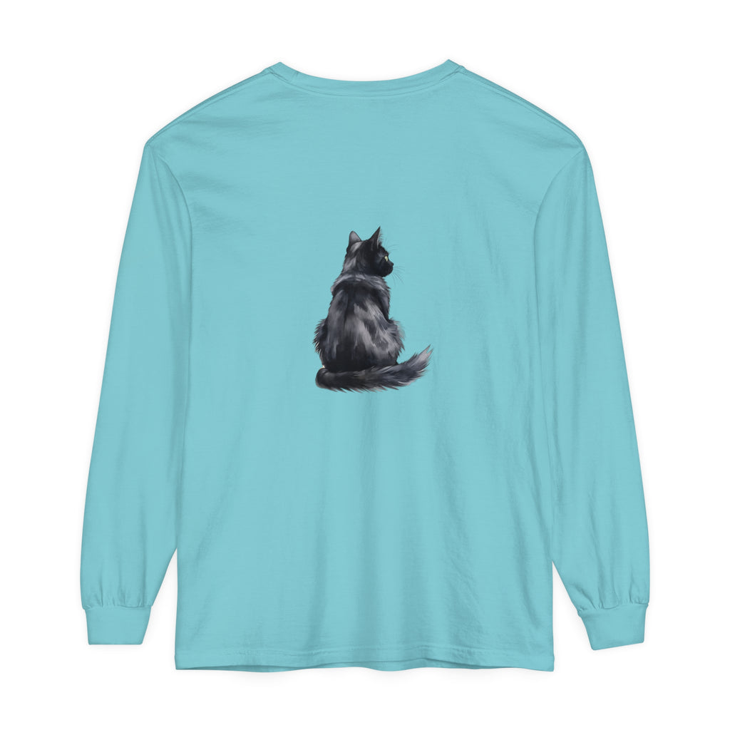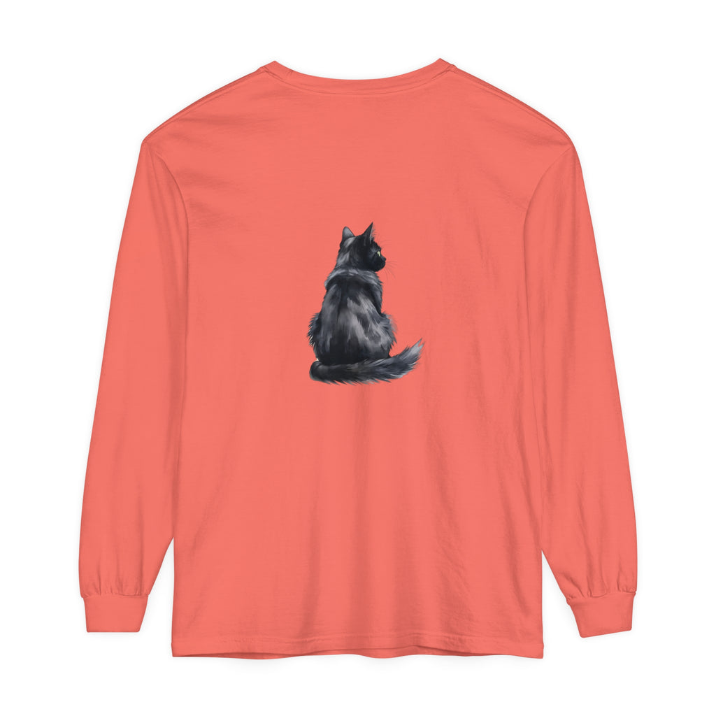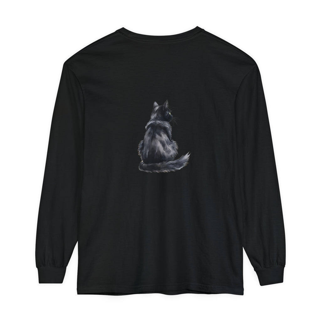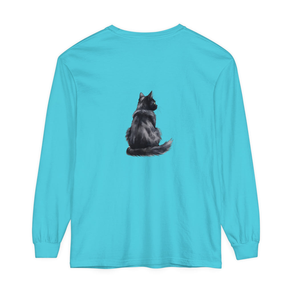 Soft and comfortable long sleeve t-shirt with a watercolor black cat design