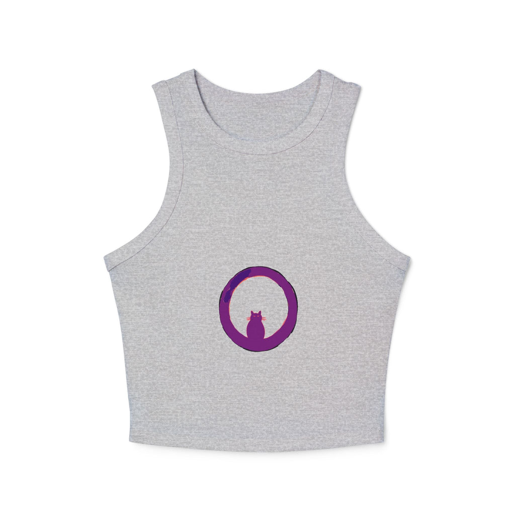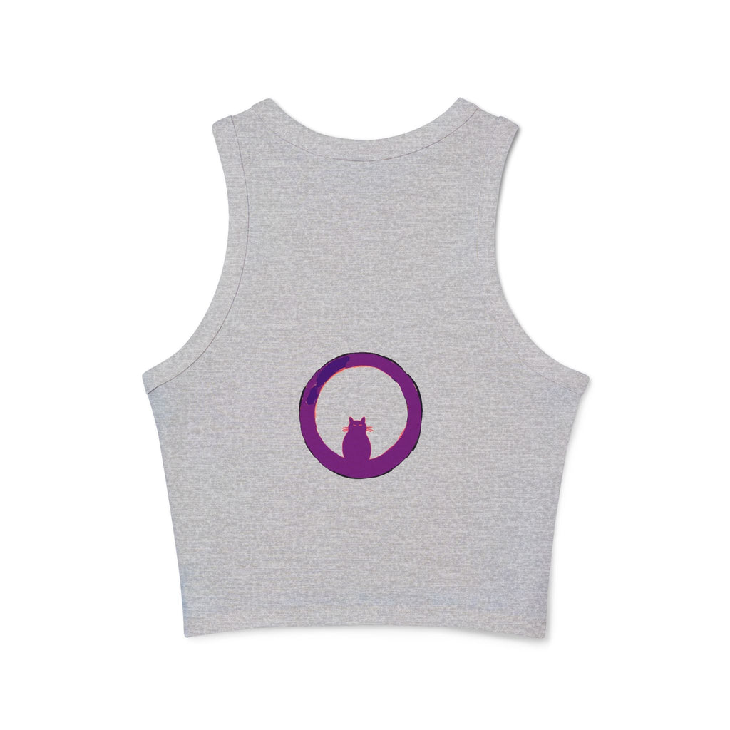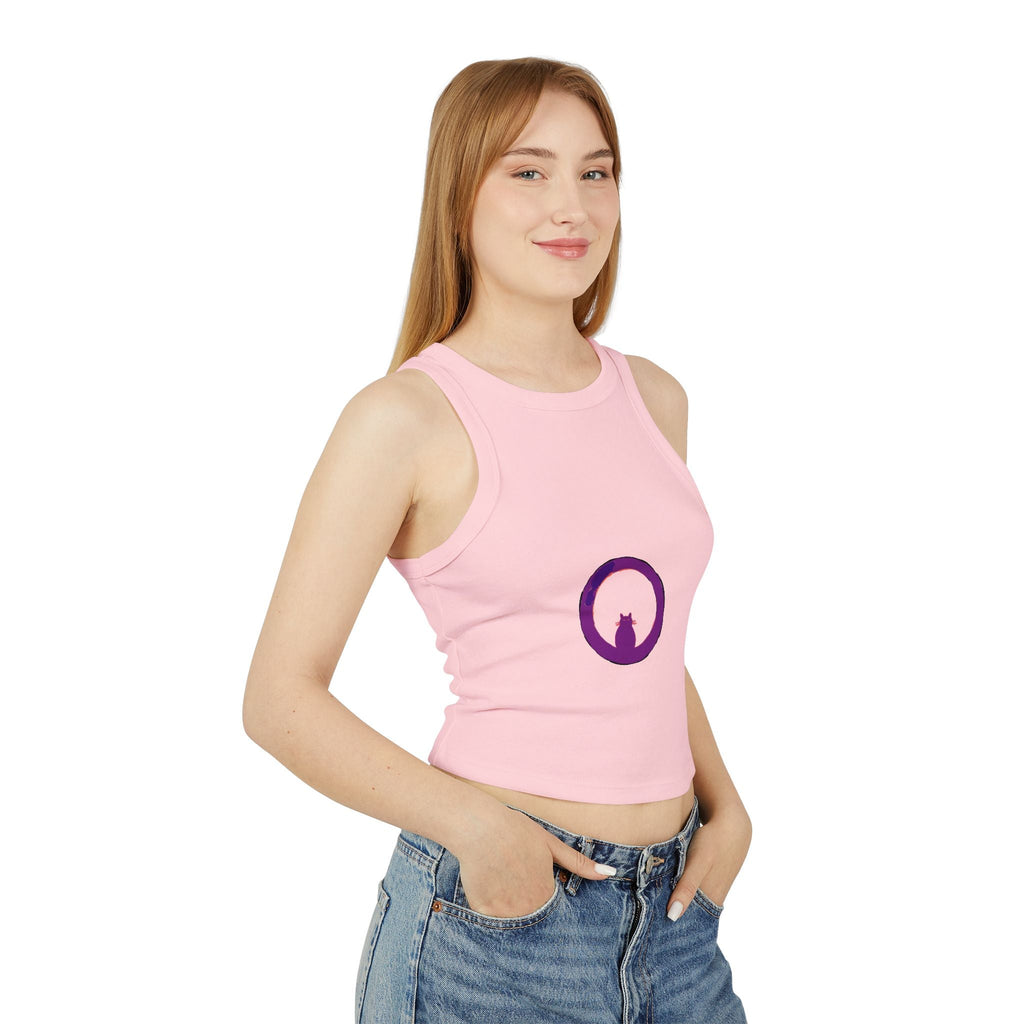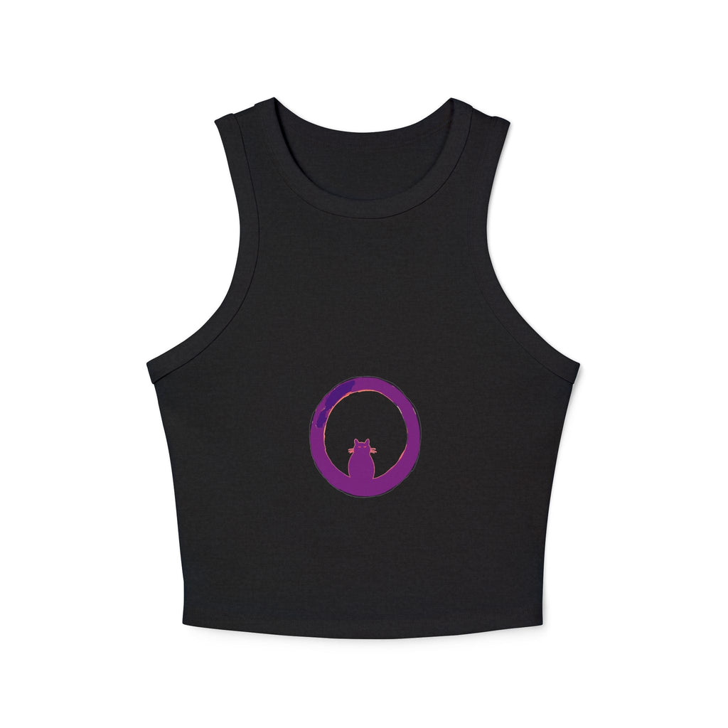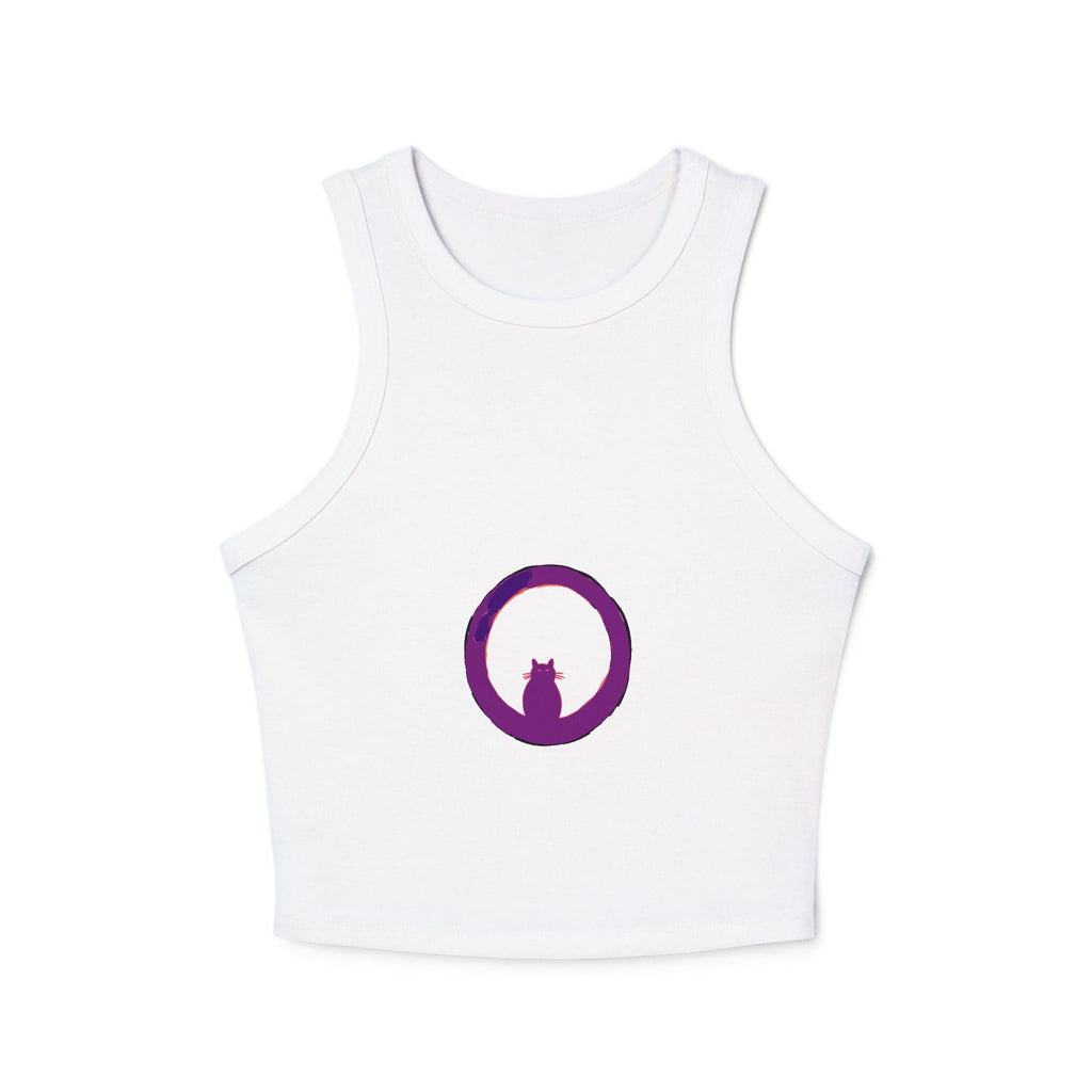 Canotta con schiena scoperta e silhouette di gatto nero in tonalità viola