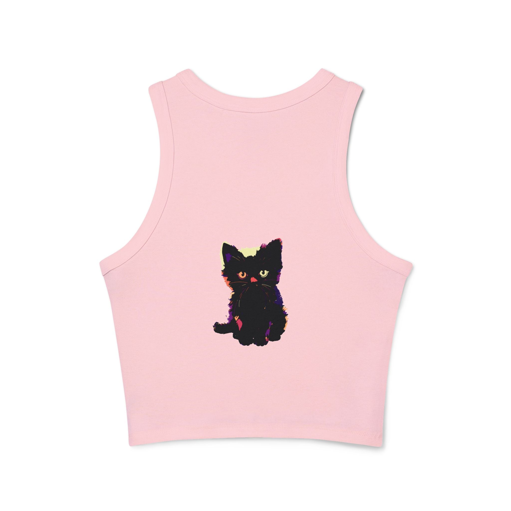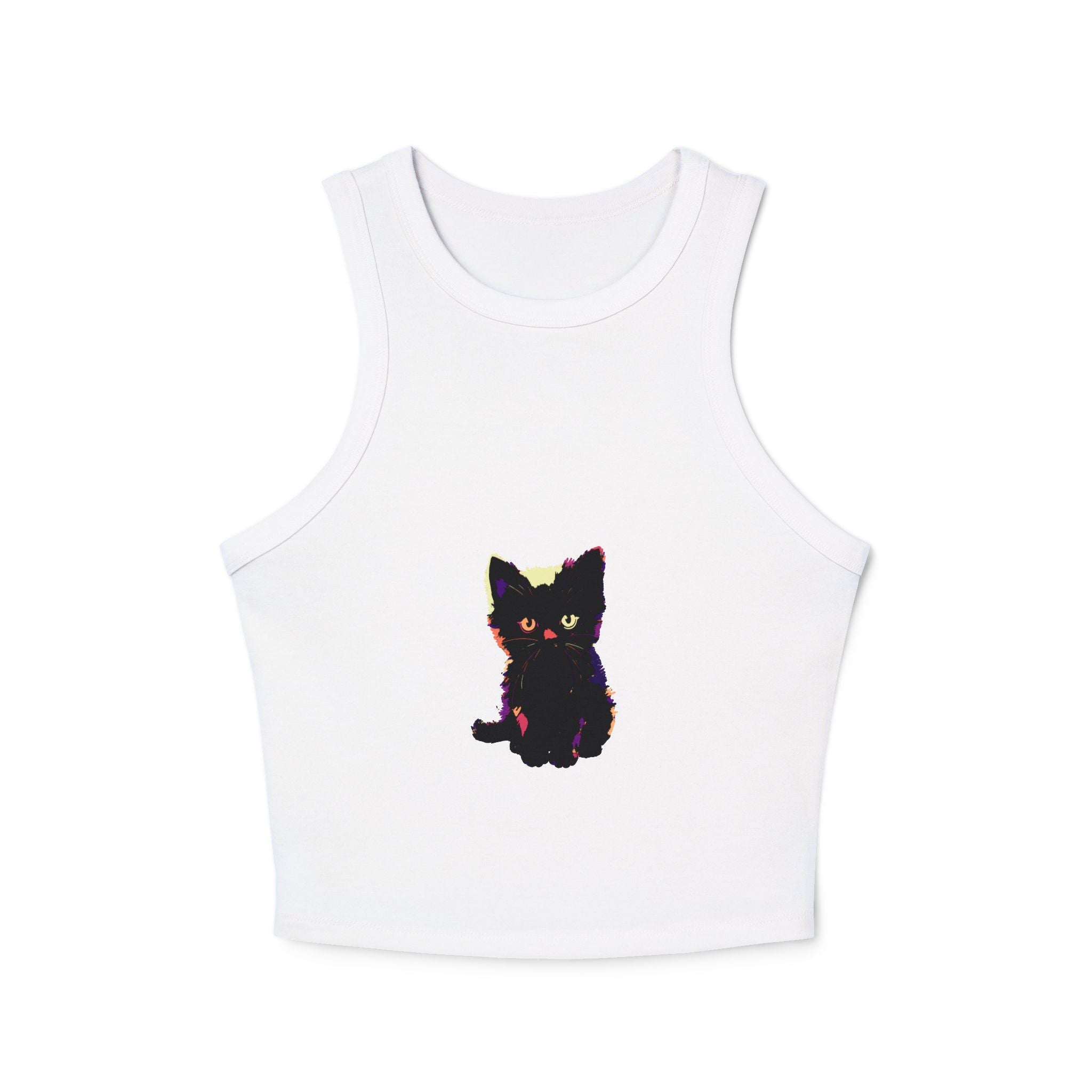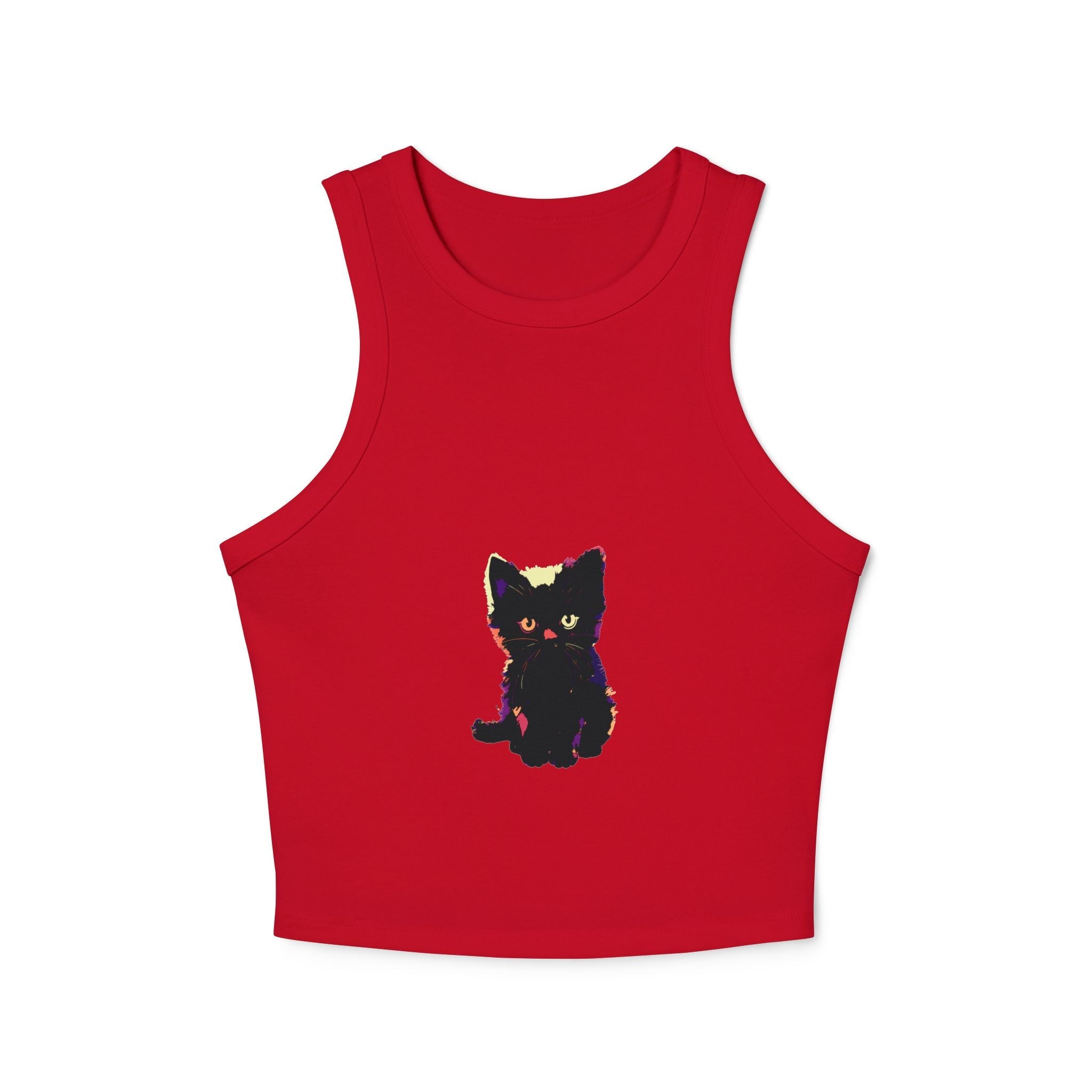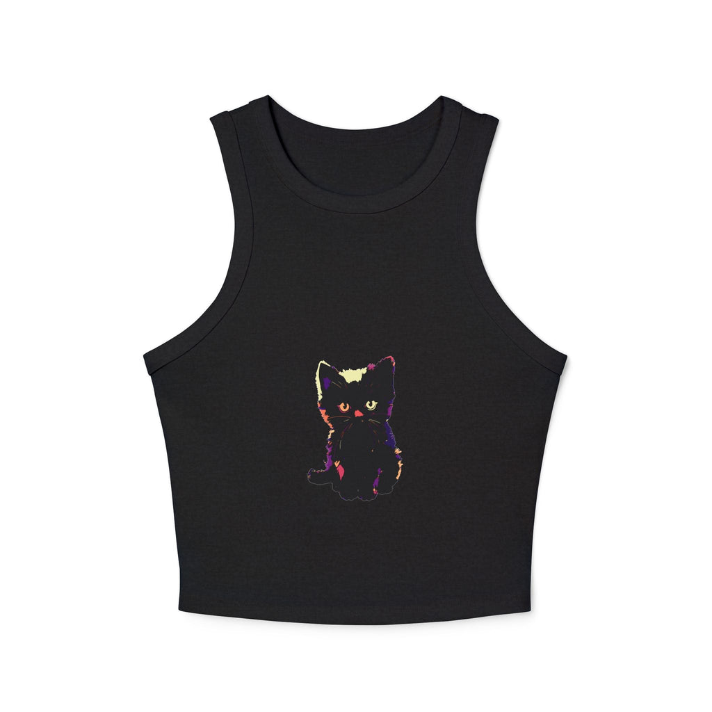 Indossare questa canotta trasforma la tua giornata in un'avventura giocosa. Ogni sguardo all'adorabile disegno del gatto nero suscita gioia e un senso di libertà, rendendola un'aggiunta essenziale al tuo guardaroba.