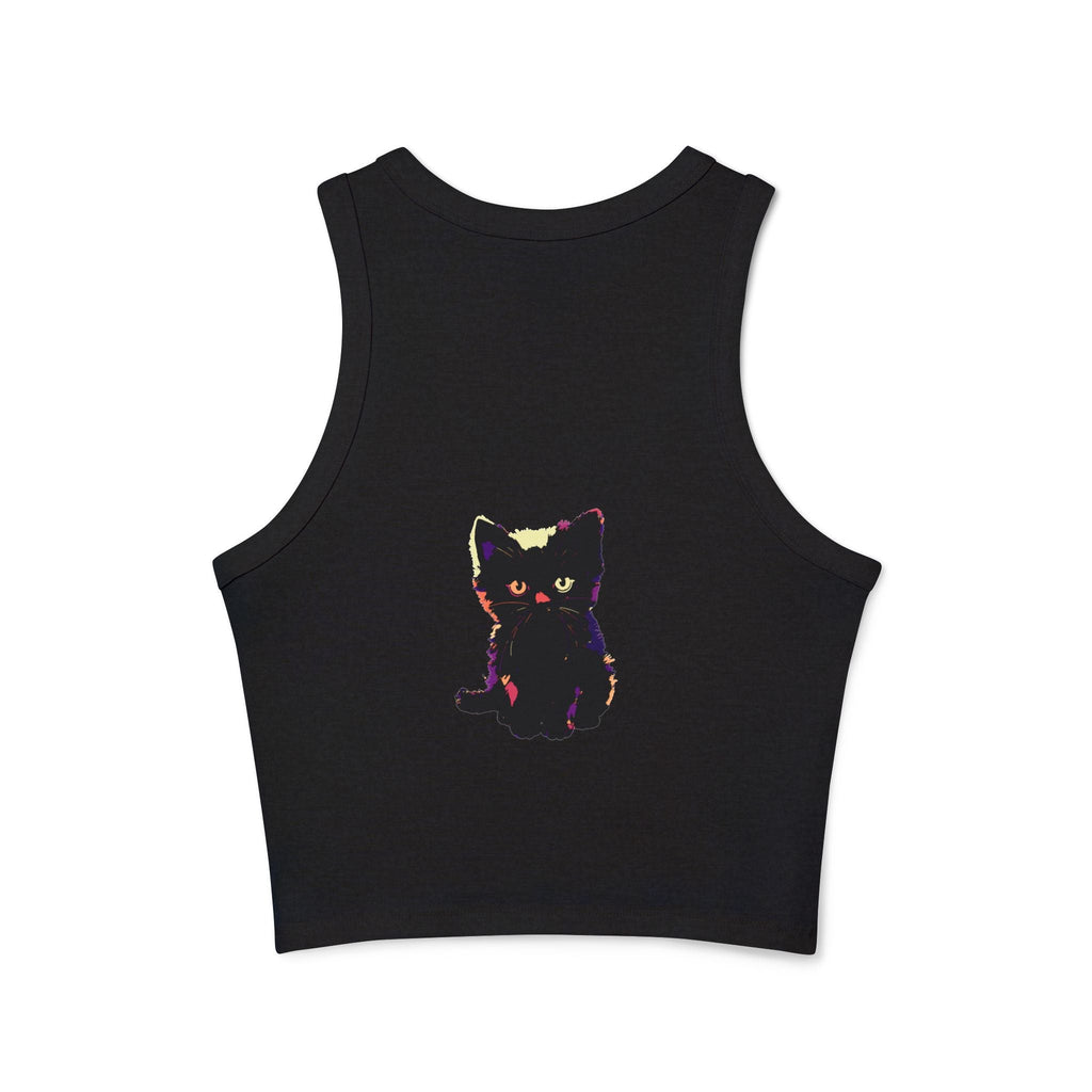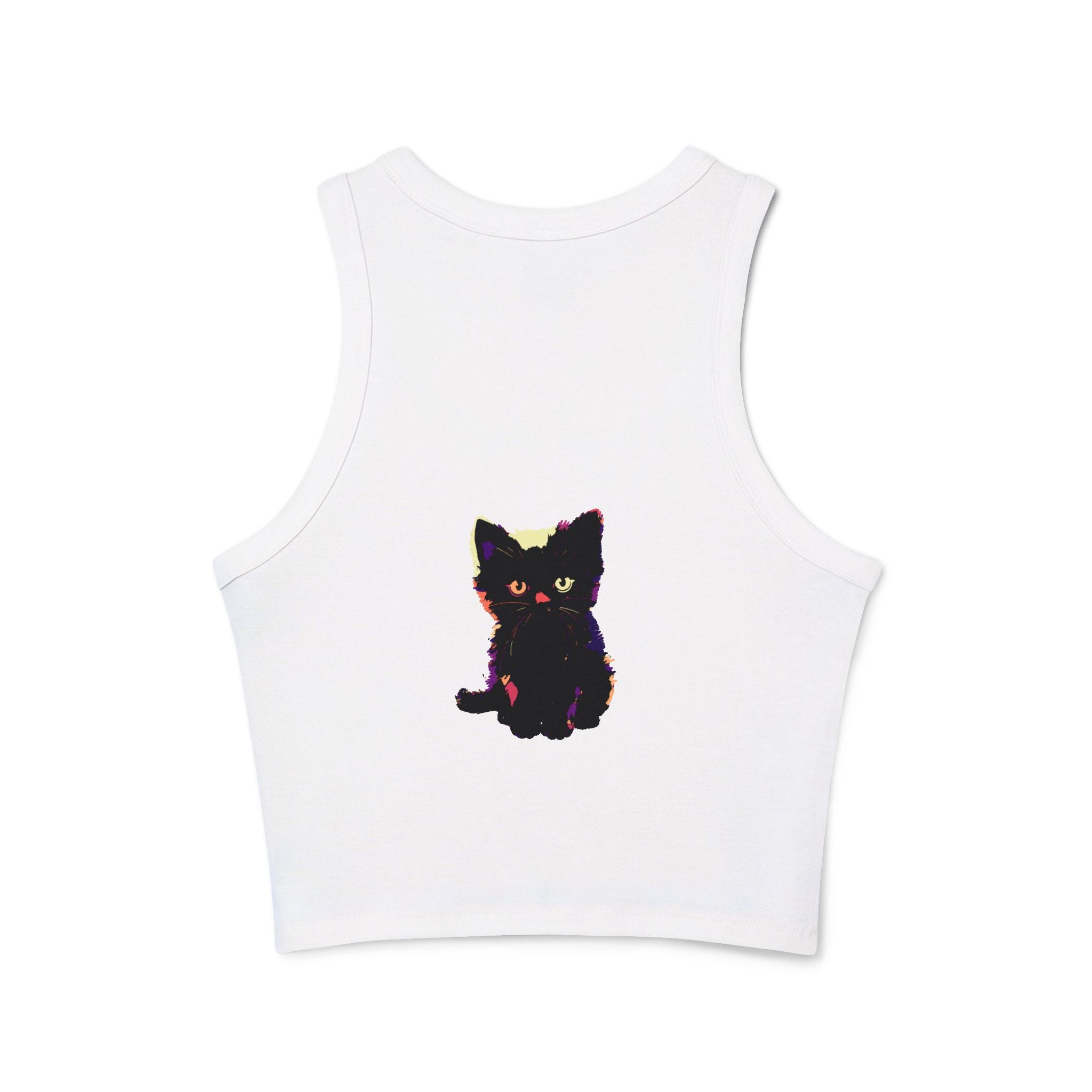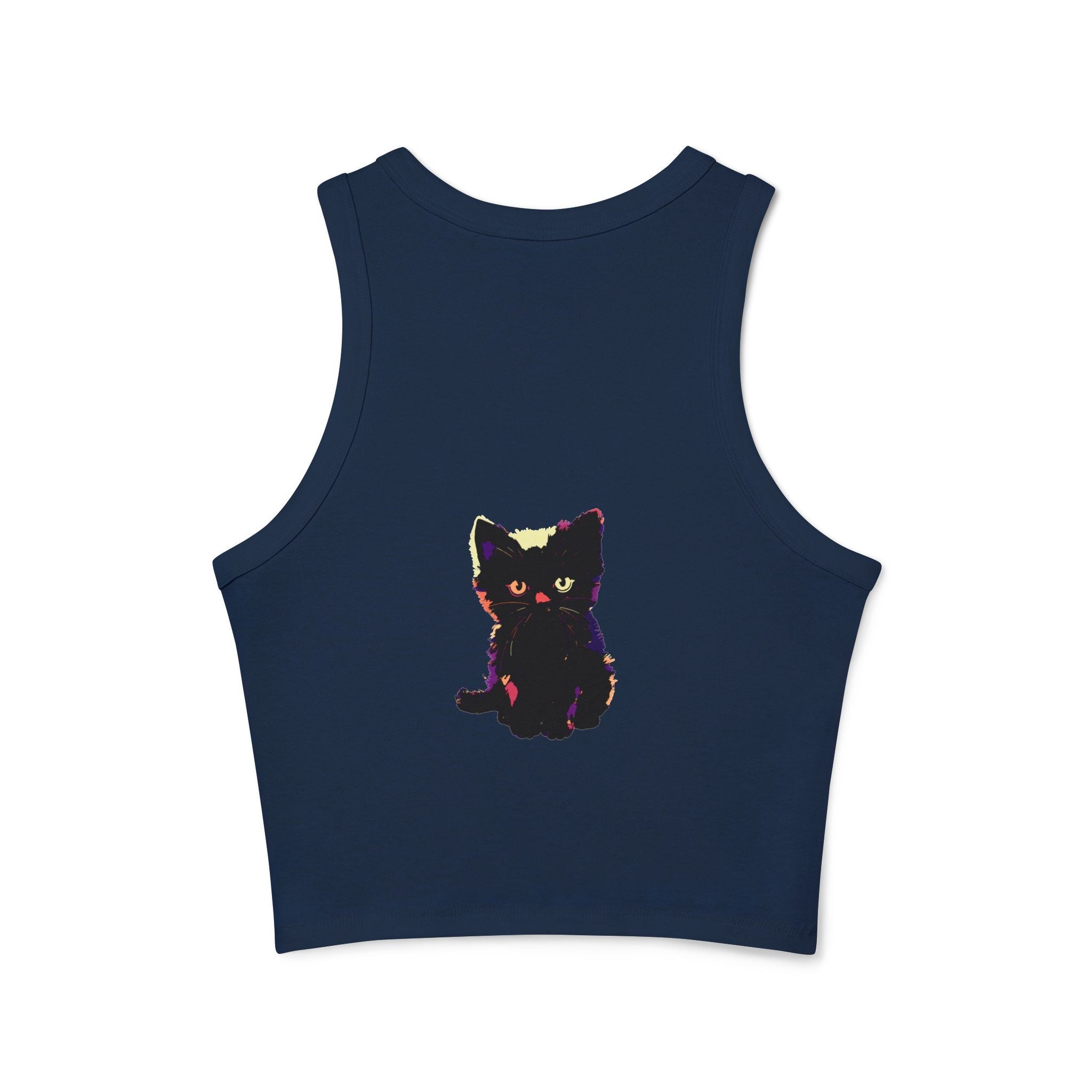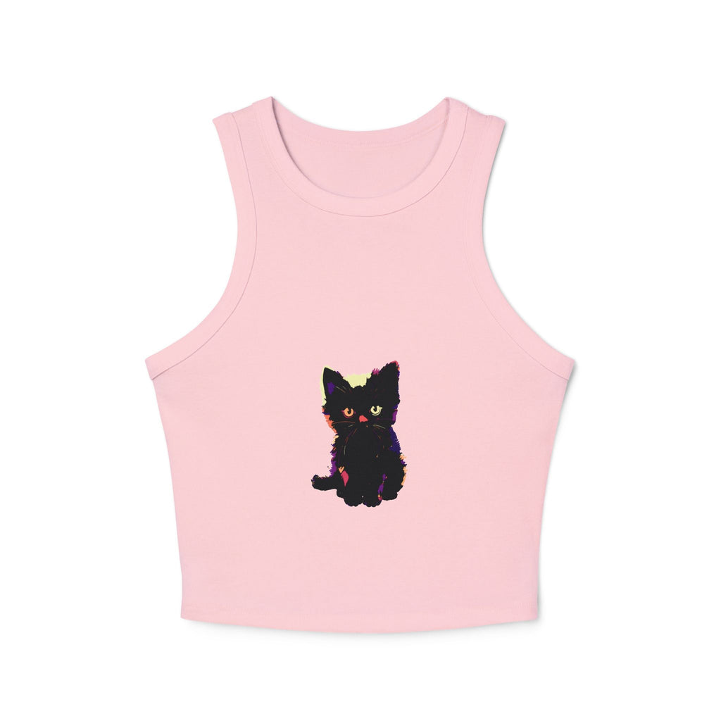 Indossare questa canotta trasforma la tua giornata in un'avventura giocosa. Ogni sguardo all'adorabile disegno del gatto nero suscita gioia e un senso di libertà, rendendola un'aggiunta essenziale al tuo guardaroba.