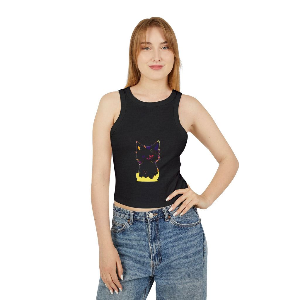 Immergiti in un regno di fantasia con la nostra incantevole canotta con schiena incrociata e una suggestiva illustrazione di un gatto nero. Questo design accattivante mette in mostra il fascino misterioso del felino, splendidamente reso in vivaci tonalità acquerellate che danzano insieme in un'incantevole composizione. Ogni pennellata racconta una storia, invitandoti ad abbracciare il tuo amore per l'arte felina e aggiungendo un tocco di colore al tuo abbigliamento casual.