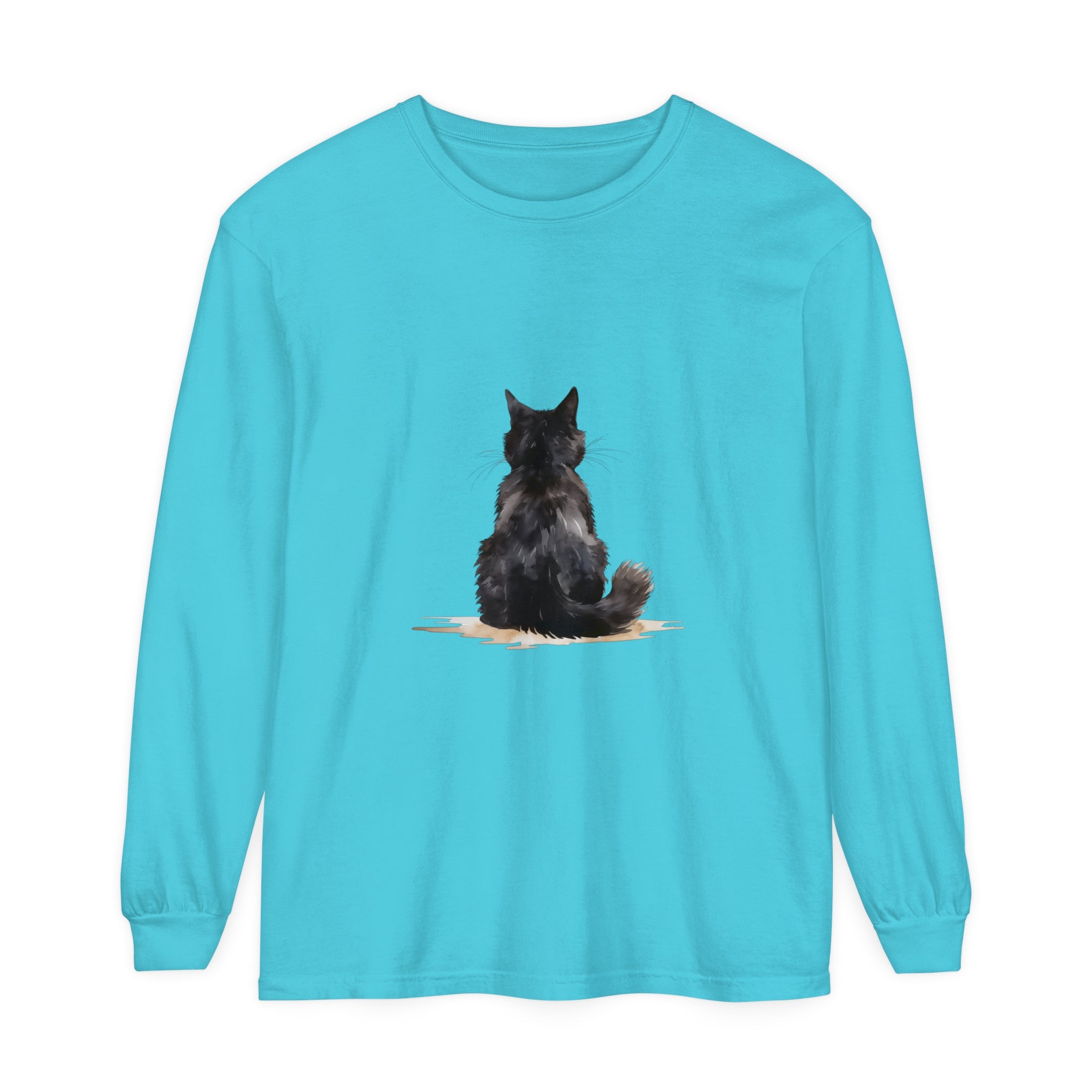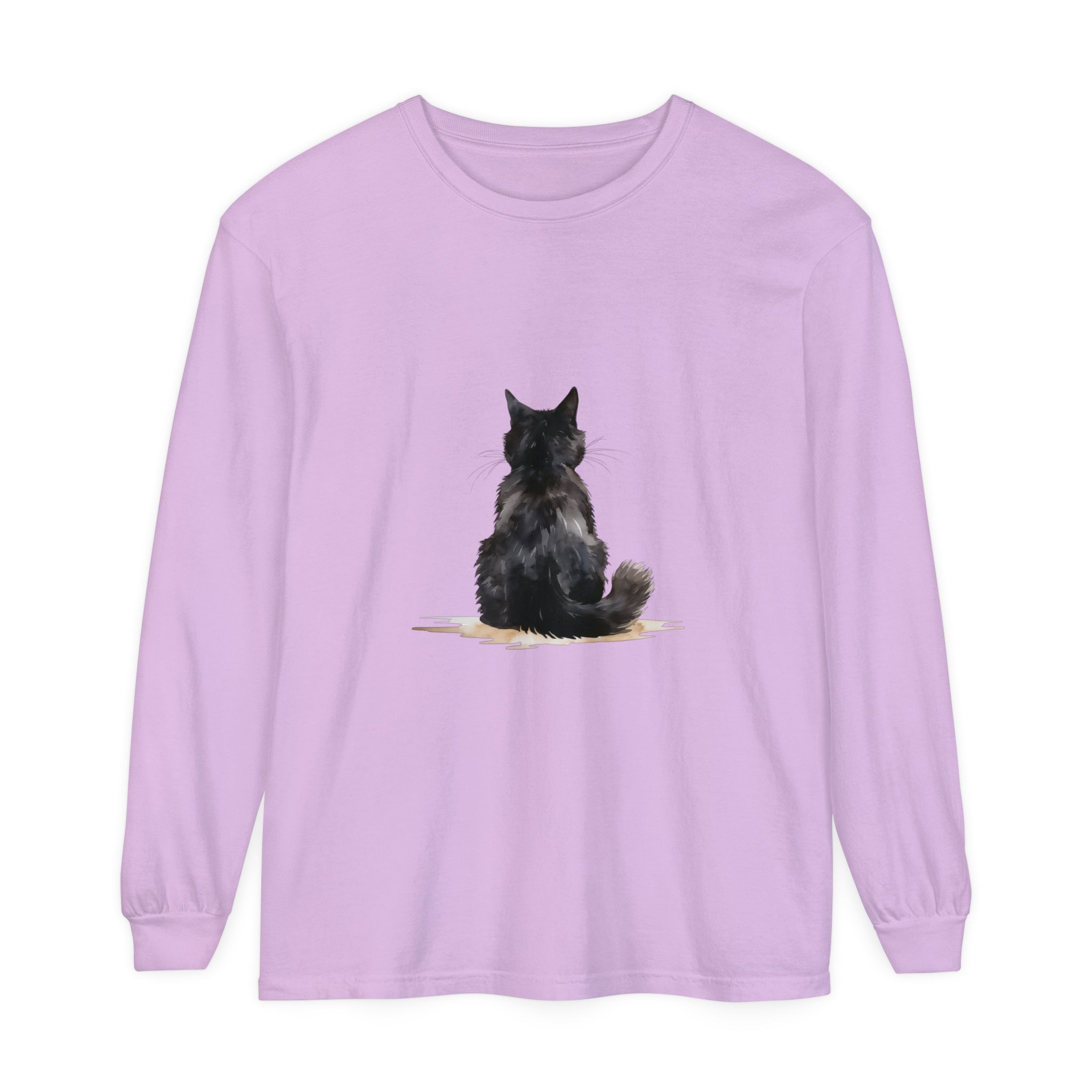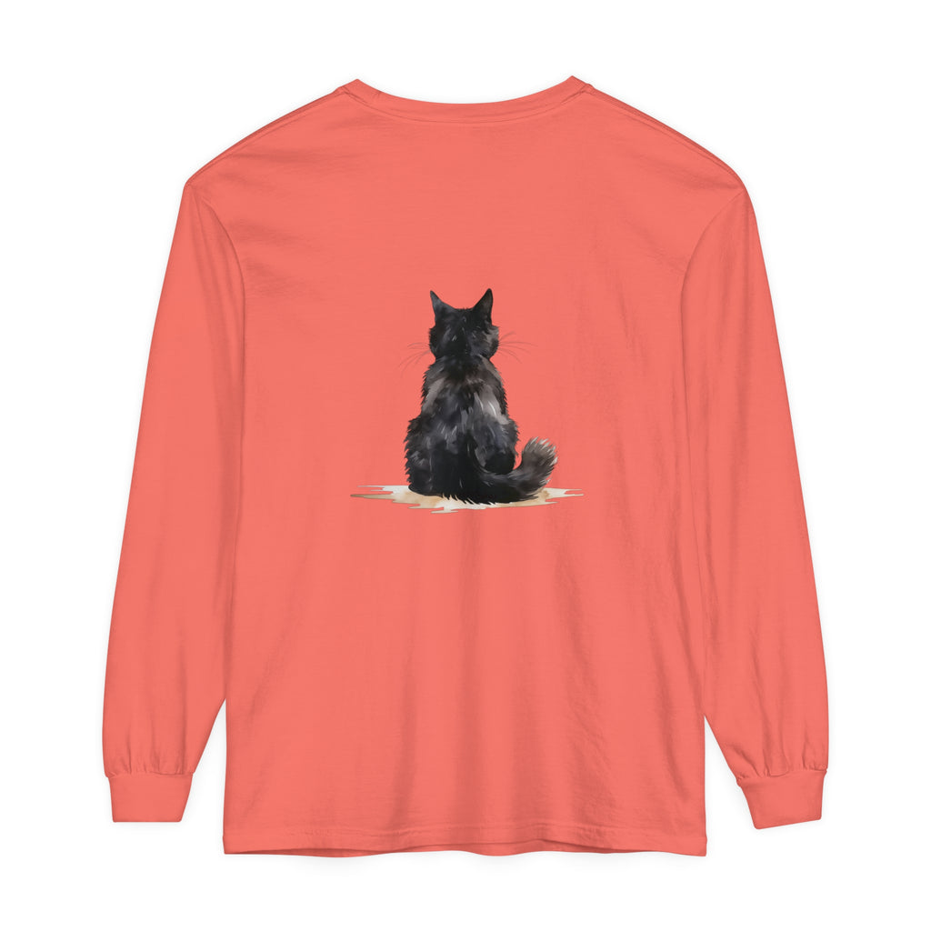 A stylish unisex long sleeve t-shirt featuring a watercolor design of a black cat