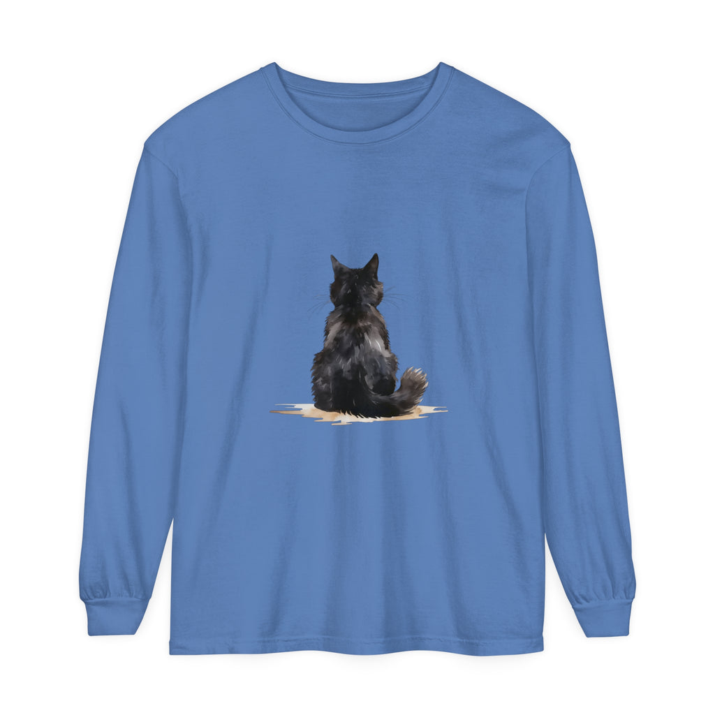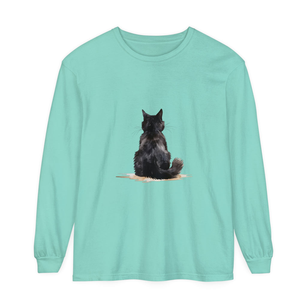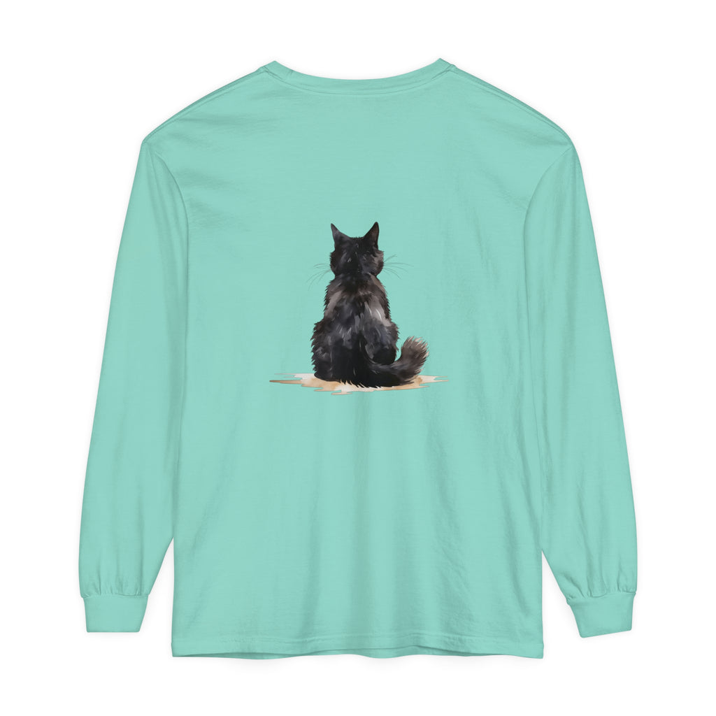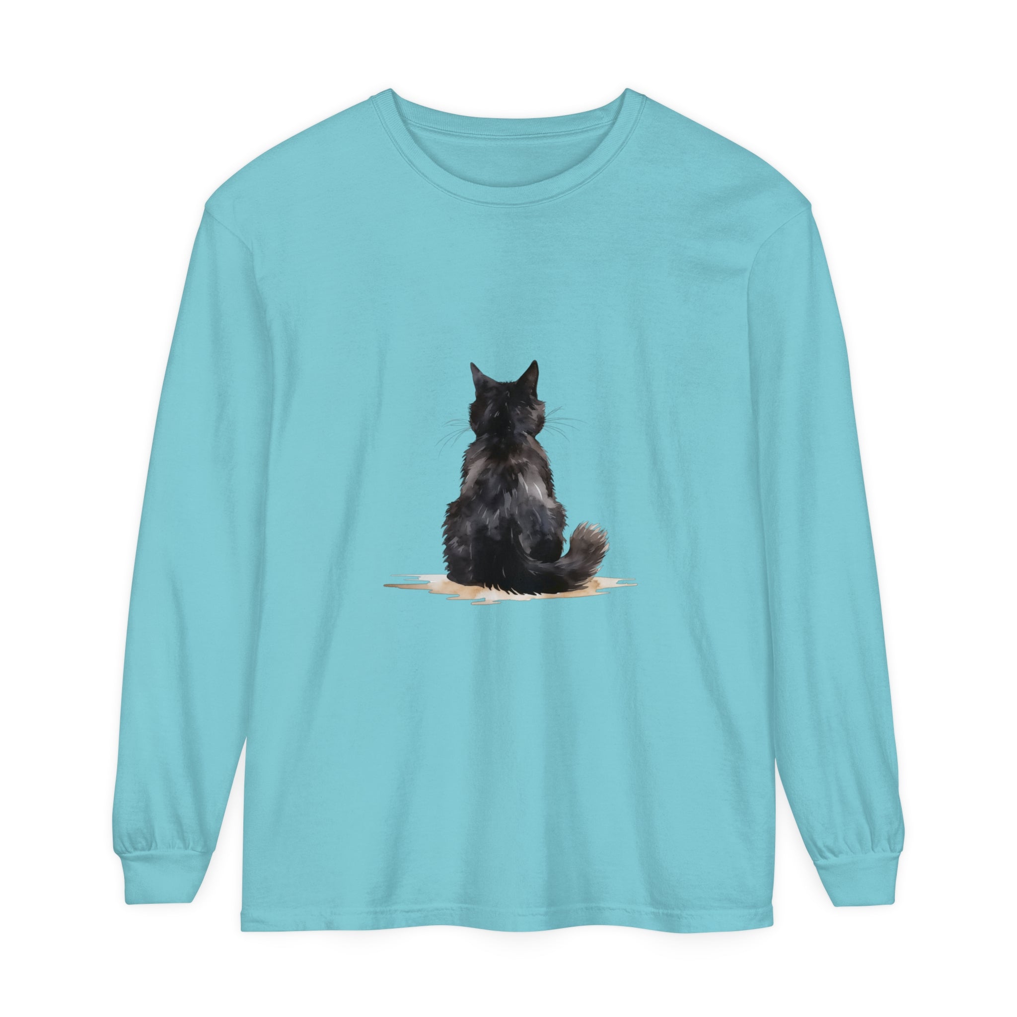 A stylish unisex long sleeve t-shirt featuring a watercolor design of a black cat