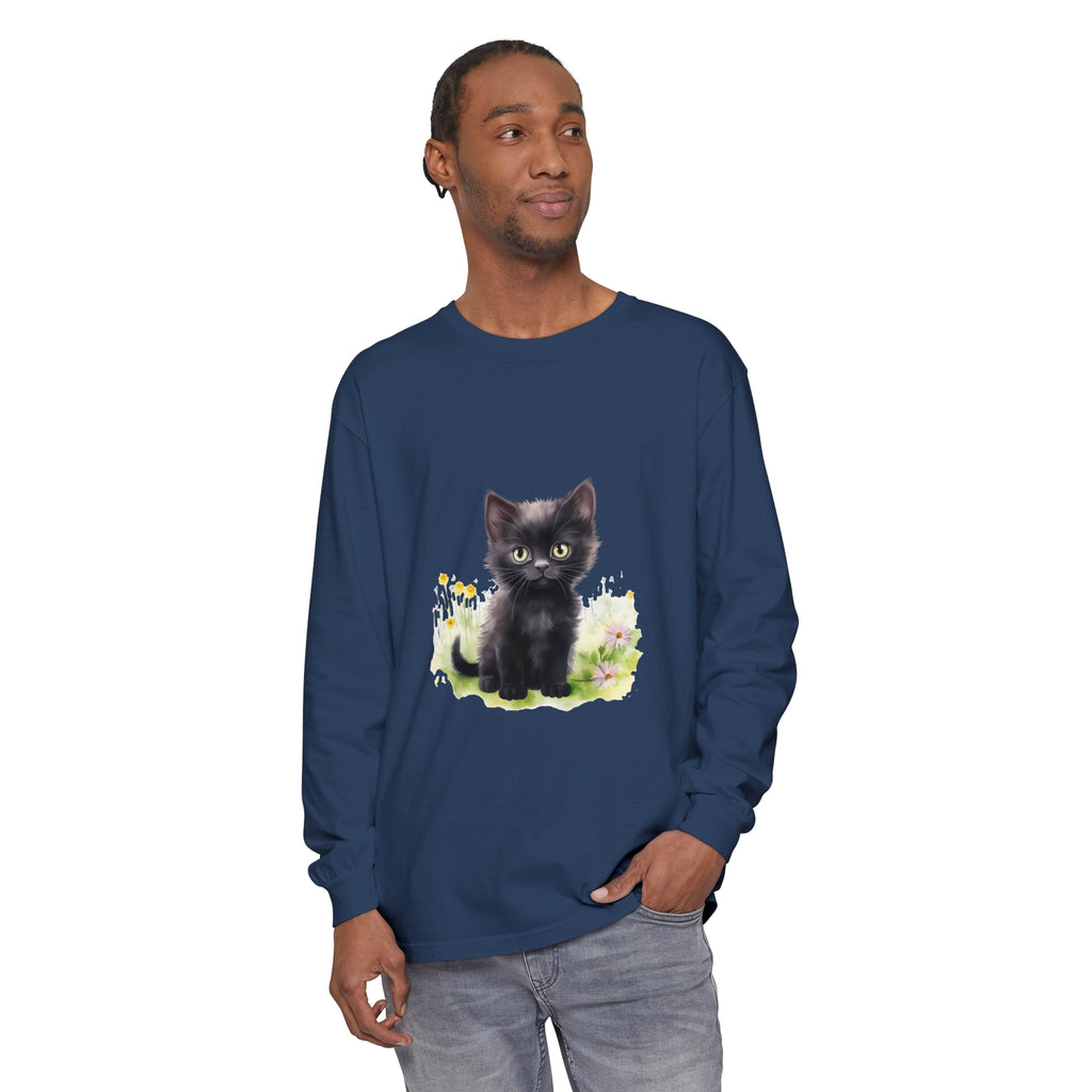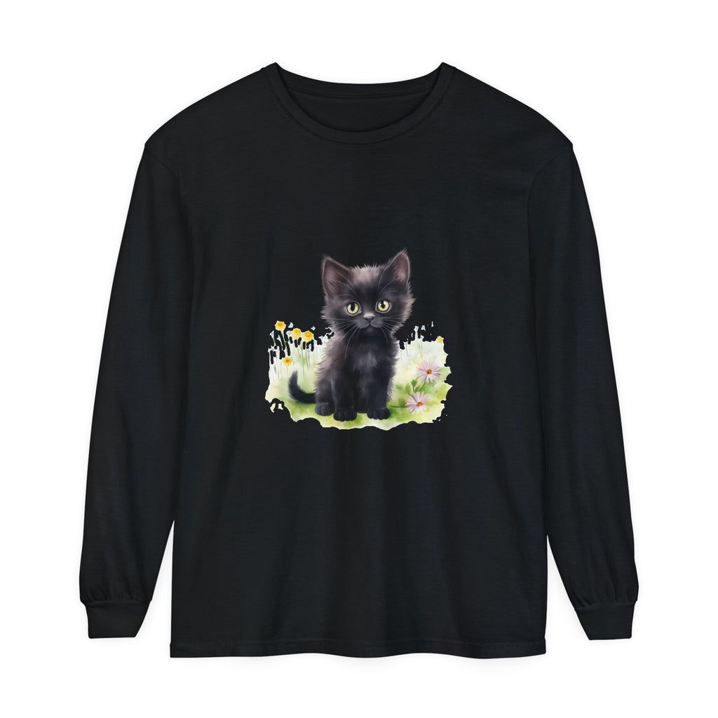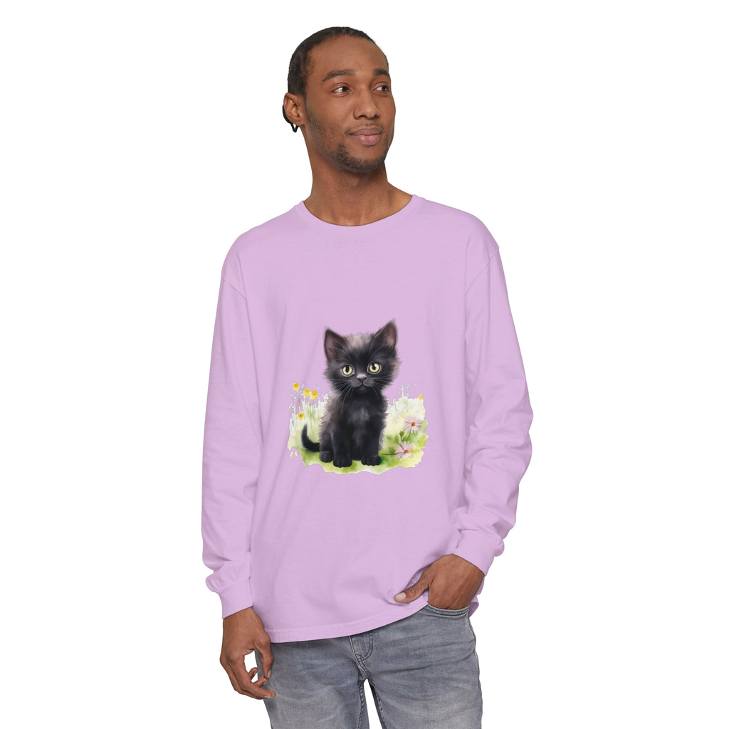 Adorable black kitten surrounded by colorful flowers on a cozy long sleeve t-shirt
