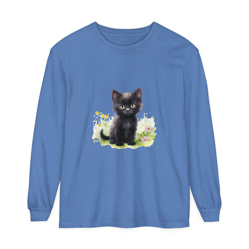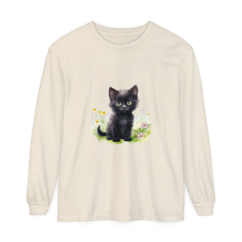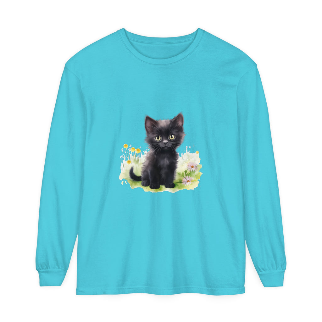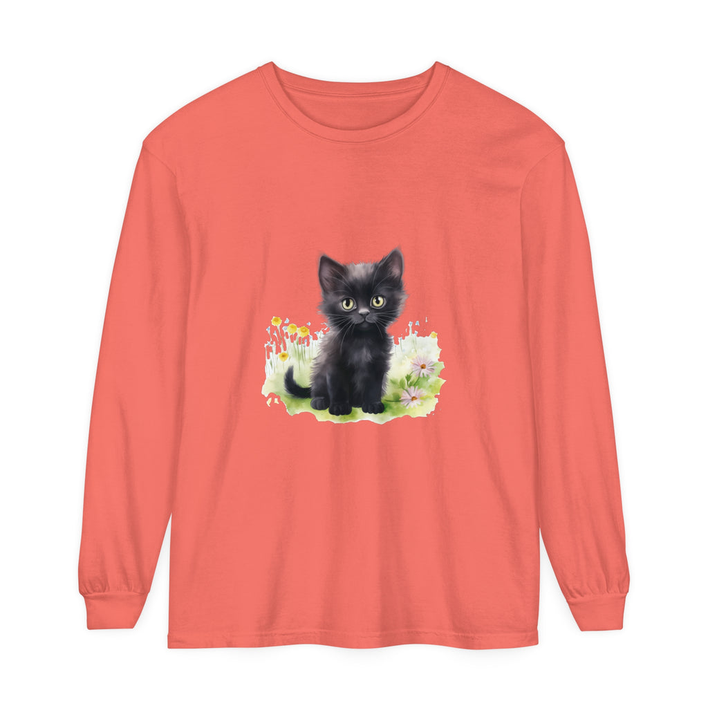 Adorable black kitten surrounded by colorful flowers on a cozy long sleeve t-shirt