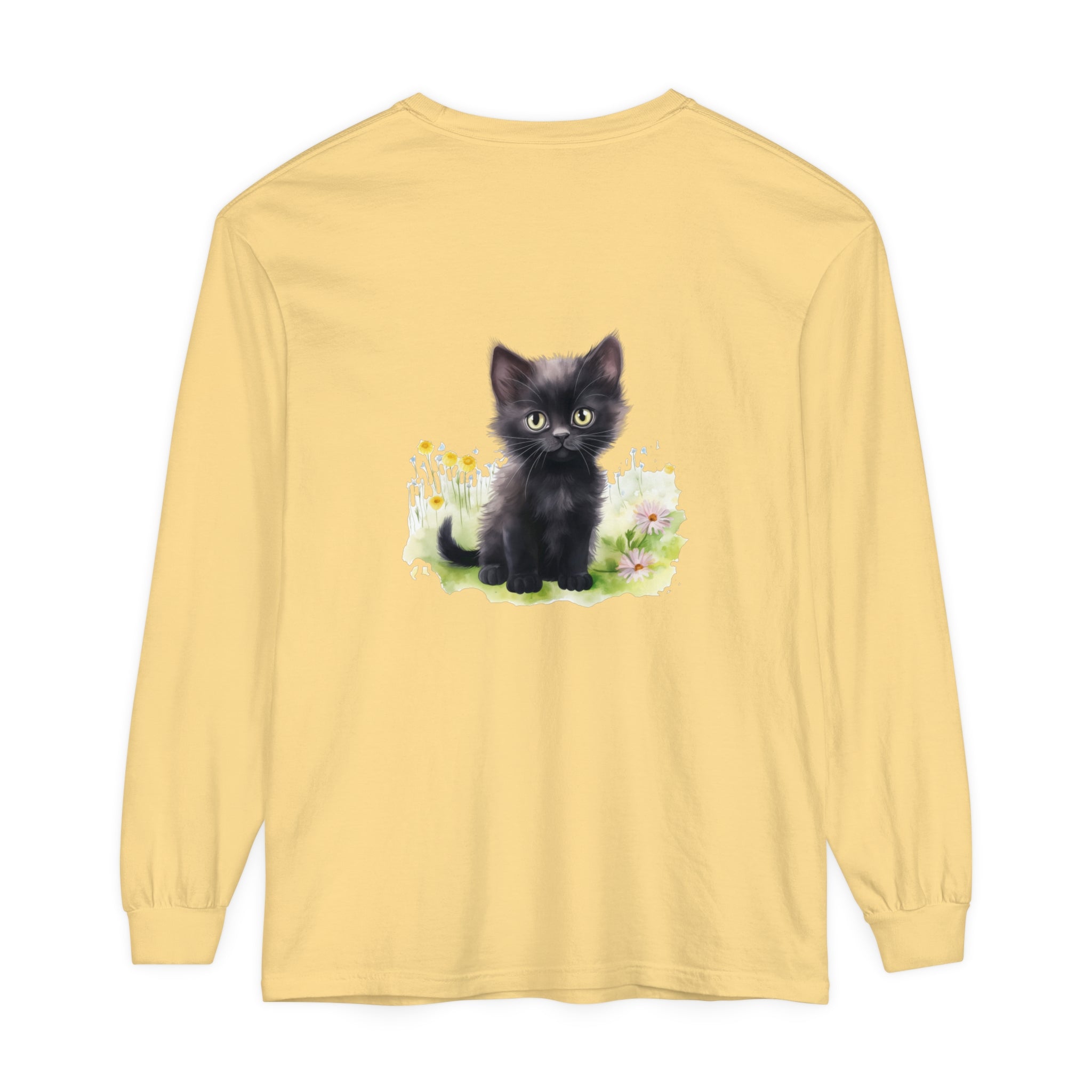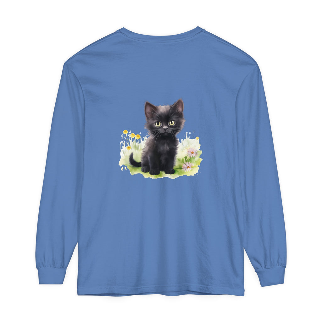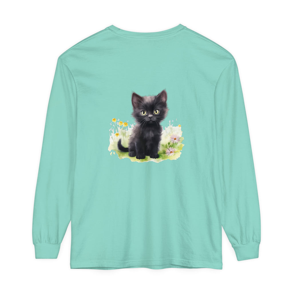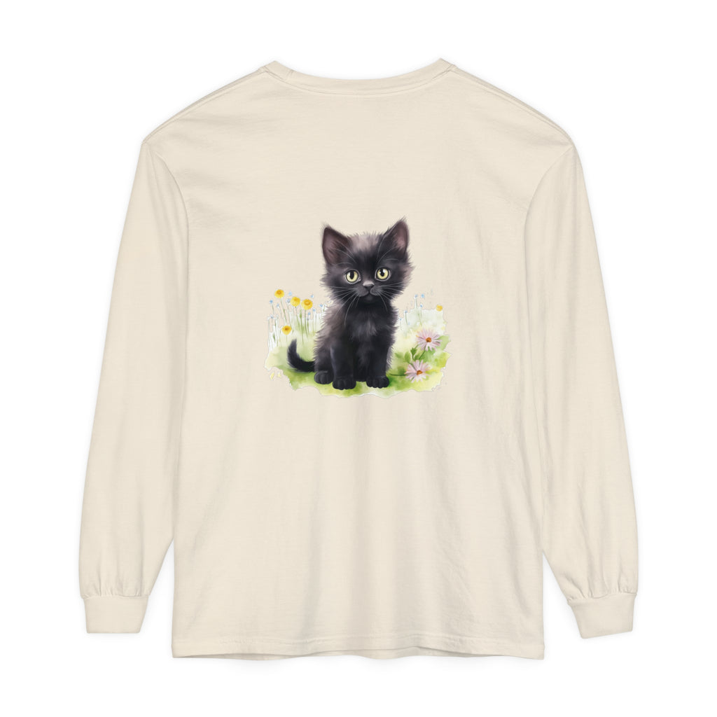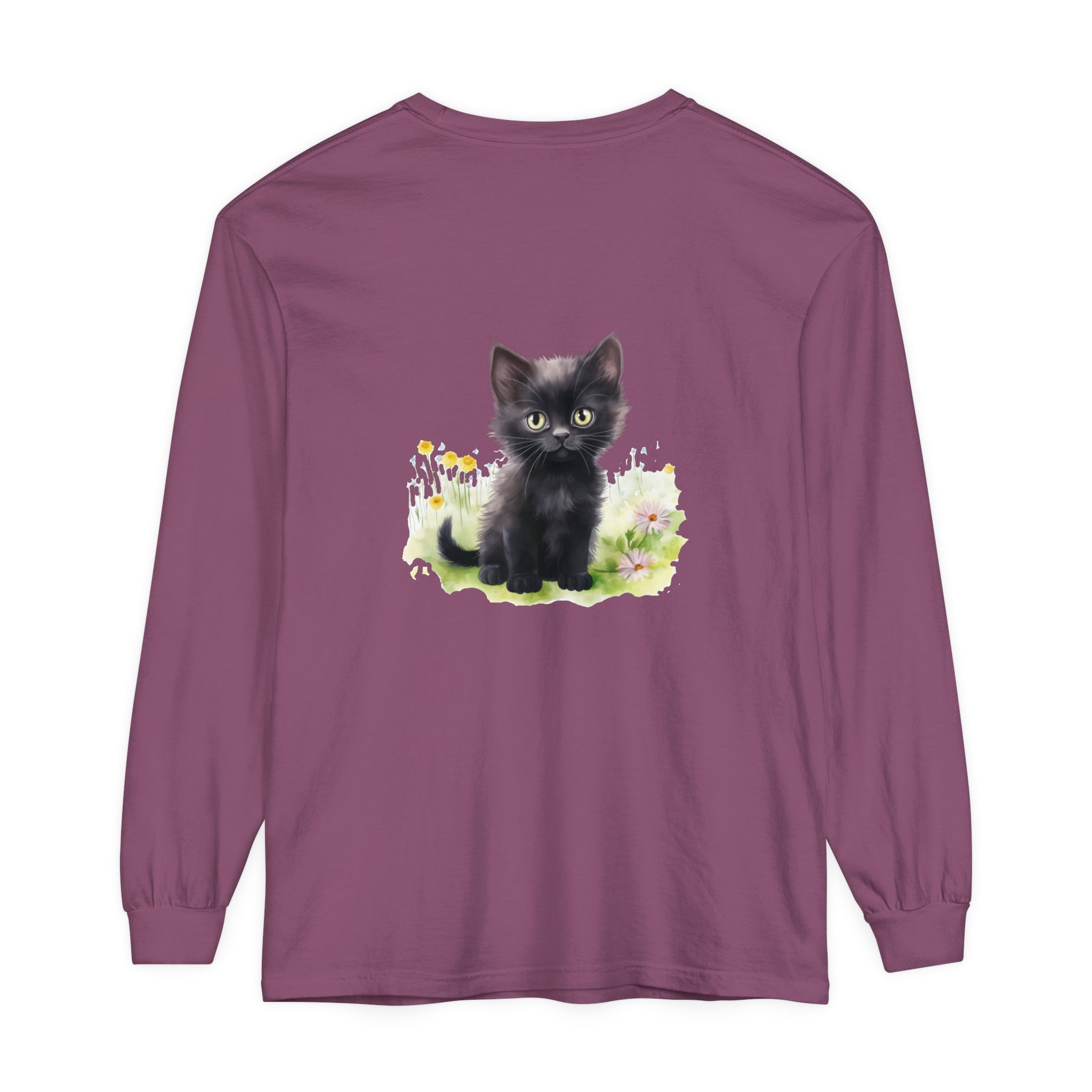 A long sleeve t-shirt featuring a black kitten surrounded by colorful flowers in a garden setting