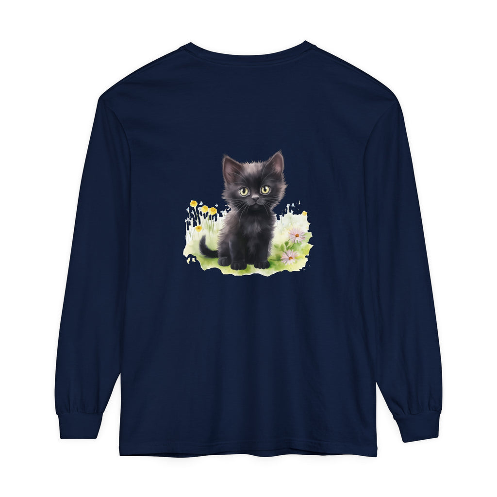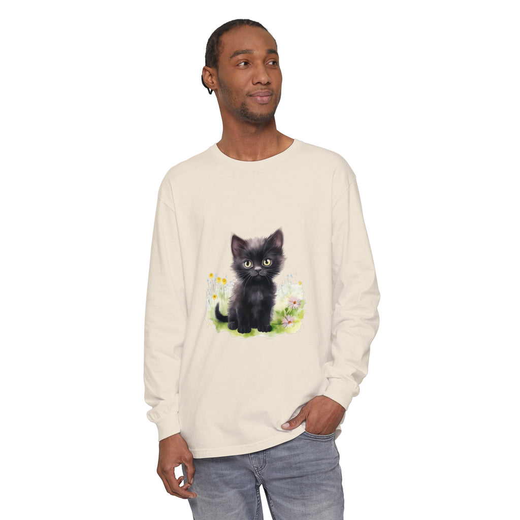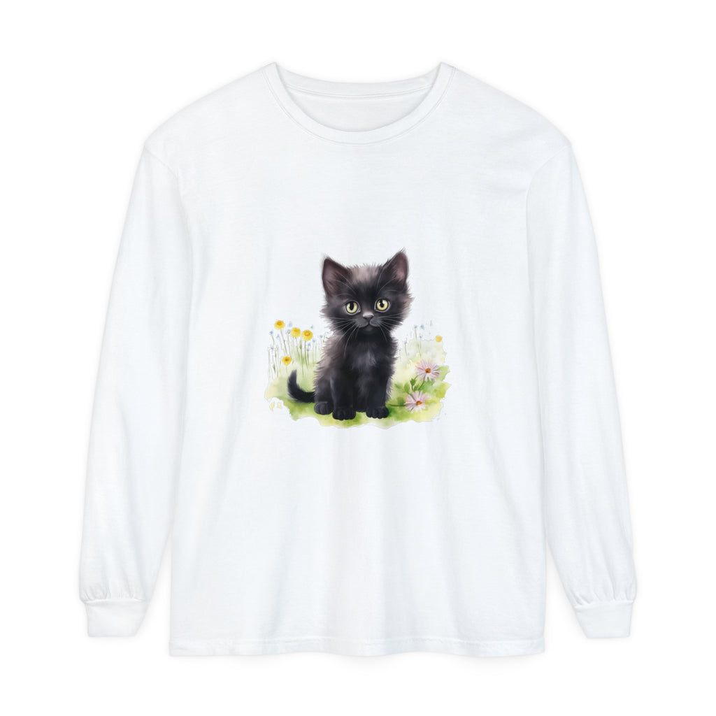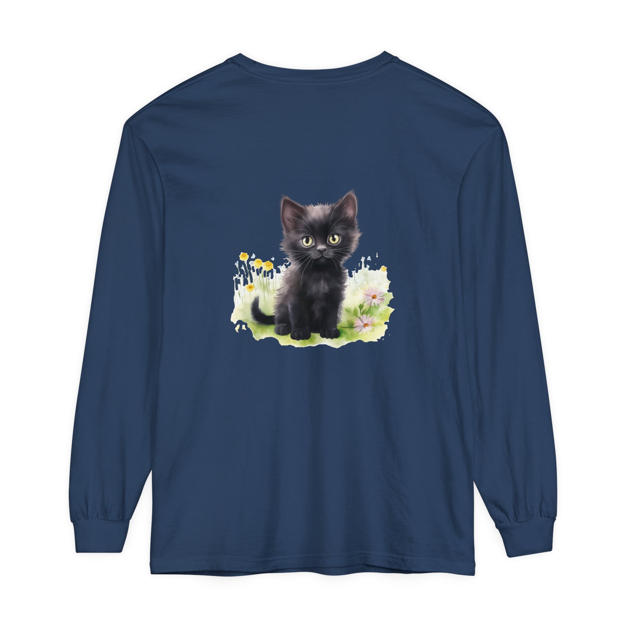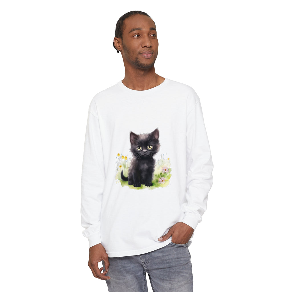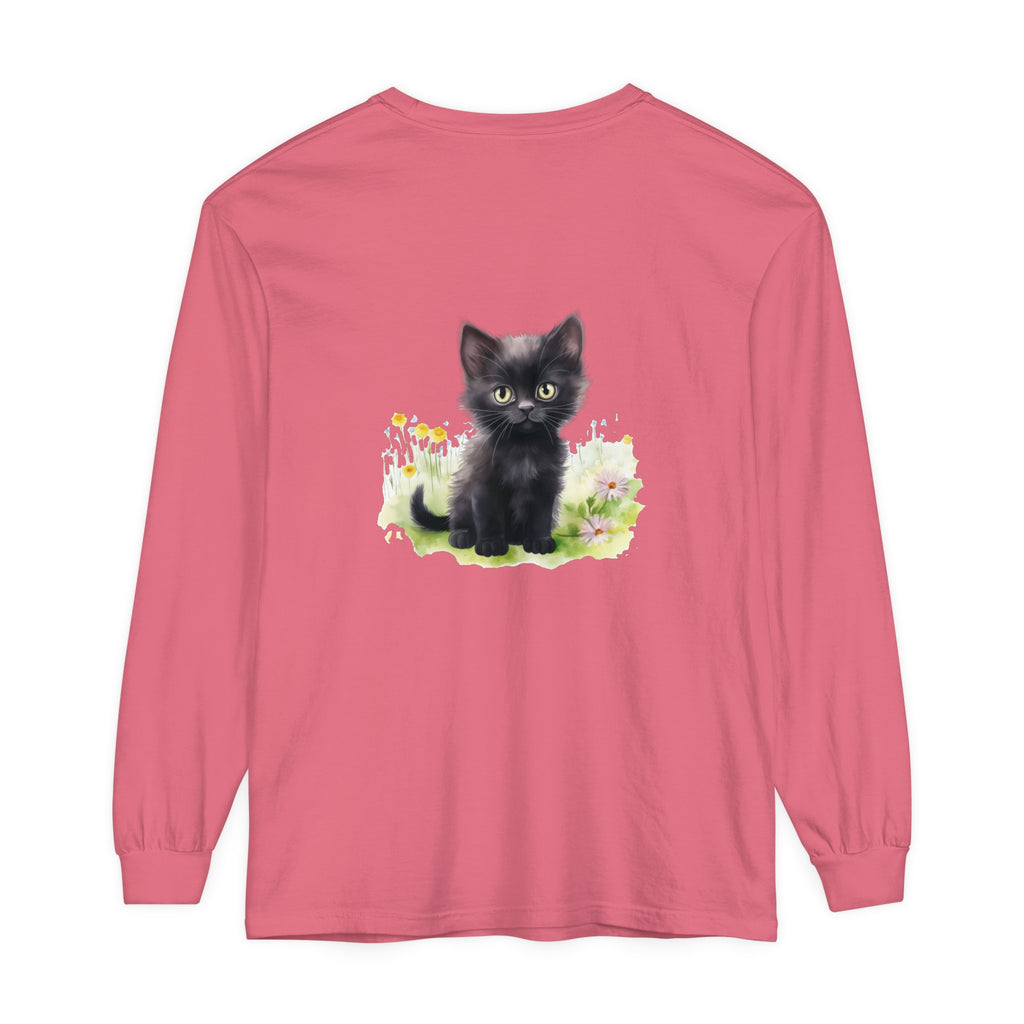 A long sleeve t-shirt featuring a black kitten surrounded by colorful flowers in a garden setting