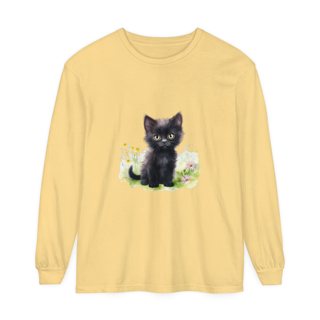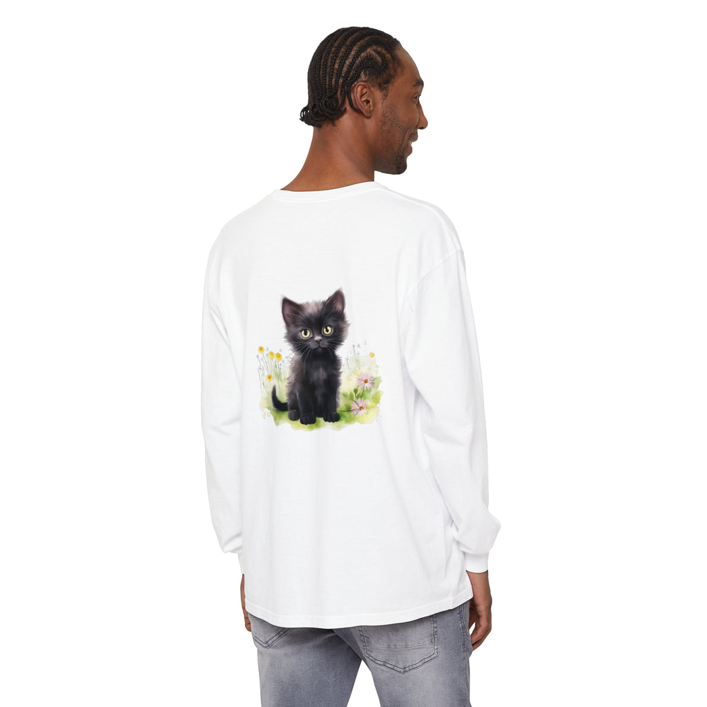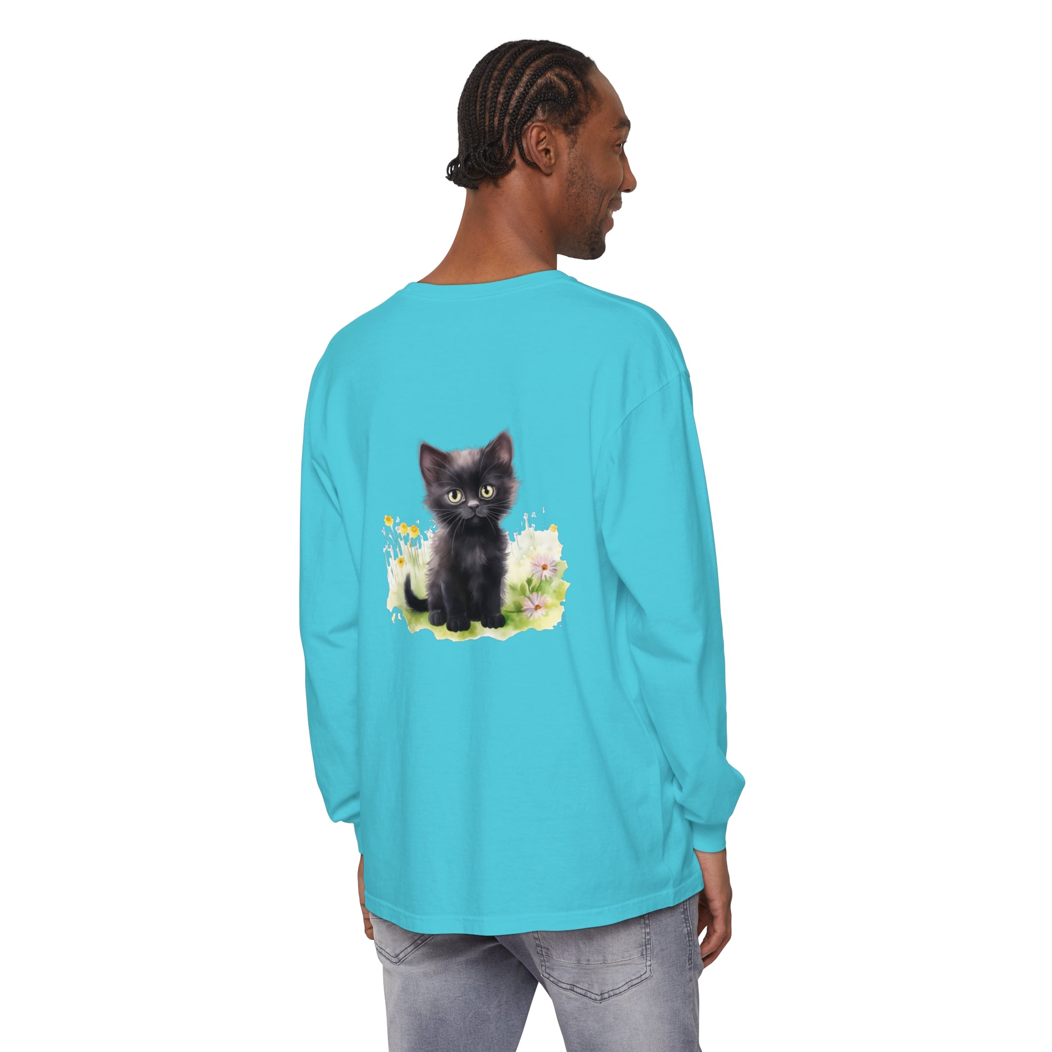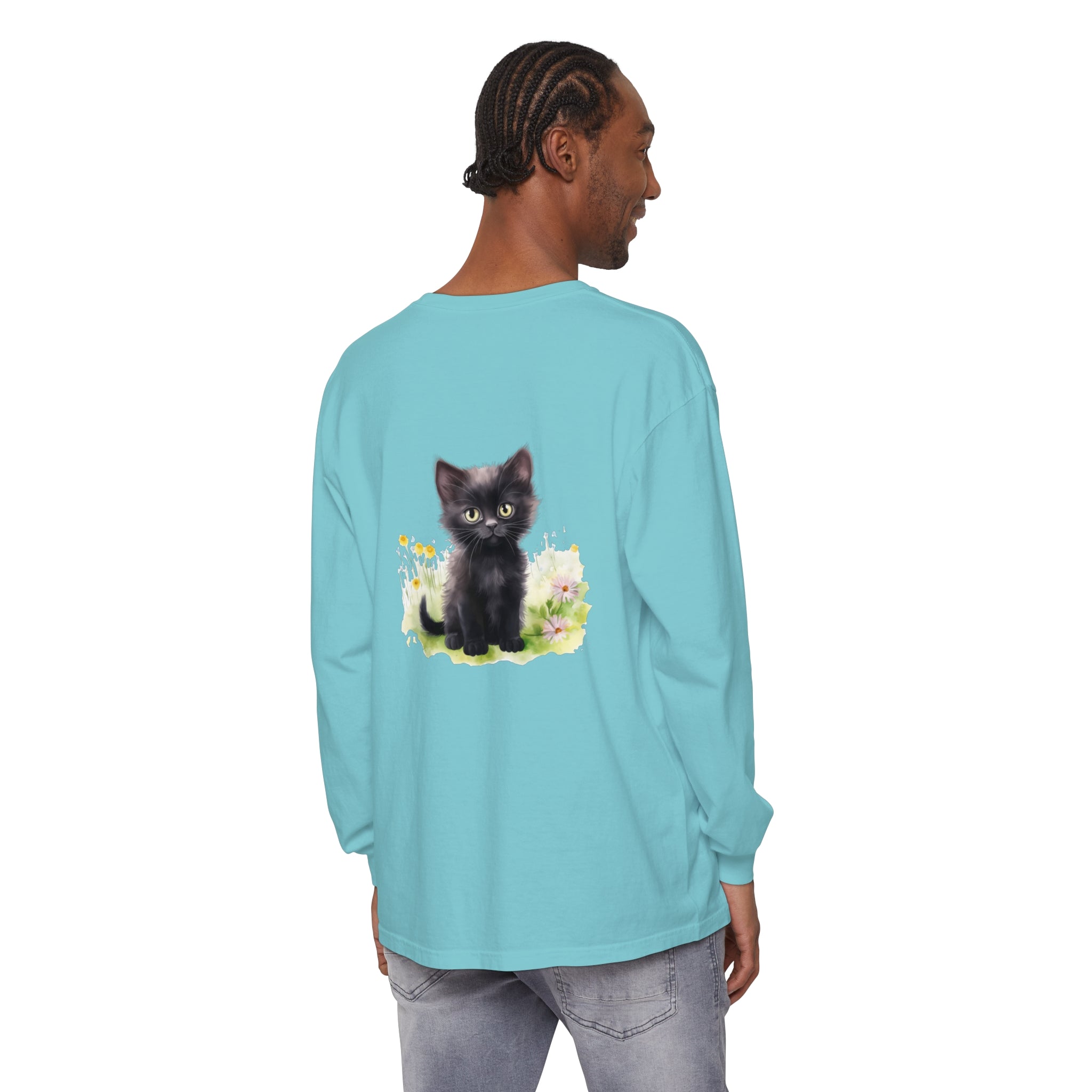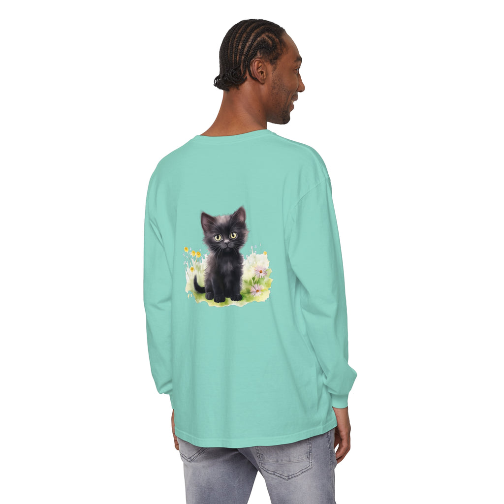 A long sleeve t-shirt featuring a black kitten surrounded by colorful flowers in a garden setting