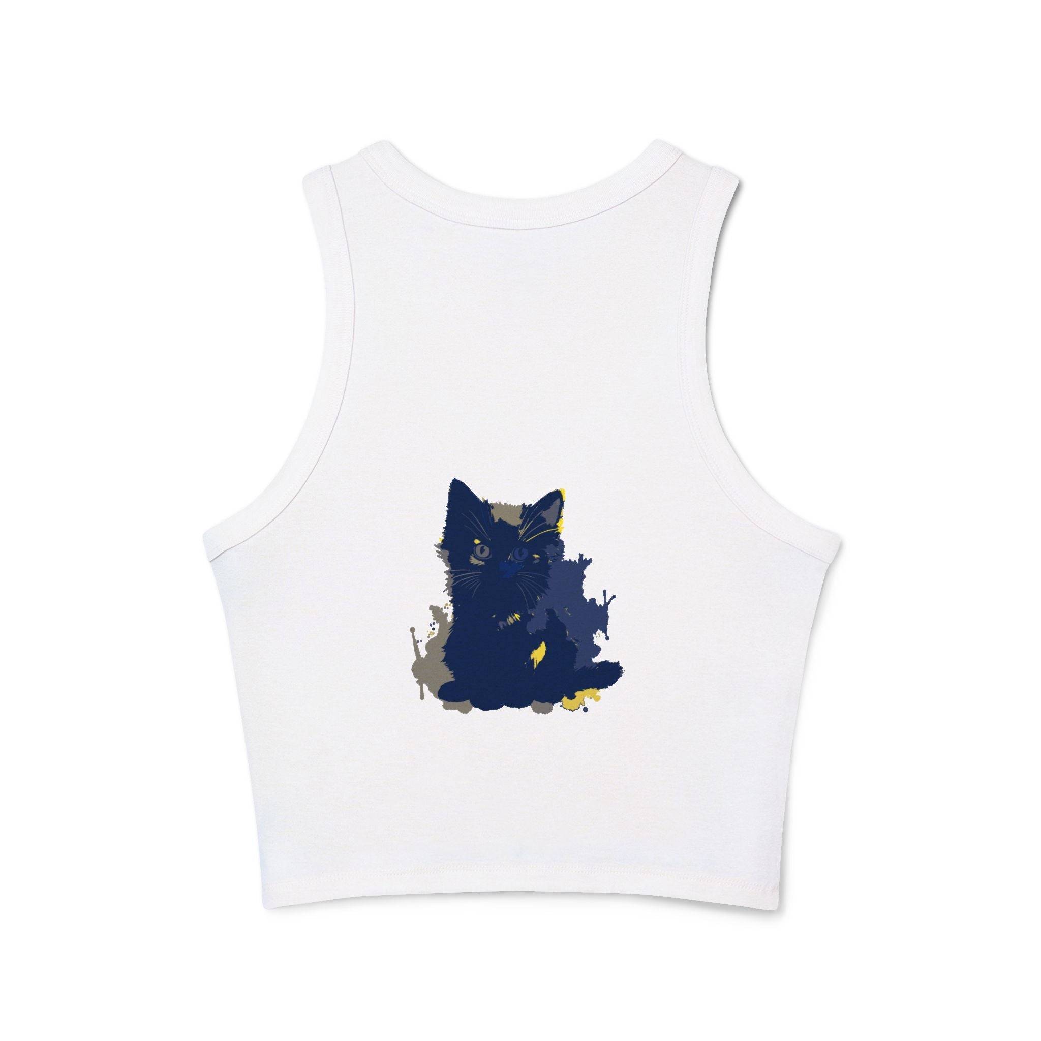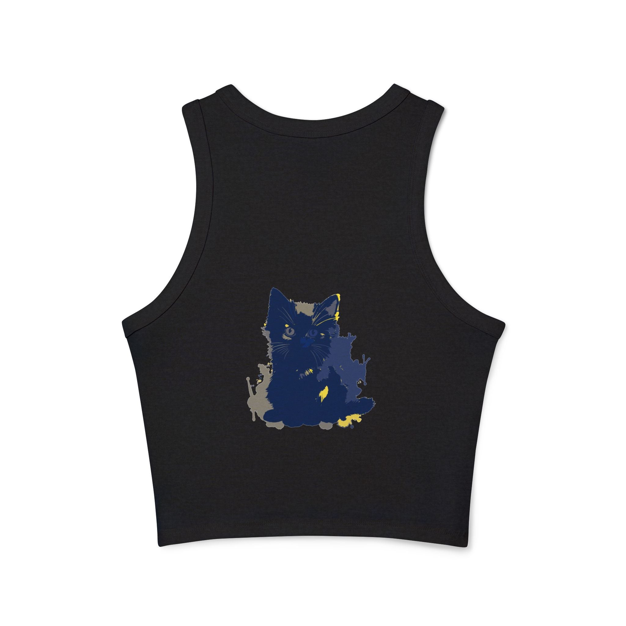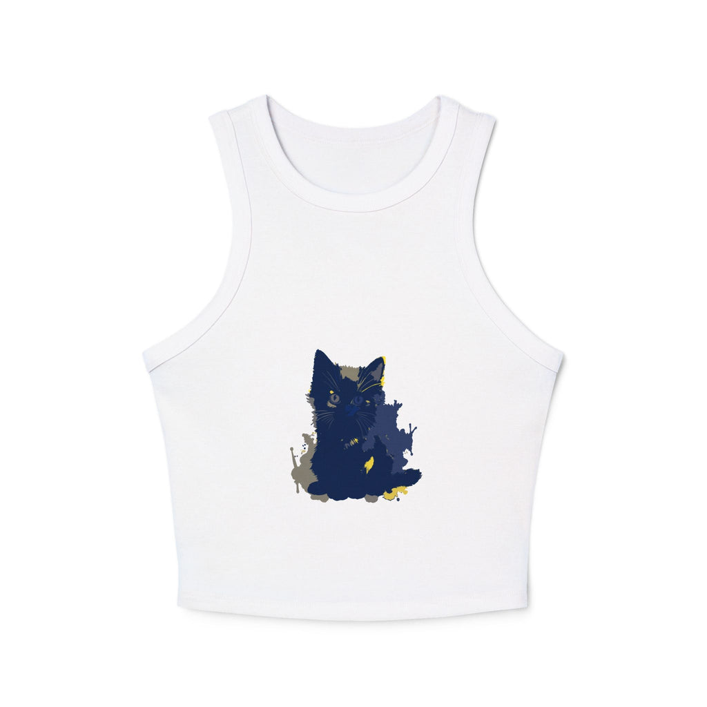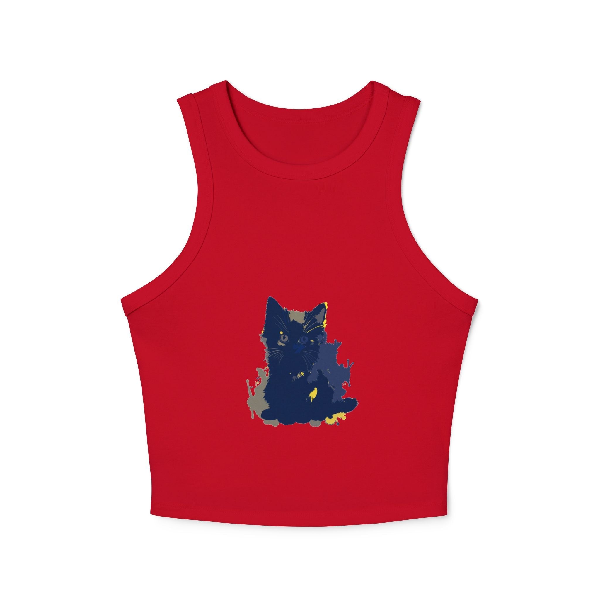 Canotta artistica con schiena scoperta e motivo a gatto per un'atmosfera estiva giocosa