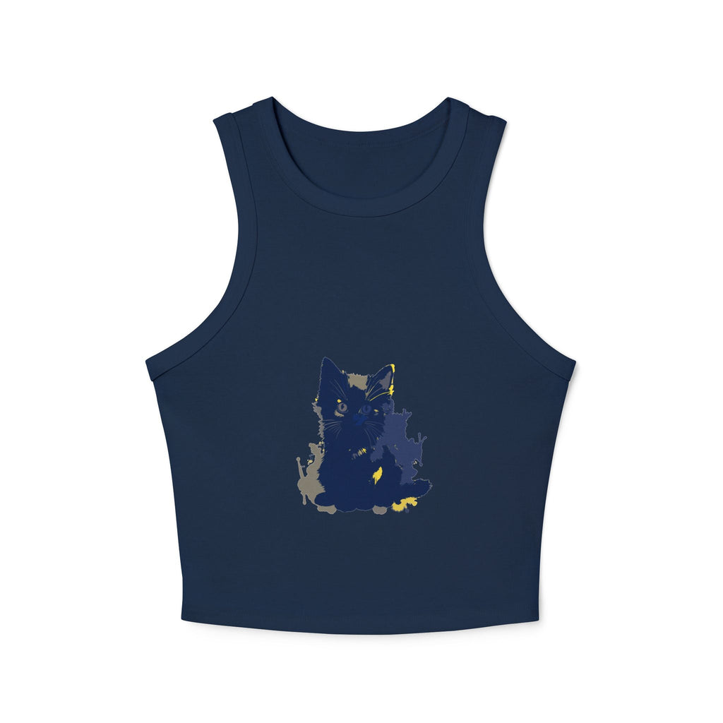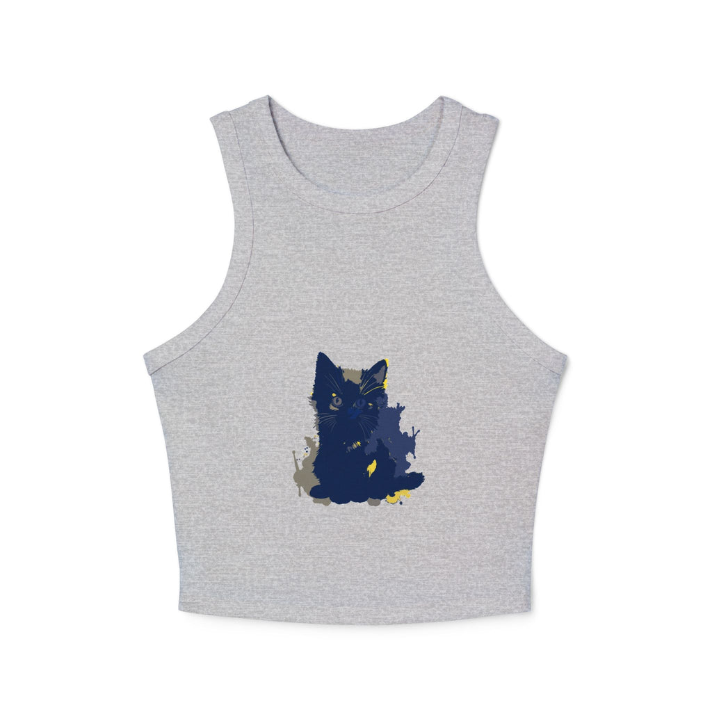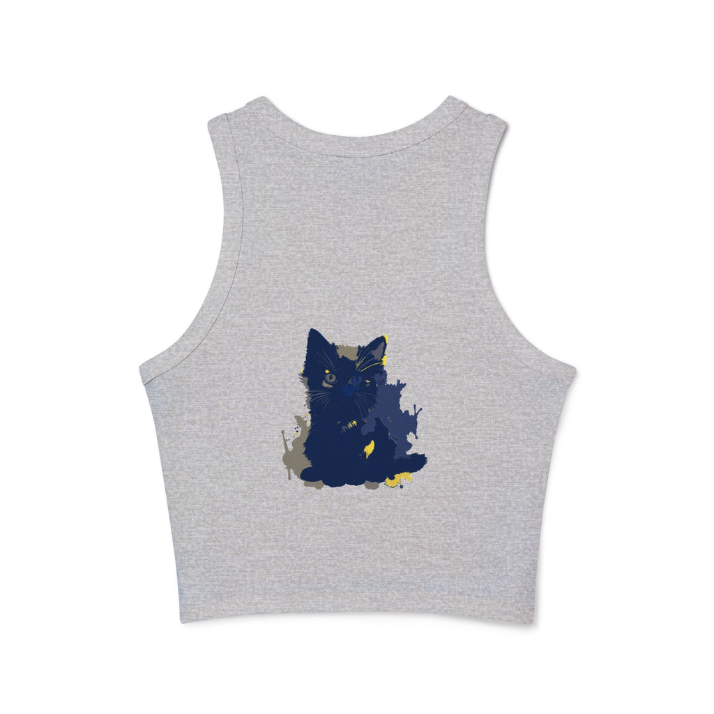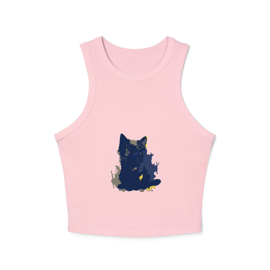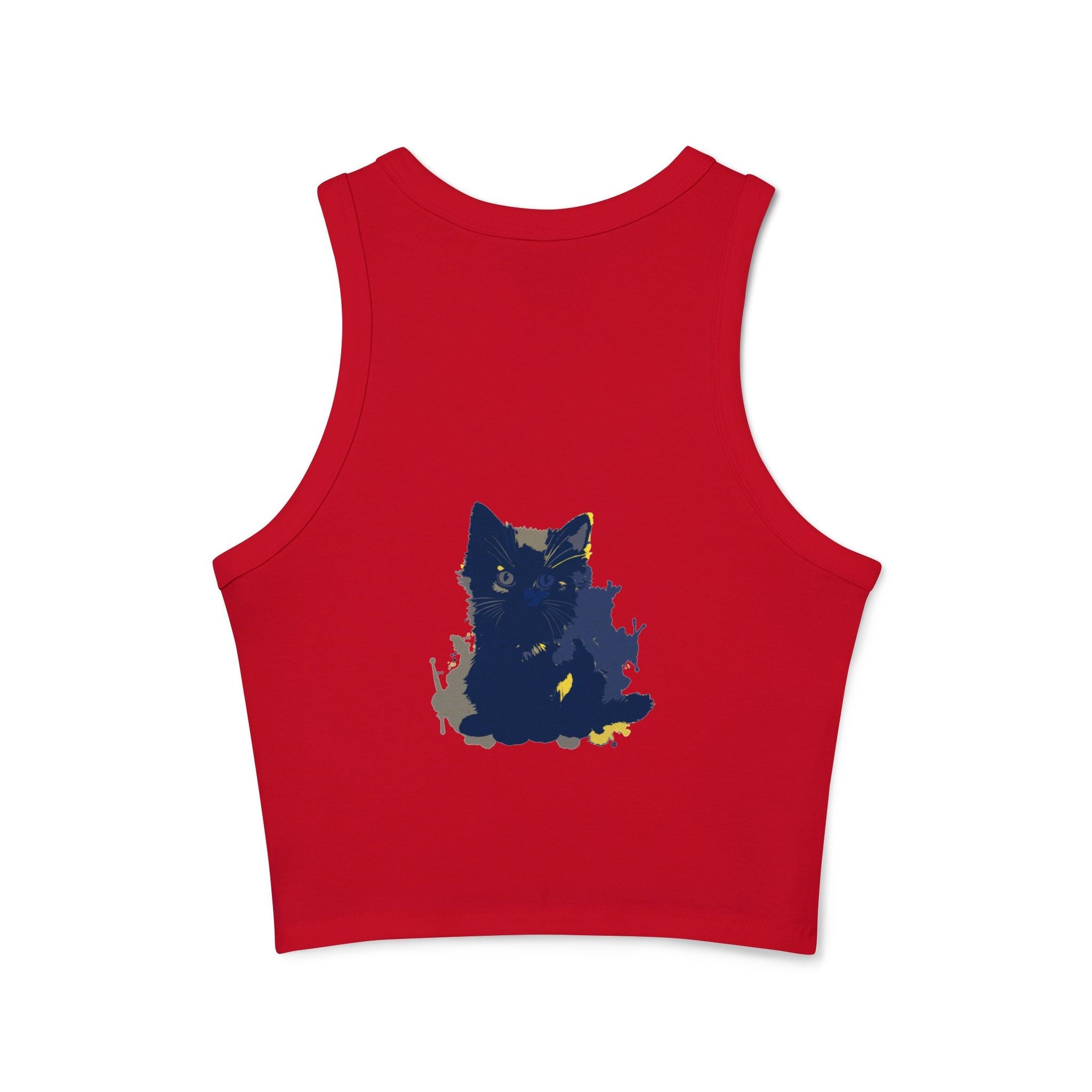 Canotta artistica con schiena scoperta e motivo a gatto per un'atmosfera estiva giocosa