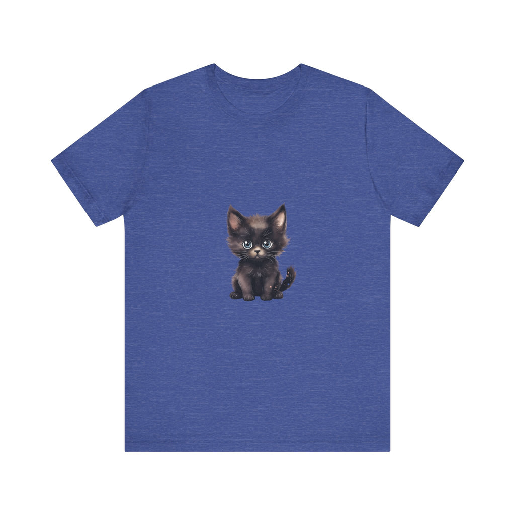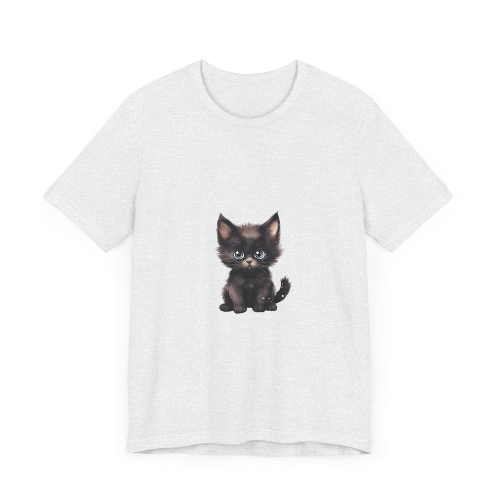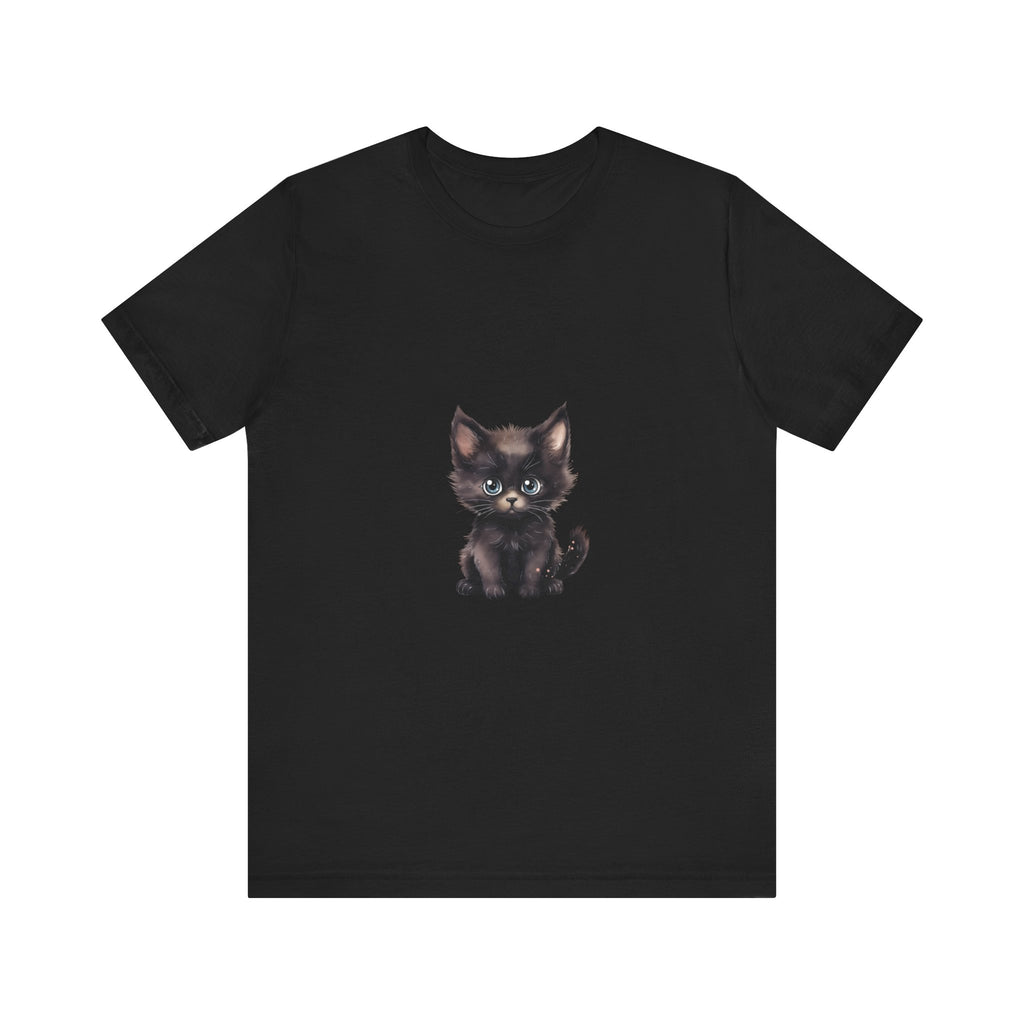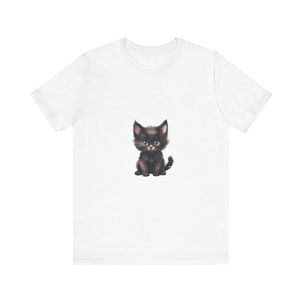 Celebra il tuo amore per i felini con questa incantevole t-shirt raffigurante un grazioso gattino nero dagli incantevoli occhi azzurri. Questo adorabile design ti cattura, evocando un senso di gioia e calore, rendendolo un'aggiunta deliziosa al guardaroba di ogni amante dei gatti.