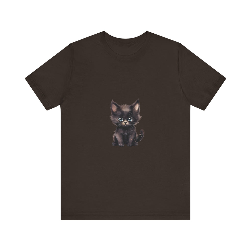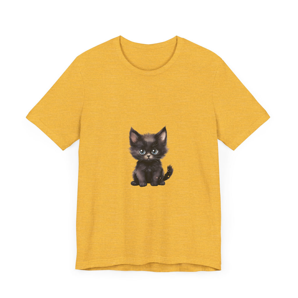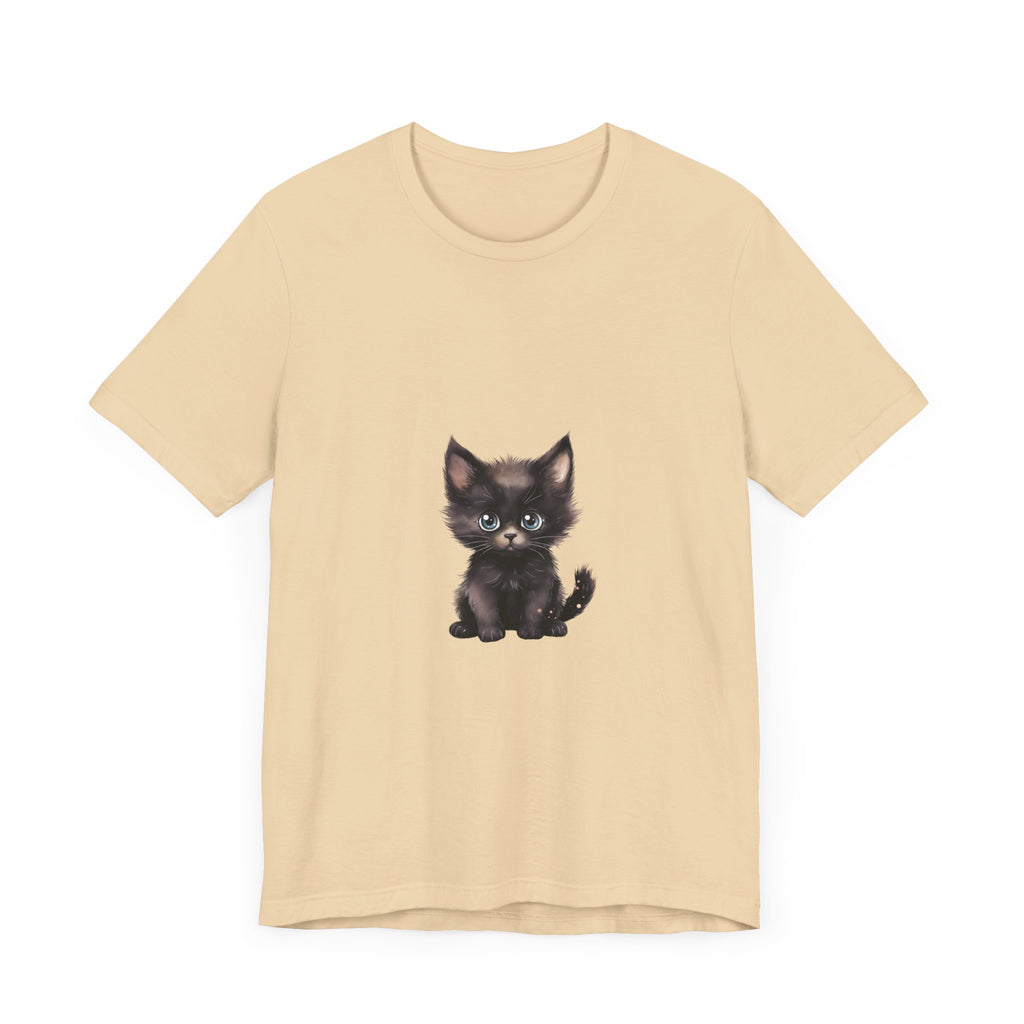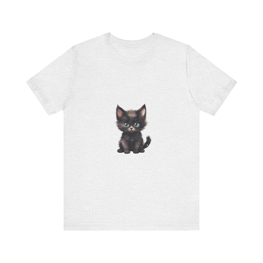 Celebra il tuo amore per i felini con questa incantevole t-shirt raffigurante un grazioso gattino nero dagli incantevoli occhi azzurri. Questo adorabile design ti cattura, evocando un senso di gioia e calore, rendendolo un'aggiunta deliziosa al guardaroba di ogni amante dei gatti.