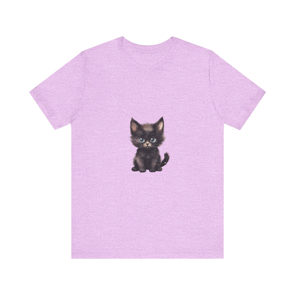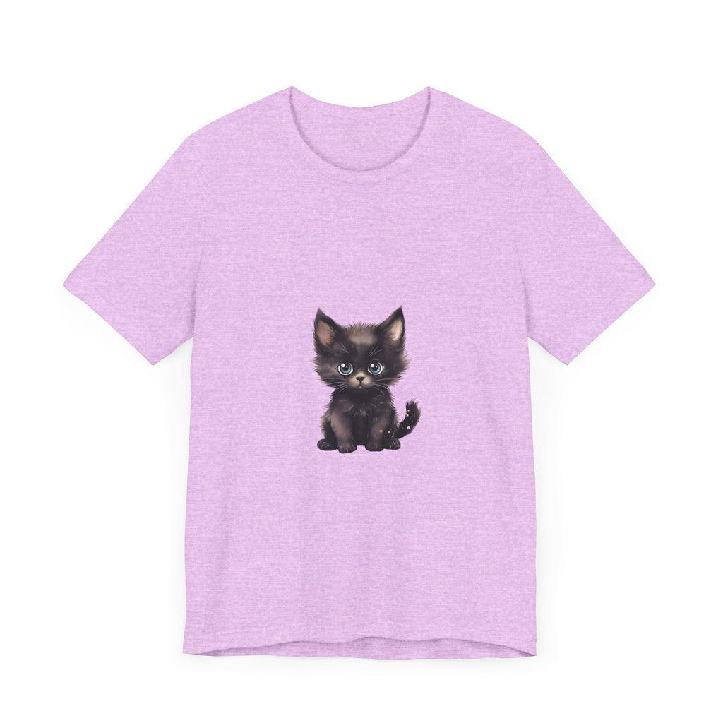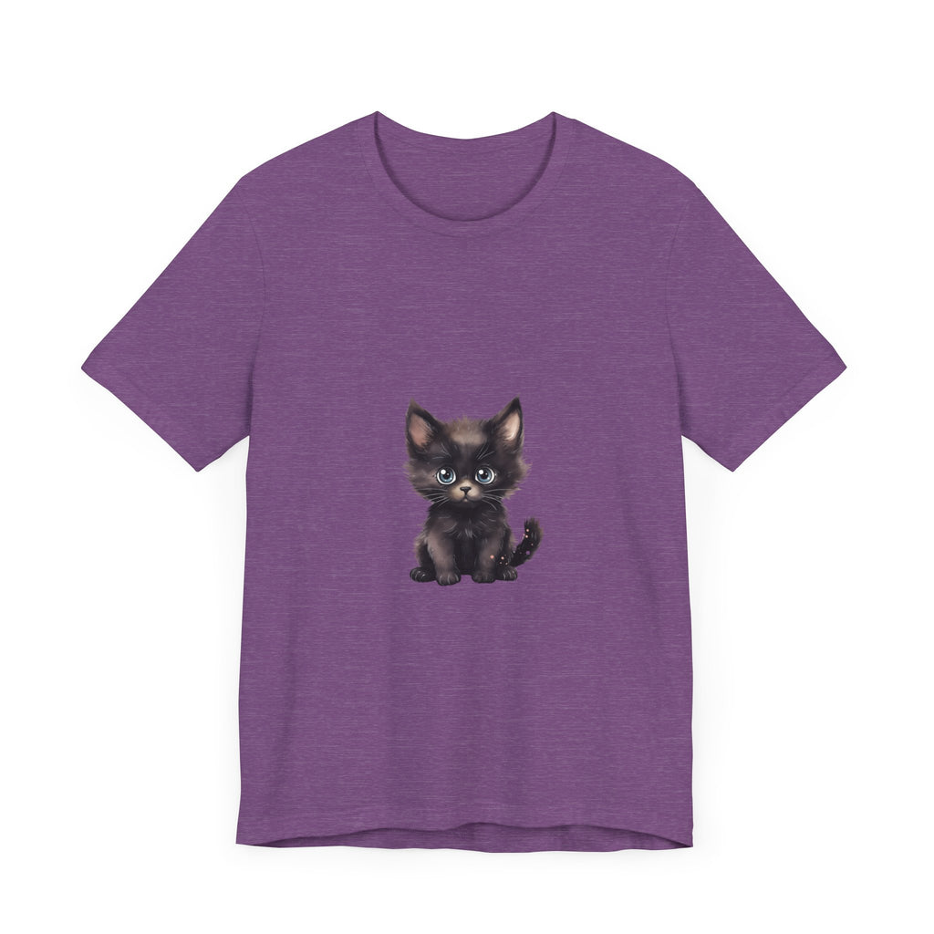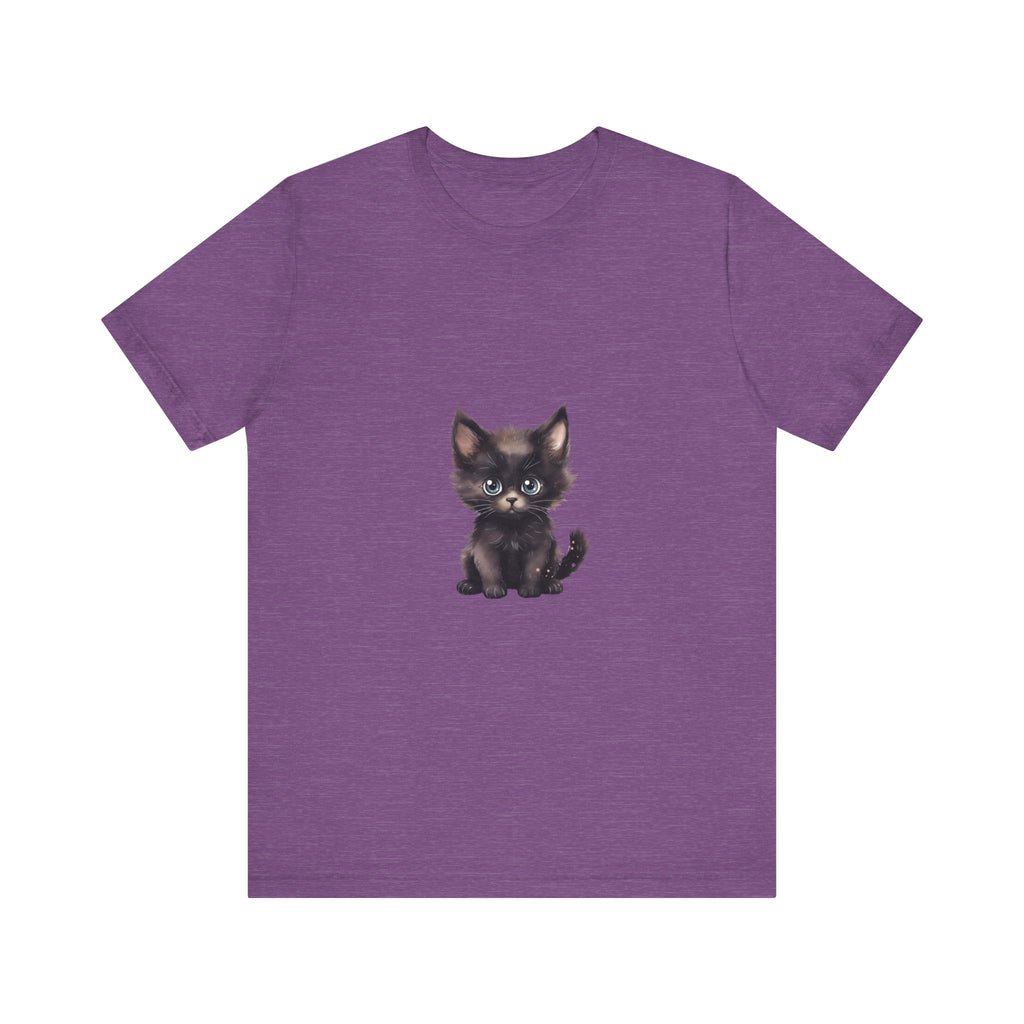 Celebra il tuo amore per i felini con questa incantevole t-shirt raffigurante un grazioso gattino nero dagli incantevoli occhi azzurri. Questo adorabile design ti cattura, evocando un senso di gioia e calore, rendendolo un'aggiunta deliziosa al guardaroba di ogni amante dei gatti.