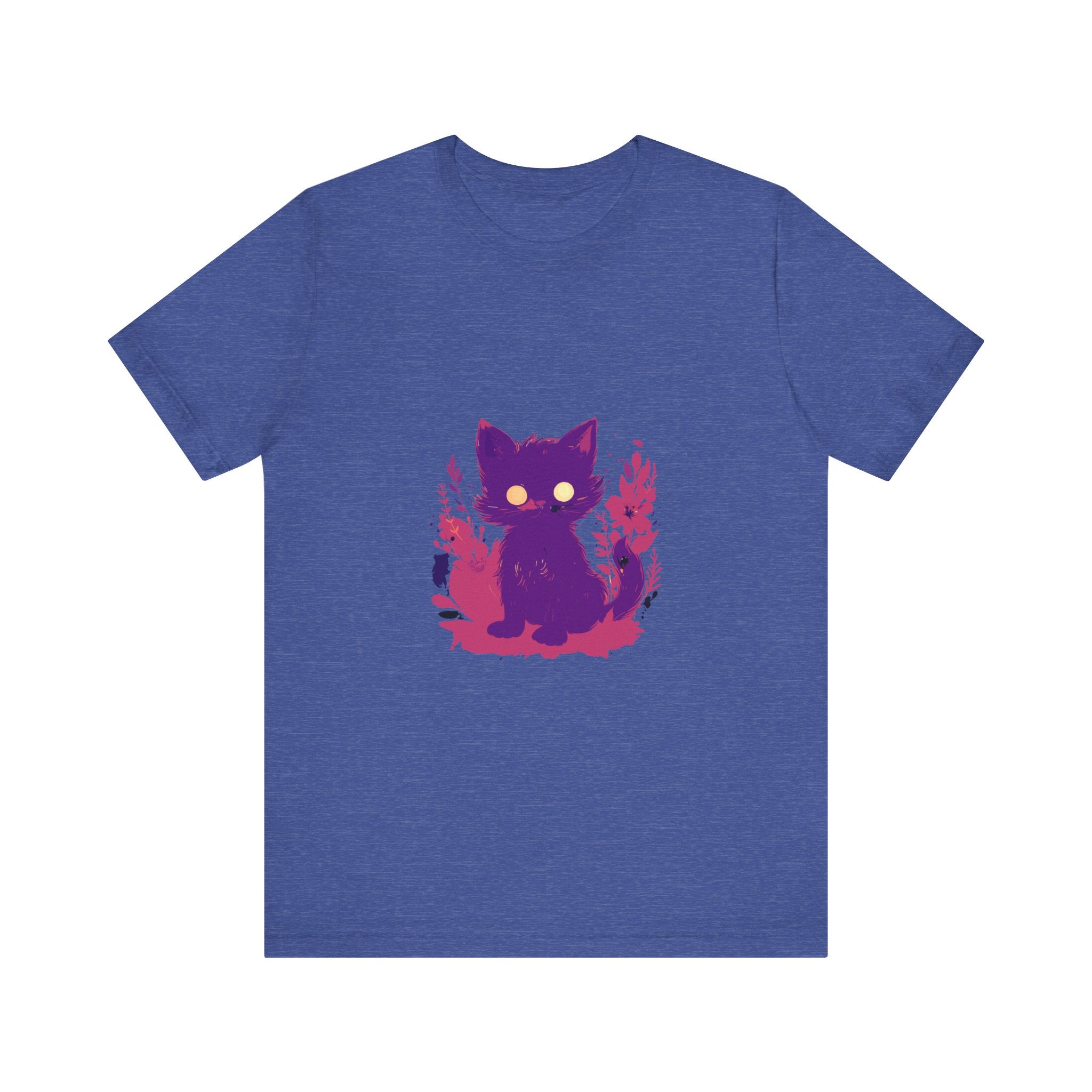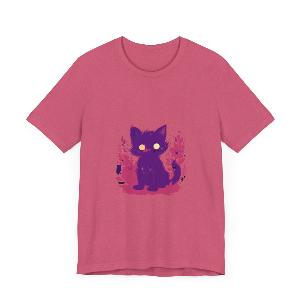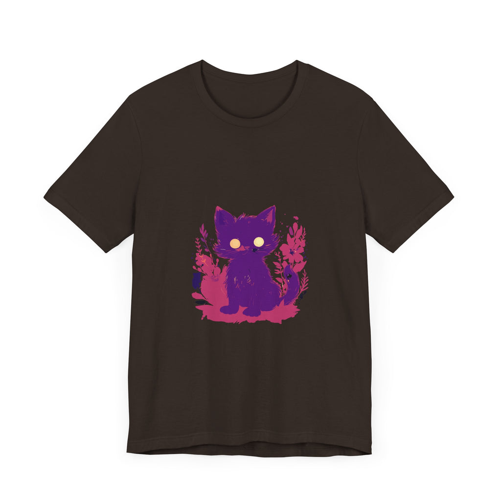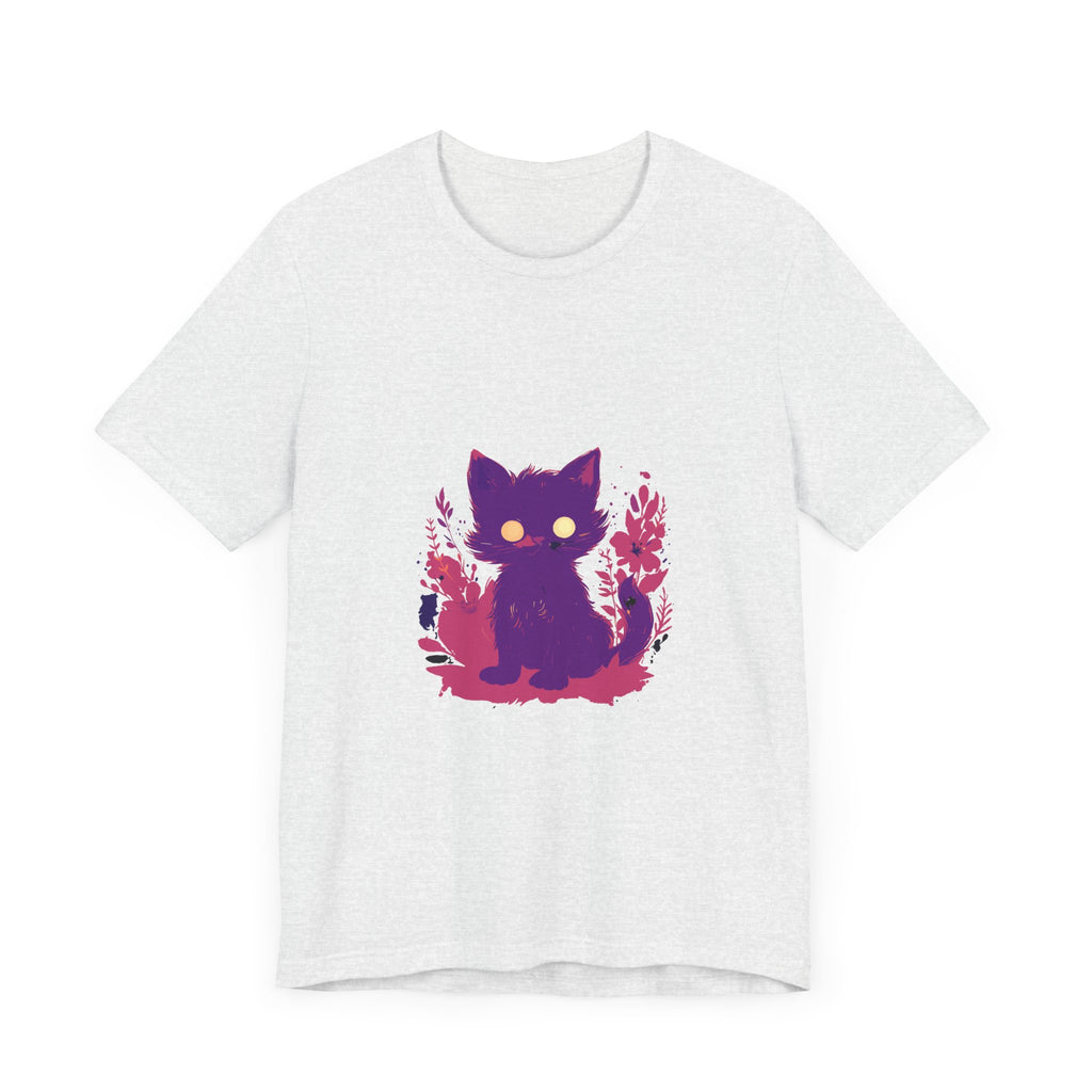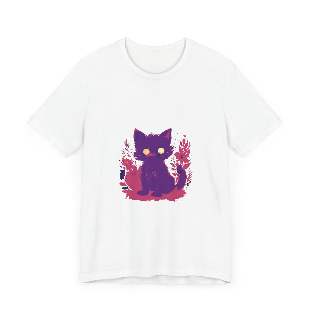 Ogni sguardo a questo delizioso capo evoca un senso di giocosa meraviglia. L'affascinante gatto viola, con i suoi grandi e intriganti occhi, ti invita in un mondo dove regna l'immaginazione. Questa t-shirt non si limita a coprire: trasforma il tuo look quotidiano in un'opera d'arte che irradia gioia e calore.