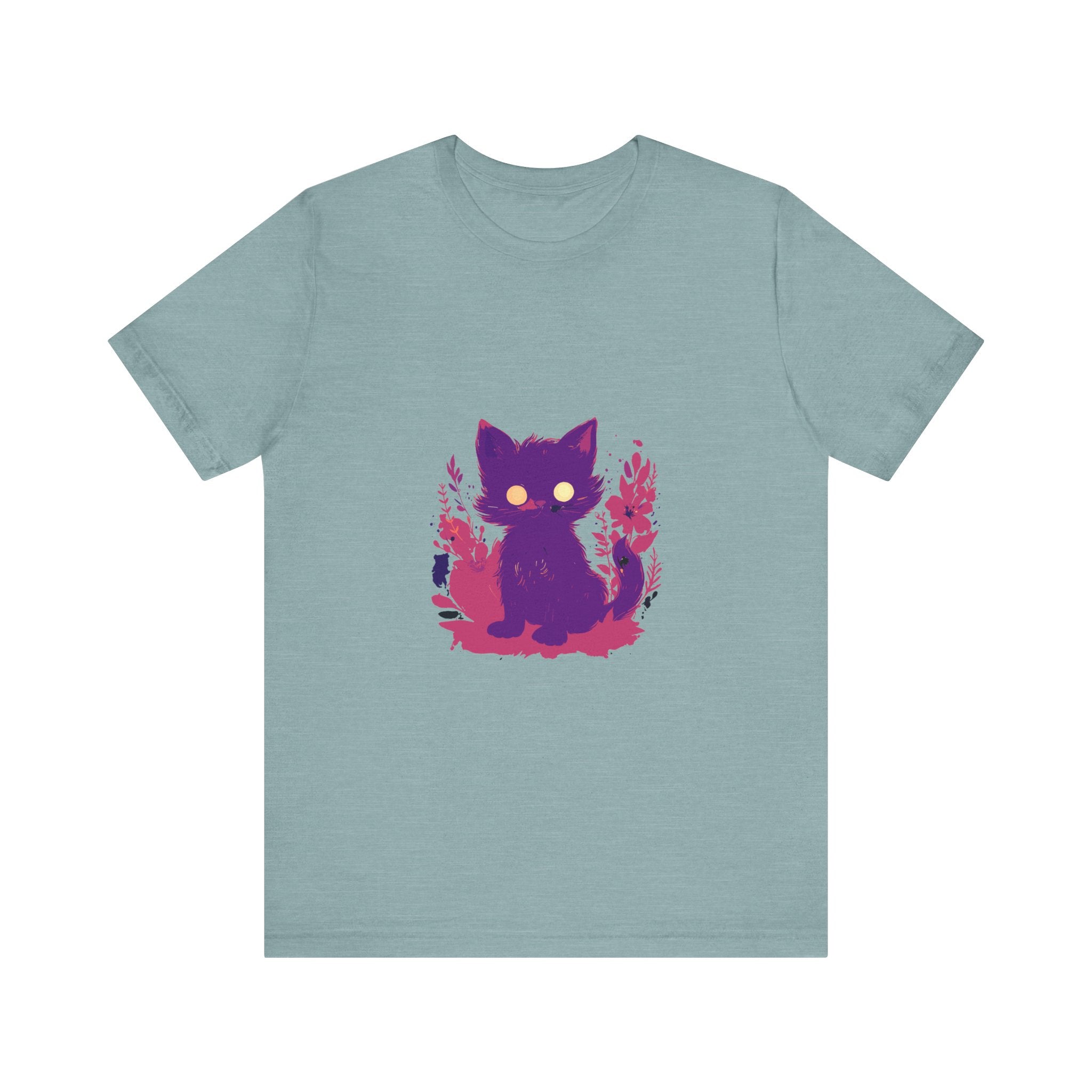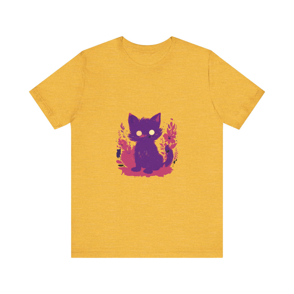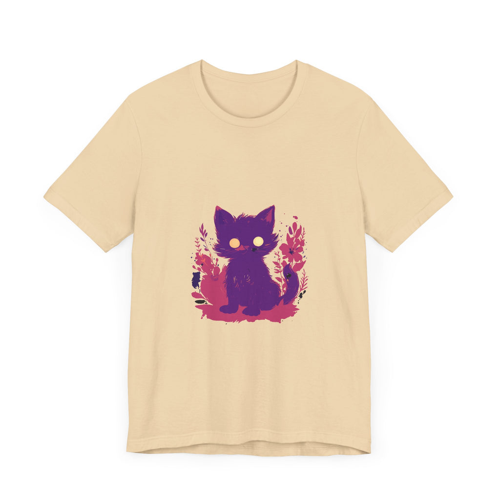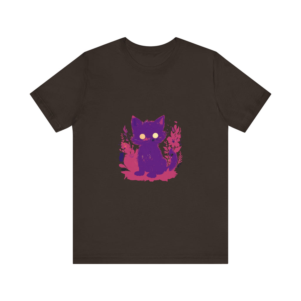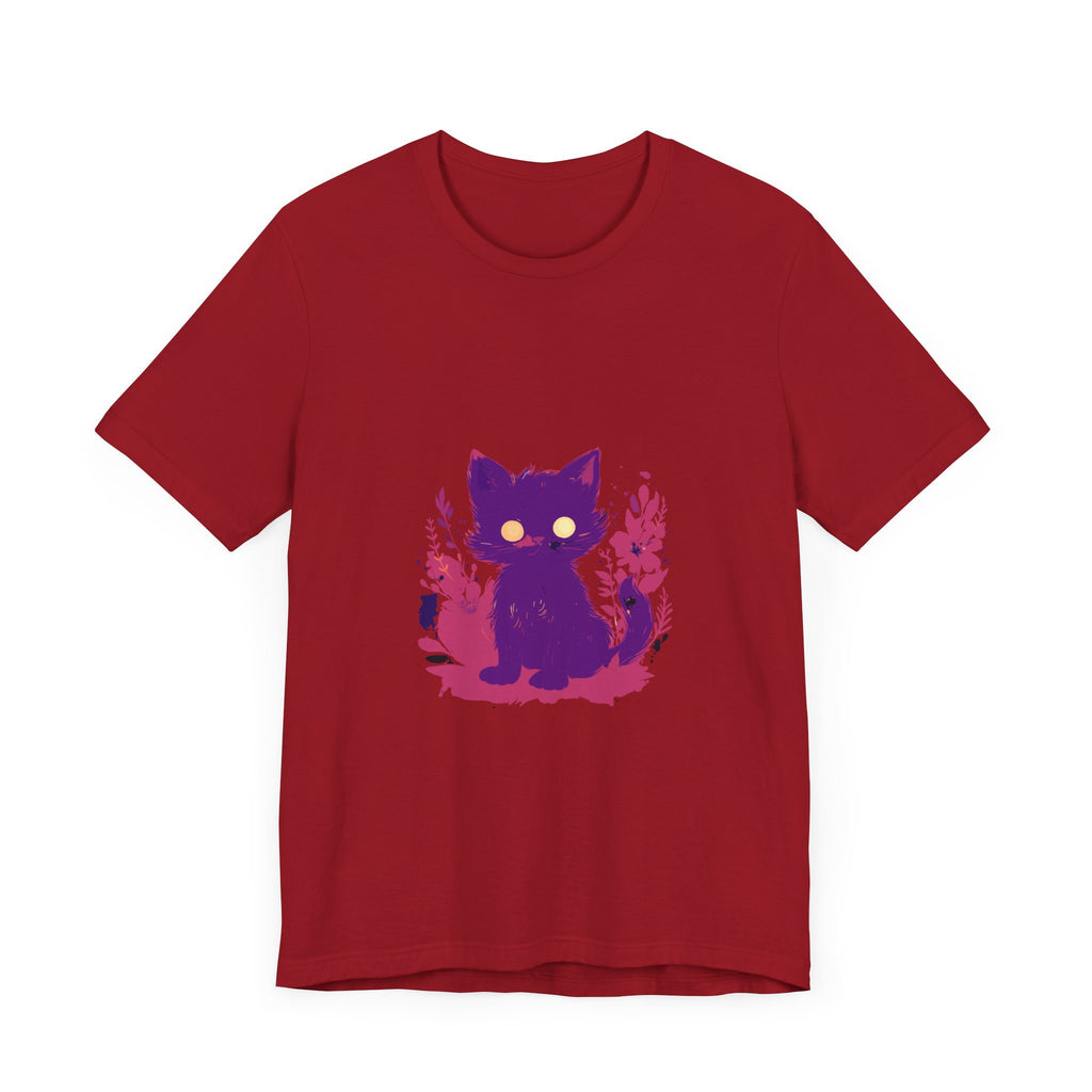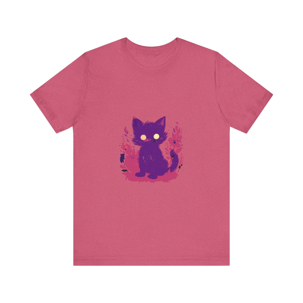 Ogni sguardo a questo delizioso capo evoca un senso di giocosa meraviglia. L'affascinante gatto viola, con i suoi grandi e intriganti occhi, ti invita in un mondo dove regna l'immaginazione. Questa t-shirt non si limita a coprire: trasforma il tuo look quotidiano in un'opera d'arte che irradia gioia e calore.