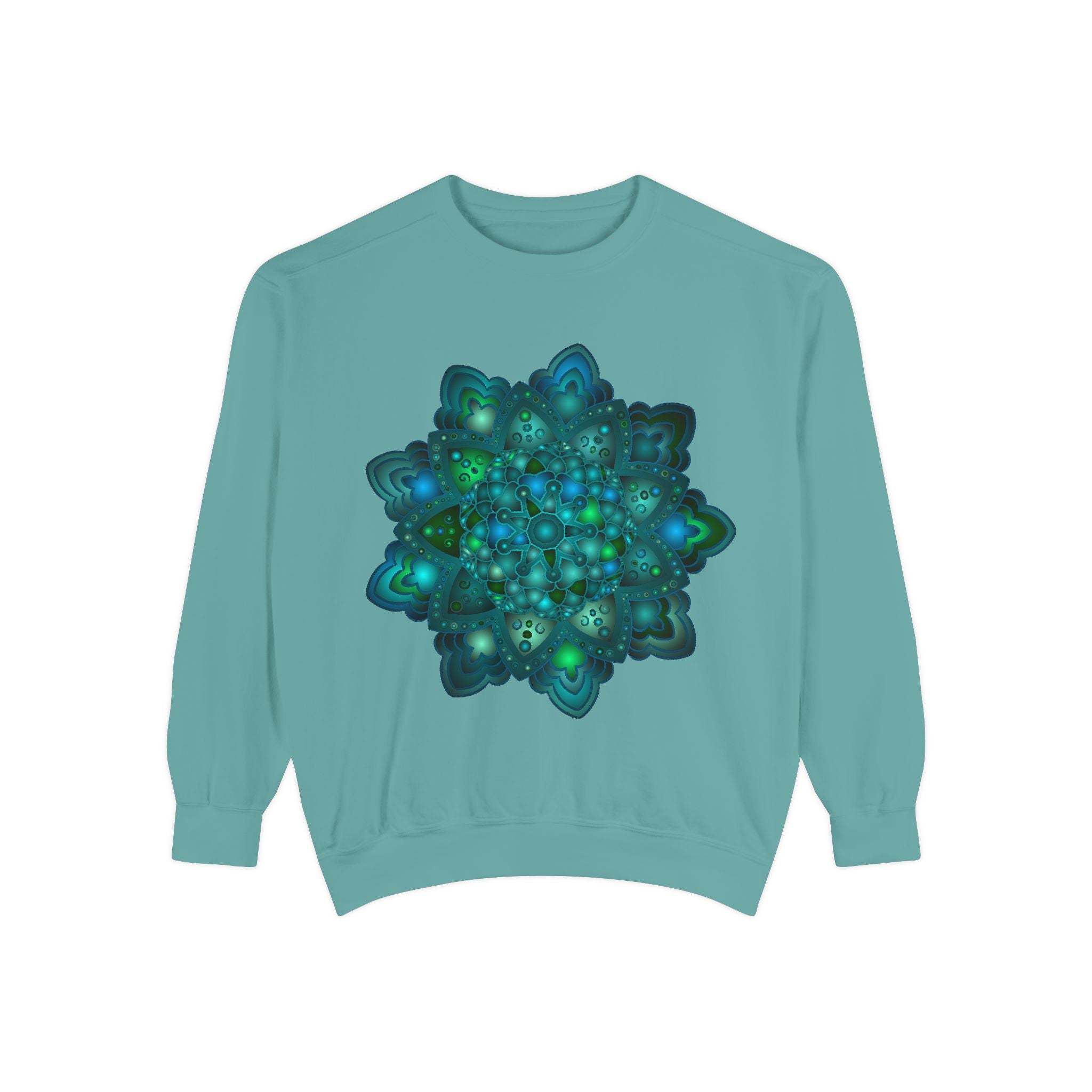 A beautiful and detailed blue and green mandala sweatshirt, perfect for adding a pop of color to your wardrobe