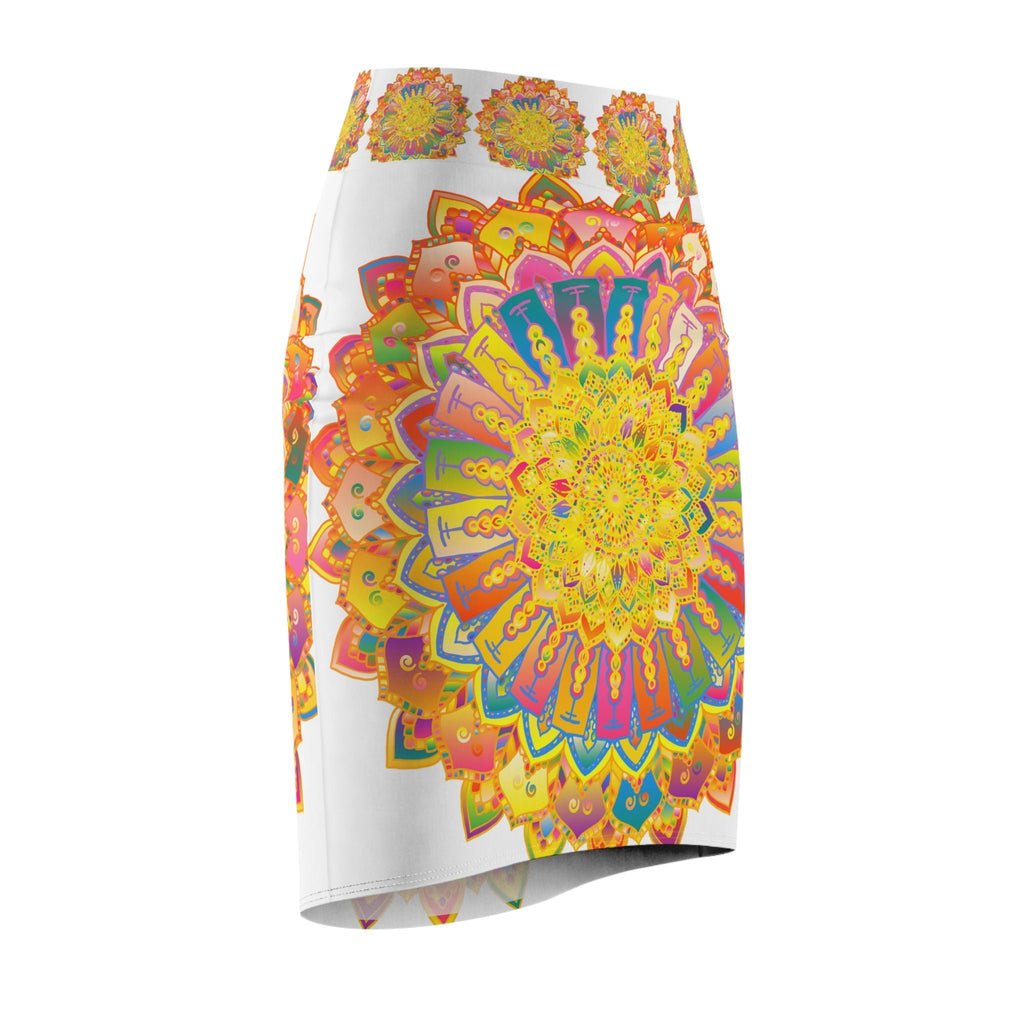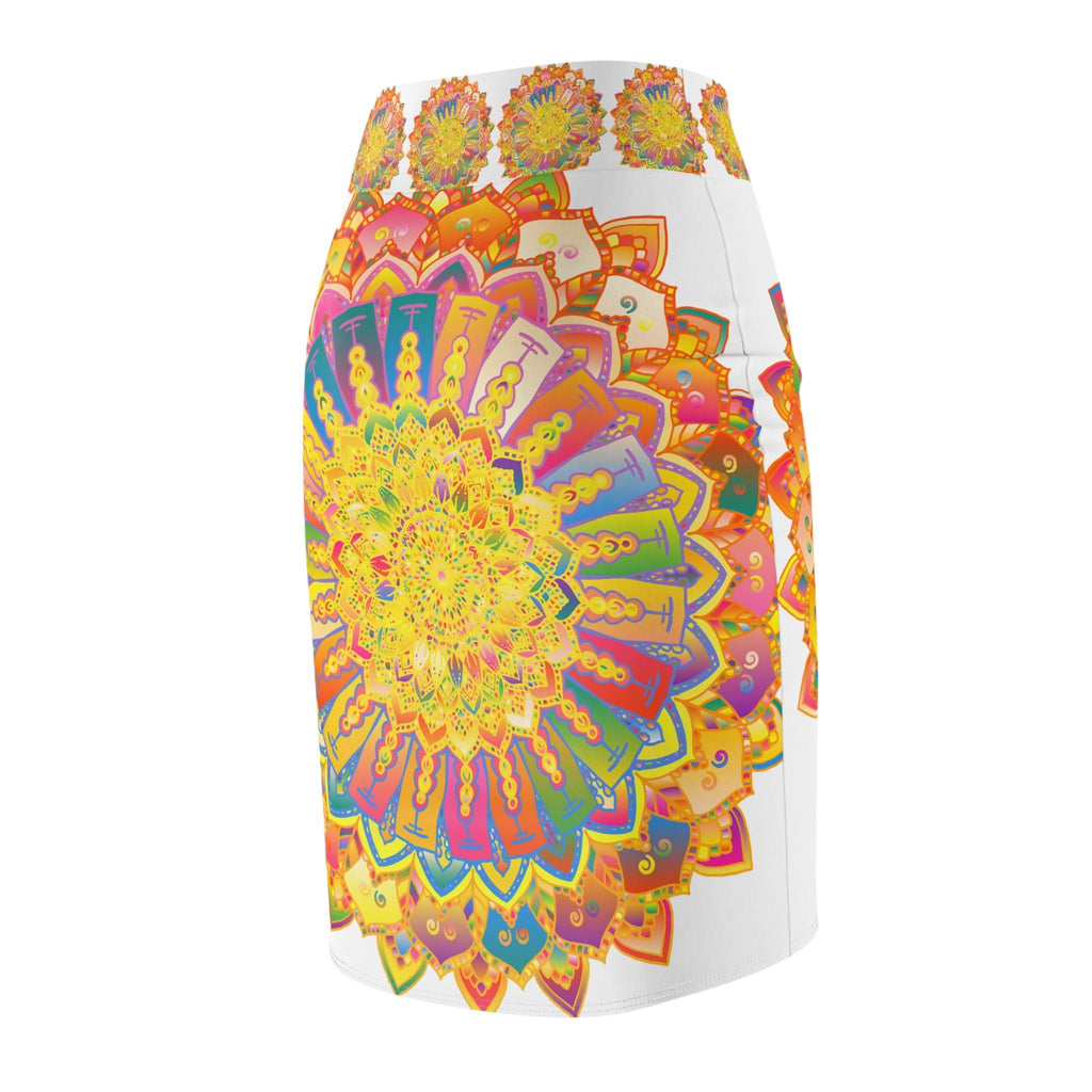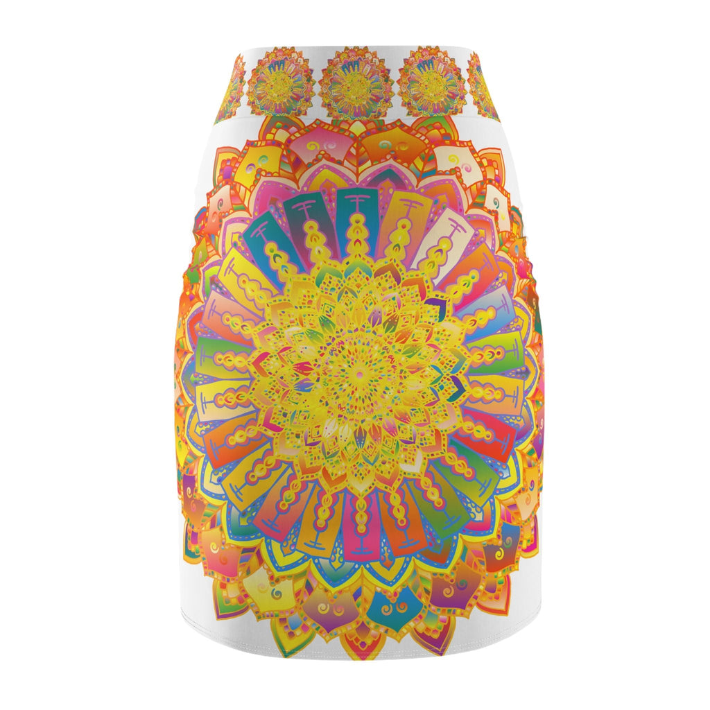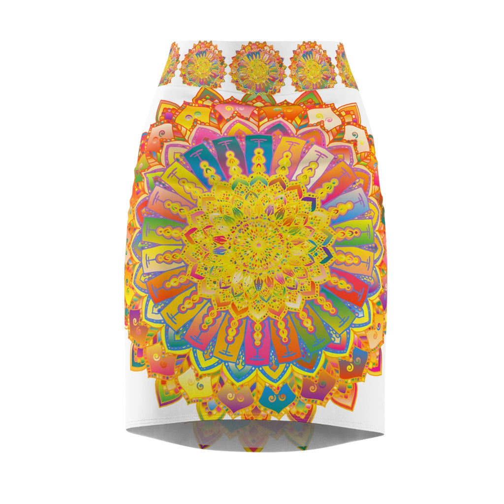 This stunning pencil skirt bursts with vibrant yellow and pink hues, featuring a mesmerizing mandala design that captures the essence of creativity and joy. Each intricate detail is a celebration of art, drawing the eye and evoking a sense of wonder. The playful interplay of colors transforms the classic silhouette into a wearable masterpiece, making it a standout piece in any wardrobe.