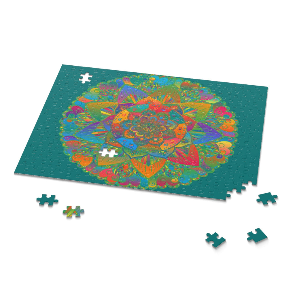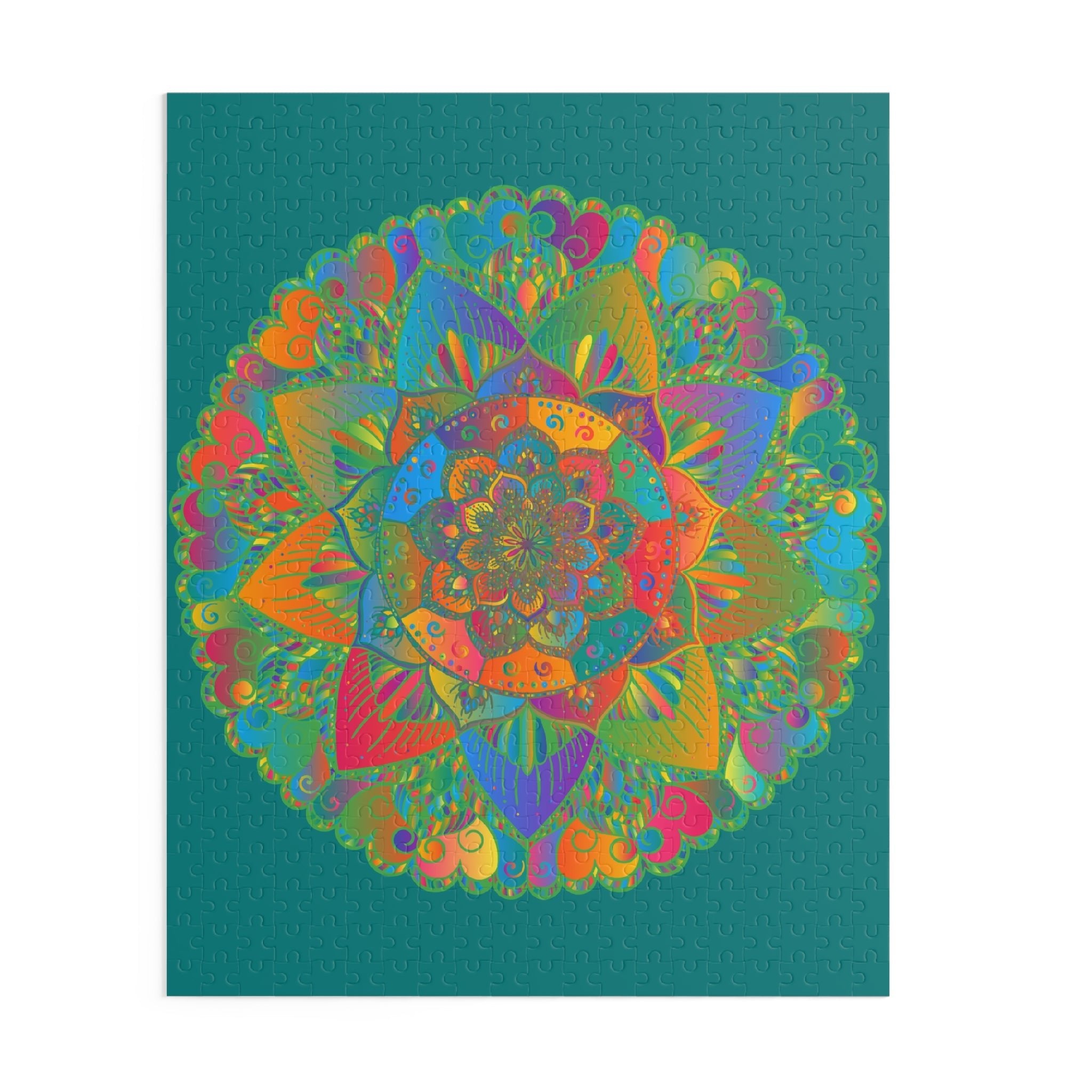 Immerse yourself in a captivating kaleidoscope of colors with this mesmerizing mandala puzzle. The intricate design bursts with psychedelic hues, showcasing a harmonious blend of geometric shapes and organic forms that dance across a rich petroleum green background. Each piece is a gateway into a vibrant world where creativity and mindfulness thrive, inviting you to lose yourself in its beauty.
