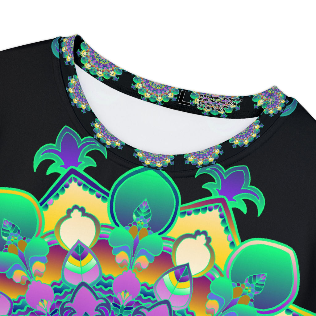 Unleash your vibrant spirit with this stunning design showcasing a mesmerizing mandala that bursts into life with bold tropical hues. This compelling artwork dances across a sleek black backdrop, inviting you to express your unique style and creativity while wearing a piece of art that inspires joy and tranquility.