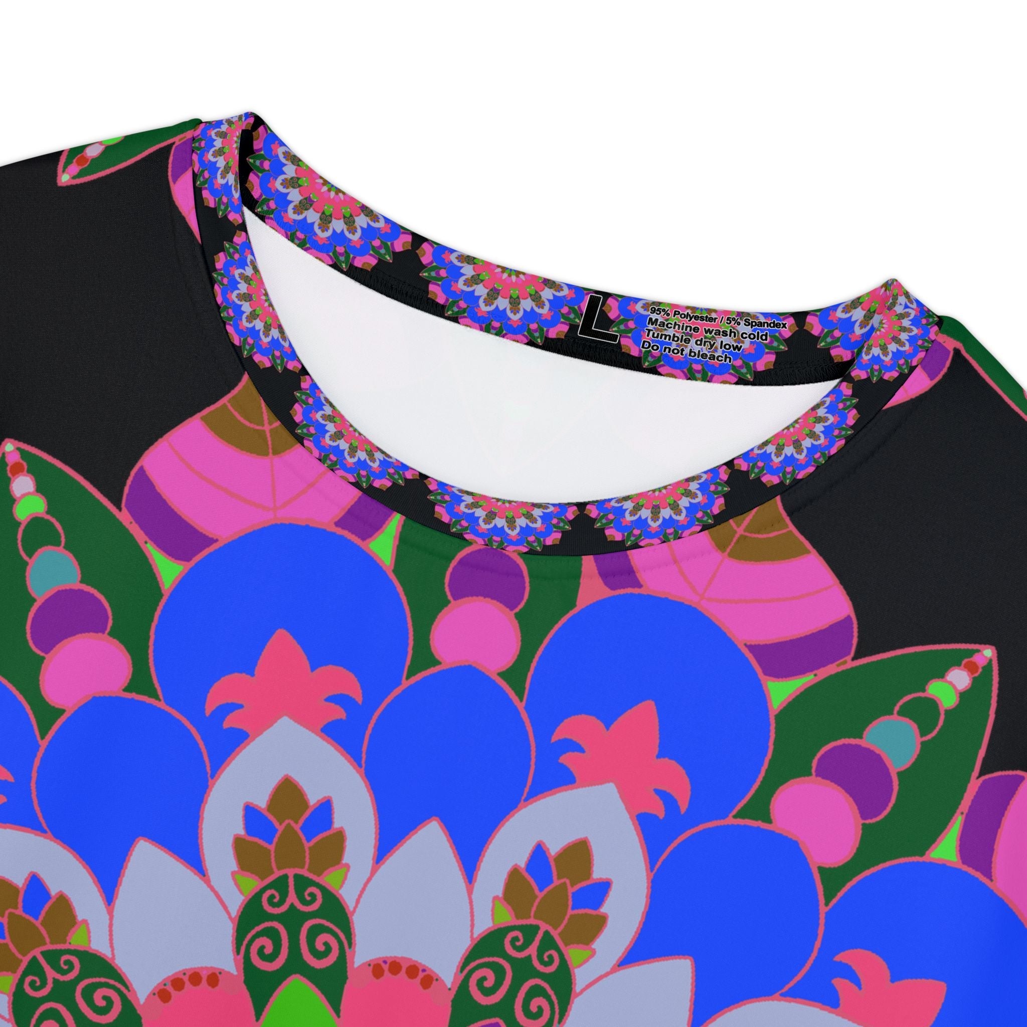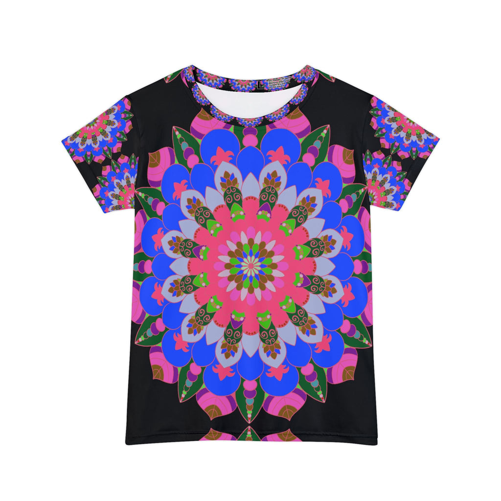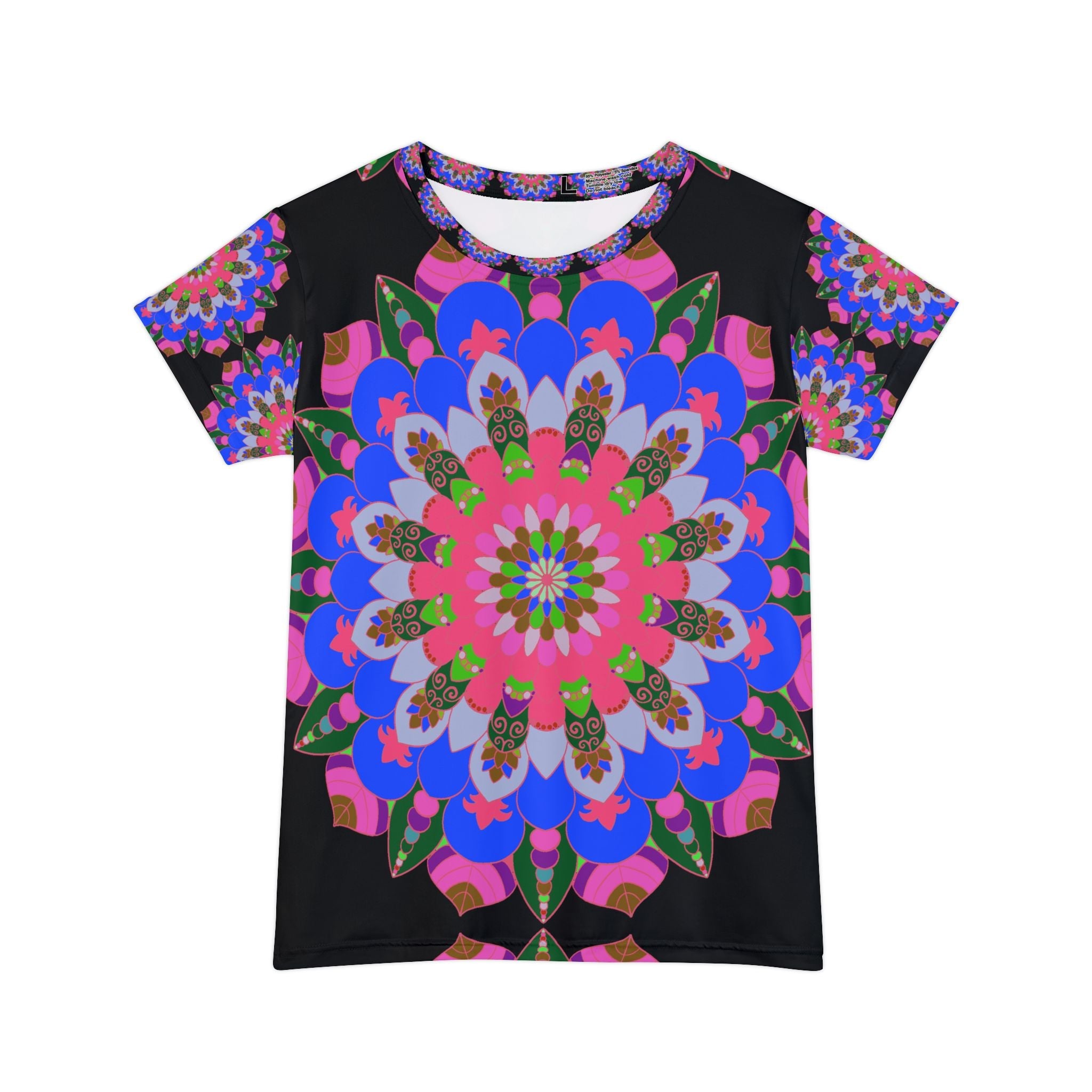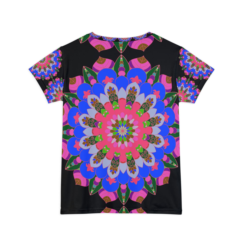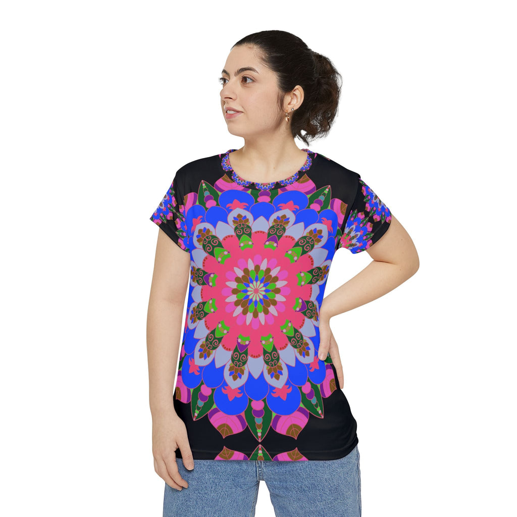 Experience the vivid allure of a radiant floral mandala, bursting with vibrant blues, pinks, and greens that dance across this stunning women's t-shirt. Each curve and petal of the design invites you into a world of artistic expression, evoking a sense of serenity and creativity. It’s not just a shirt; it’s a canvas of spirituality and individuality.