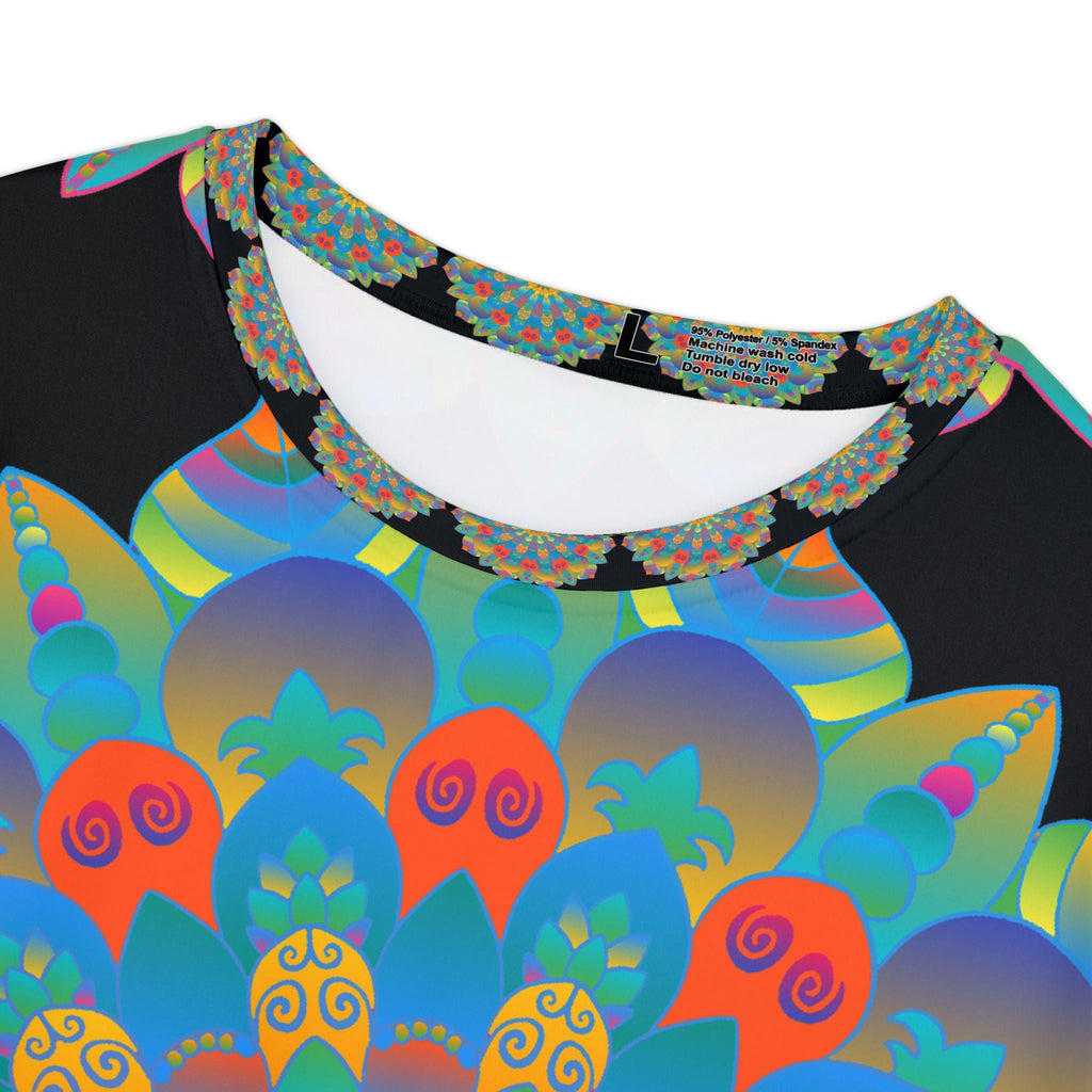 Embrace the vibrant energy of a kaleidoscopic mandala as it dances across this striking t-shirt. The intricate patterns burst with color, creating a lively tapestry that draws the eye and inspires the spirit. Each mandala is a celebration of artistic expression, inviting you to infuse your wardrobe with a piece of spirited artistry that speaks to the depths of your individuality.