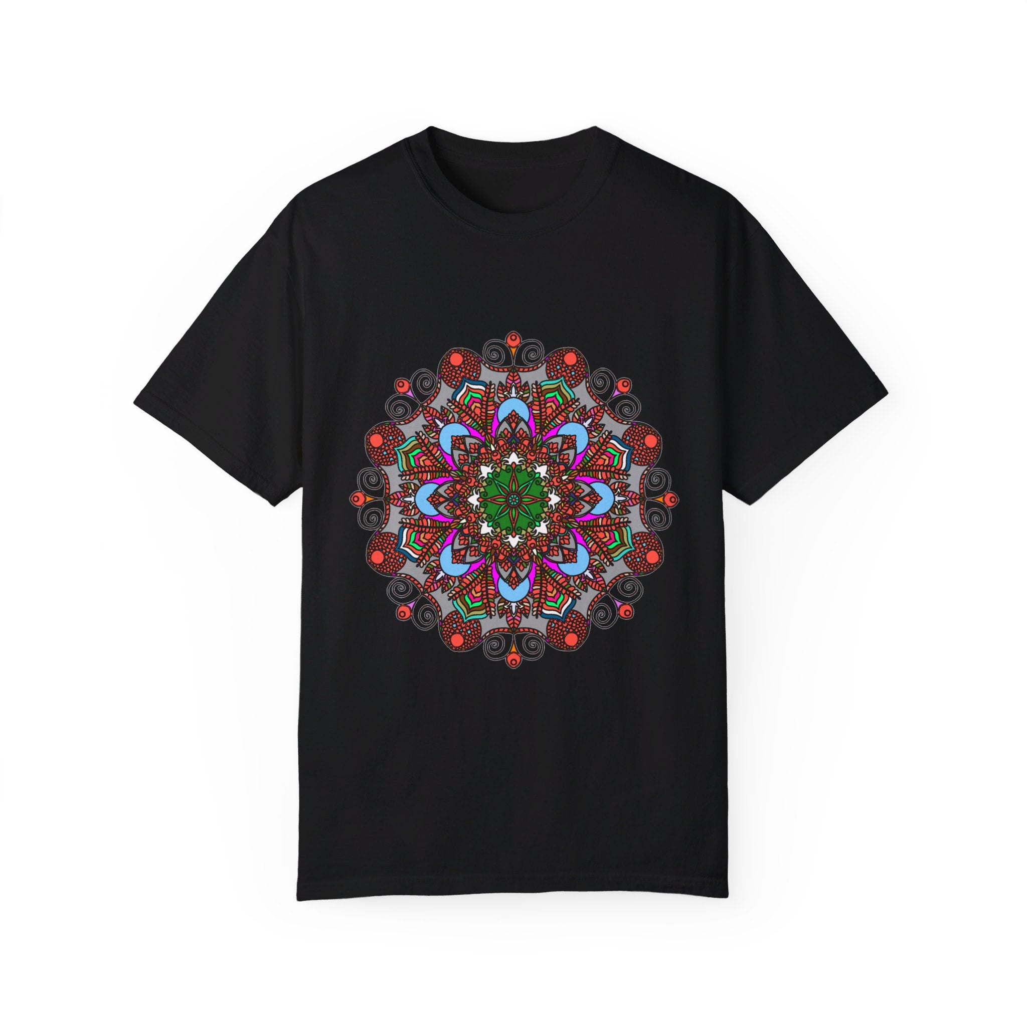 Wearing this shirt feels like stepping into a world of playful imagination and zen serenity. Each curve and line of the mandala flows smoothly, invoking a sense of tranquility while radiating vibrant energy.